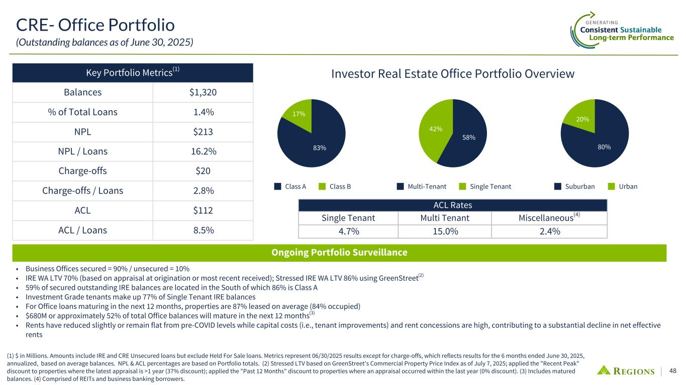 47 Commercial Real Estate (Outstanding balances as of June 30, 2025) Highly Diversified Portfolio (IRE including Unsecured CRE) (1) Excludes $5.2B of Owner-occupied CRE whose source of repayment are individual businesses, and whose credit performance resembles Commercial during periods of stress. (2) Based off 03/31/2025 Risk Based Capital estimate. Supervisory limits in the December 2006 joint regulatory issuance "Guidance on Concentrations in Commercial Real Estate Lending, Sound Risk Management Practices". Res. Homebuilders 8.2% Other 2.6% Hotel 4.7% Healthcare 7.8% Retail 8.6% Residential Land 0.4% Office 8.3% Data Center 1.7% Diversified 11.0% Industrial 14.3% Commercial Land 0.3% Self Storage 2.1% Apartments 30.0% $16.0B $ in billions % of Total Loans Unsecured CRE (incl. REITS) $ 6.9 7.1 % IRE 9.1 9.4 % Total(1) $ 16.0 16.5 % Yearly Loan Maturities 1% 15% 32% 29% 15% 6% 2% Multi-Family Office Other Real Estate Total Real Estate Matured 2025 2026 2027 2028 2029 >5years $— $1,000 $2,000 $3,000 Office 3% Data Center 4% Diversified 16% Apartments 6% Hotel 12% Industrial 26% Other 5% Self Storage 6% Retail 22% REITs within Total: $5.0B Key Portfolio Metrics • Unsecured loans for RE purposes generally have low leverage, with strong access to liquidity ◦ 62% of REIT outstanding balances are investment grade or mapped to an IG risk rating, which provides loss insulation to the overall portfolio ◦ Balance of remaining unsecured is primarily to institutional RE Funds backed by predominantly IG sponsors • Total IRE (incl unsec. CRE) to Risk Based Capital(2): 105% and Construction, Land, and Acq. & Dev. to Risk Based Capital: 20% are well below supervisory limits (300%/100%)
