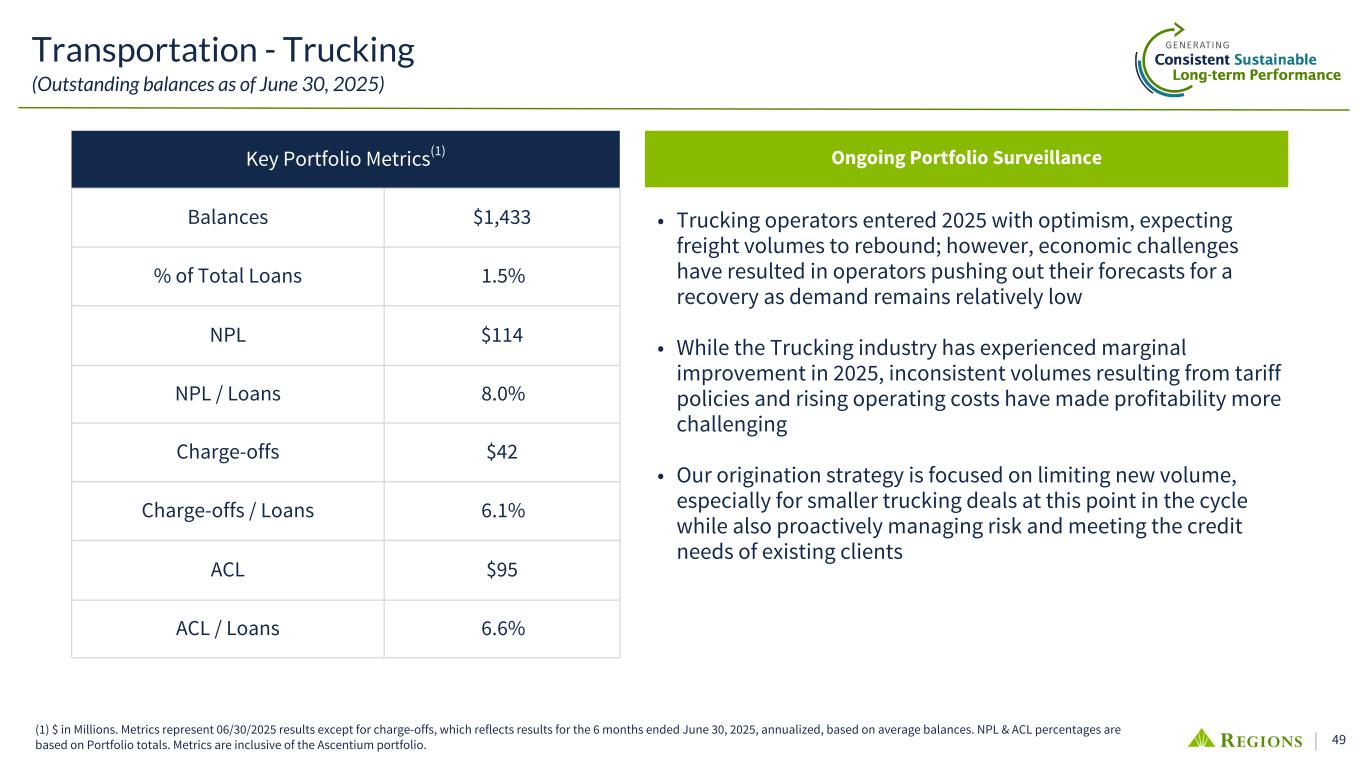 49 Transportation - Trucking (Outstanding balances as of June 30, 2025) (1) $ in Millions. Metrics represent 06/30/2025 results except for charge-offs, which reflects results for the 6 months ended June 30, 2025, annualized, based on average balances. NPL & ACL percentages are based on Portfolio totals. Metrics are inclusive of the Ascentium portfolio. Key Portfolio Metrics(1) Balances $1,433 % of Total Loans 1.5% NPL $114 NPL / Loans 8.0% Charge-offs $42 Charge-offs / Loans 6.1% ACL $95 ACL / Loans 6.6% • Trucking operators entered 2025 with optimism, expecting freight volumes to rebound; however, economic challenges have resulted in operators pushing out their forecasts for a recovery as demand remains relatively low • While the Trucking industry has experienced marginal improvement in 2025, inconsistent volumes resulting from tariff policies and rising operating costs have made profitability more challenging • Our origination strategy is focused on limiting new volume, especially for smaller trucking deals at this point in the cycle while also proactively managing risk and meeting the credit needs of existing clients Ongoing Portfolio Surveillance