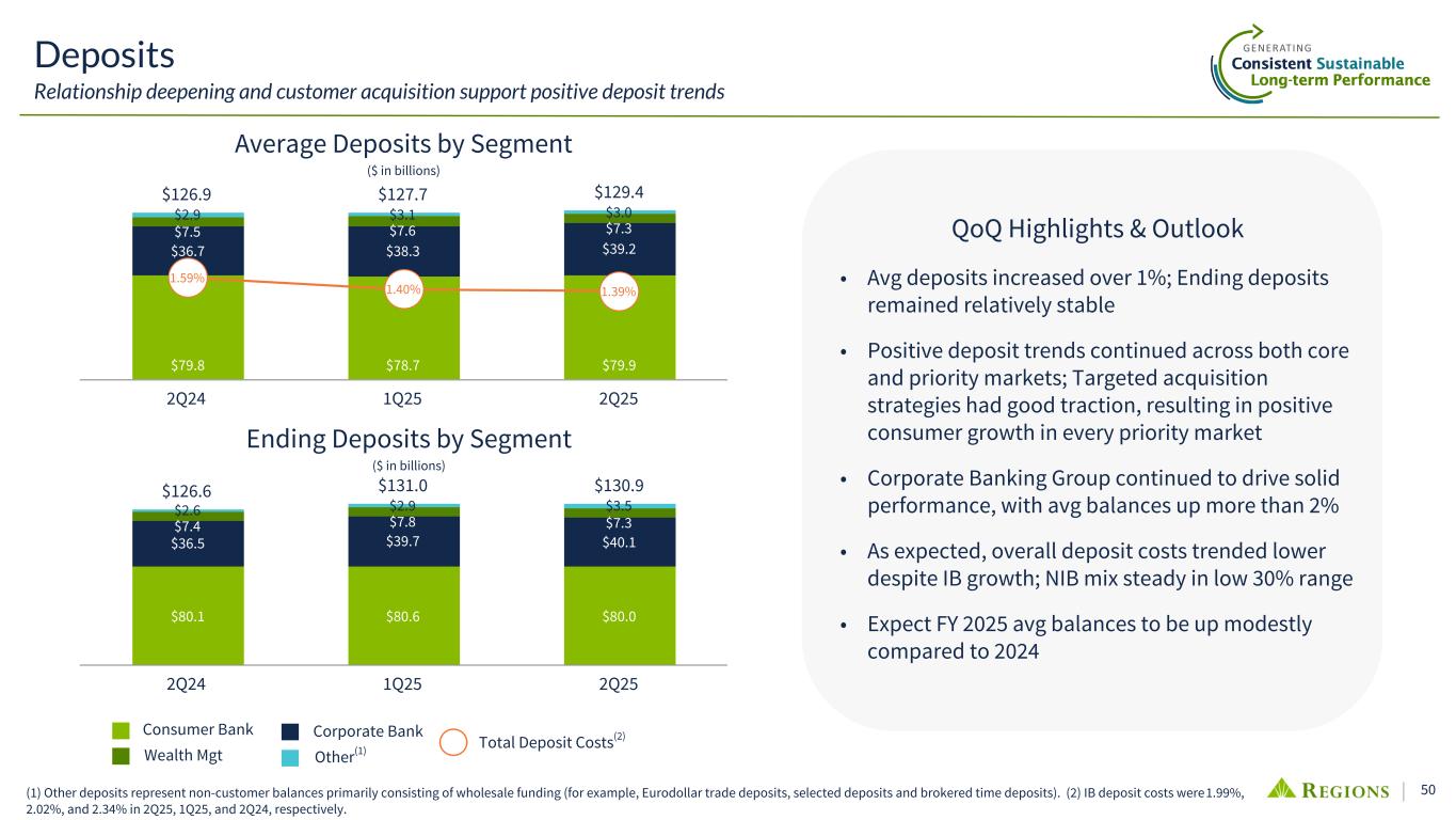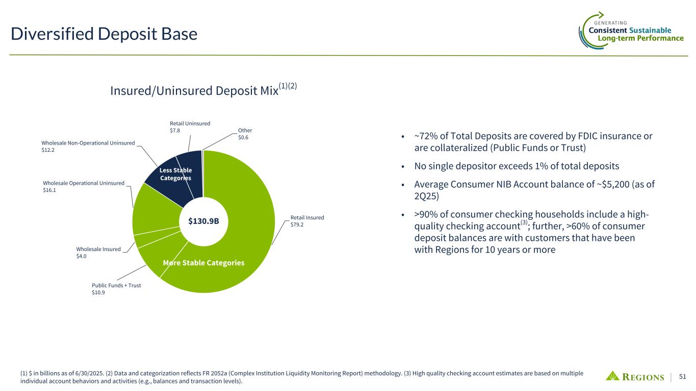 50 QoQ Highlights & Outlook • Avg deposits increased over 1%; Ending deposits remained relatively stable • Positive deposit trends continued across both core and priority markets; Targeted acquisition strategies had good traction, resulting in positive consumer growth in every priority market • Corporate Banking Group continued to drive solid performance, with avg balances up more than 2% • As expected, overall deposit costs trended lower despite IB growth; NIB mix steady in low 30% range • Expect FY 2025 avg balances to be up modestly compared to 2024 $126.6 $131.0 $130.9 $80.1 $80.6 $80.0 $36.5 $39.7 $40.1 $7.4 $7.8 $7.3 $2.6 $2.9 $3.5 2Q24 1Q25 2Q25 $126.9 $127.7 $129.4 $79.8 $78.7 $79.9 $36.7 $38.3 $39.2 $7.5 $7.6 $7.3 $2.9 $3.1 $3.0 1.59% 1.40% 1.39% 2Q24 1Q25 2Q25 (1) Other deposits represent non-customer balances primarily consisting of wholesale funding (for example, Eurodollar trade deposits, selected deposits and brokered time deposits). (2) IB deposit costs were 1.99%, 2.02%, and 2.34% in 2Q25, 1Q25, and 2Q24, respectively. Average Deposits by Segment ($ in billions) Deposits Relationship deepening and customer acquisition support positive deposit trends Wealth Mgt Other(1) Consumer Bank Corporate Bank Ending Deposits by Segment ($ in billions) Total Deposit Costs(2)