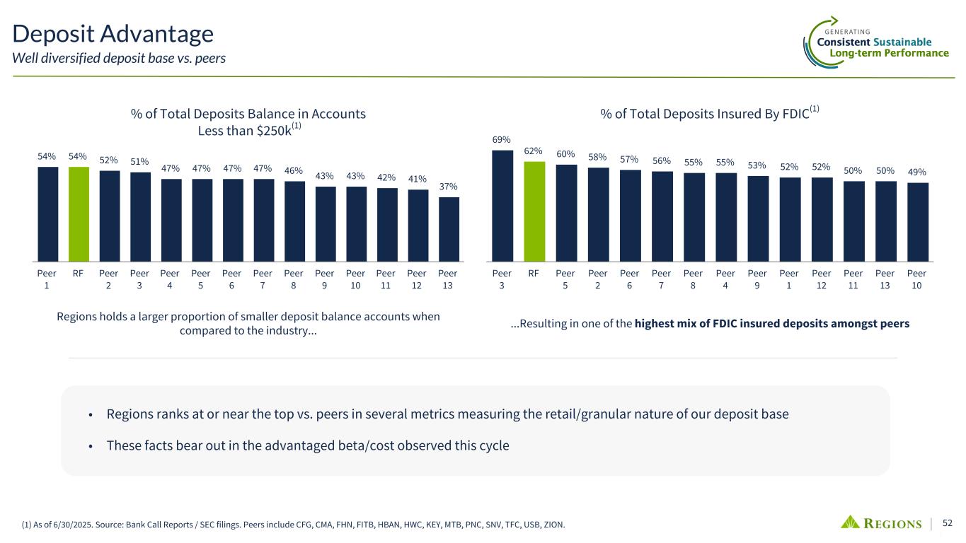 51 Diversified Deposit Base Insured/Uninsured Deposit Mix(1)(2) • ~72% of Total Deposits are covered by FDIC insurance or are collateralized (Public Funds or Trust) • No single depositor exceeds 1% of total deposits • Average Consumer NIB Account balance of ~$5,200 (as of 2Q25) • >90% of consumer checking households include a high- quality checking account(3); further, >60% of consumer deposit balances are with customers that have been with Regions for 10 years or more Retail Insured $79.2 Public Funds + Trust $10.9 Wholesale Insured $4.0 Wholesale Operational Uninsured $16.1 Wholesale Non-Operational Uninsured $12.2 Retail Uninsured $7.8 Other $0.6 Less Stable Categories (1) $ in billions as of 6/30/2025. (2) Data and categorization reflects FR 2052a (Complex Institution Liquidity Monitoring Report) methodology. (3) High quality checking account estimates are based on multiple individual account behaviors and activities (e.g., balances and transaction levels). More Stable Categories $130.9B
