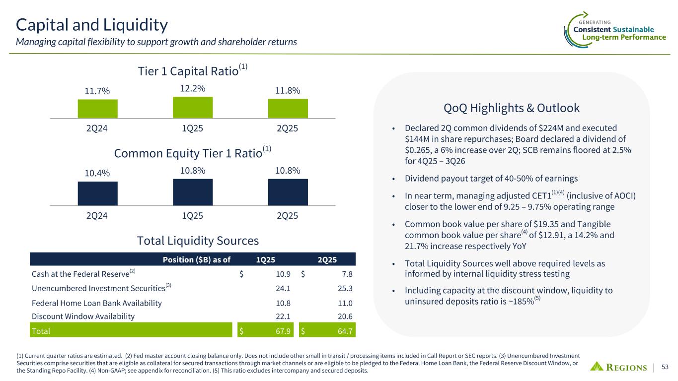 52 Deposit Advantage Well diversified deposit base vs. peers (1) As of 6/30/2025. Source: Bank Call Reports / SEC filings. Peers include CFG, CMA, FHN, FITB, HBAN, HWC, KEY, MTB, PNC, SNV, TFC, USB, ZION. ...Resulting in one of the highest mix of FDIC insured deposits amongst peers % of Total Deposits Insured By FDIC(1)% of Total Deposits Balance in Accounts Less than $250k(1) Regions holds a larger proportion of smaller deposit balance accounts when compared to the industry... 69% 62% 60% 58% 57% 56% 55% 55% 53% 52% 52% 50% 50% 49% Peer 3 RF Peer 5 Peer 2 Peer 6 Peer 7 Peer 8 Peer 4 Peer 9 Peer 1 Peer 12 Peer 11 Peer 13 Peer 10 54% 54% 52% 51% 47% 47% 47% 47% 46% 43% 43% 42% 41% 37% Peer 1 RF Peer 2 Peer 3 Peer 4 Peer 5 Peer 6 Peer 7 Peer 8 Peer 9 Peer 10 Peer 11 Peer 12 Peer 13 • Regions ranks at or near the top vs. peers in several metrics measuring the retail/granular nature of our deposit base • These facts bear out in the advantaged beta/cost observed this cycle