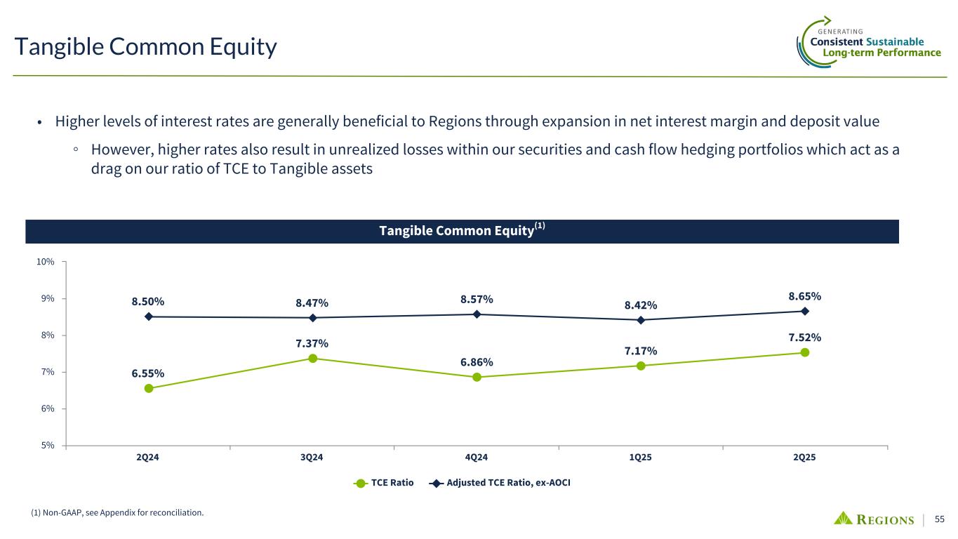 54 Common Equity Tier 1 10.6% 10.8% 10.8% 10.8% 9.1% 8.8% 9.1% 9.3% Reported CET1 Ratio Adjusted CET1 Inclusive of AOCI Operating Range 3Q24 4Q24 1Q25 2Q25 CET1 Under Basel III Endgame (B3E) B3E Update • B3E has yet to be finalized but expect AOCI to be included in Regulatory Capital • CET1 inclusive of AOCI increased linked-quarter given lower interest rates as well as solid capital accretion and volatility management activities in the quarter ◦ CET1 adjusted to include AOCI at 6/30 improved 10 bps to an estimated 9.3%(2) ◦ In the near term, expect to manage CET1 inclusive of AOCI closer to the lower end of our 9.25% - 9.75% Operating Range; Creates meaningful flexibility Volatility Management • Reclassified Available-for-Sale securities into Held-to-Maturity to reduce volatility; ~18% of portfolio in HTM at quarter-end ◦ $1.0B transfer in 1Q25 and another $1.0B in early 2Q25 ($4.5B in 2H24)(3) ◦ Added $0.8B AFS swaps in 1Q25 and another $0.7B in 2Q25 ($2.0B in 2H24) • Over time, we will consider additional actions to further manage AOCI volatility: ◦ Held-to-Maturity ◦ Derivative Hedging ◦ Asset Selection (1) (1) Current quarter ratio is estimated. (2) Non-GAAP; see appendix for reconciliation. (3) Transferred another $1B of AFS to HTM in early April 2025 bringing current mix of HTM / total securities to ~20%. (2) Operating Range | 9.25% - 9.75%