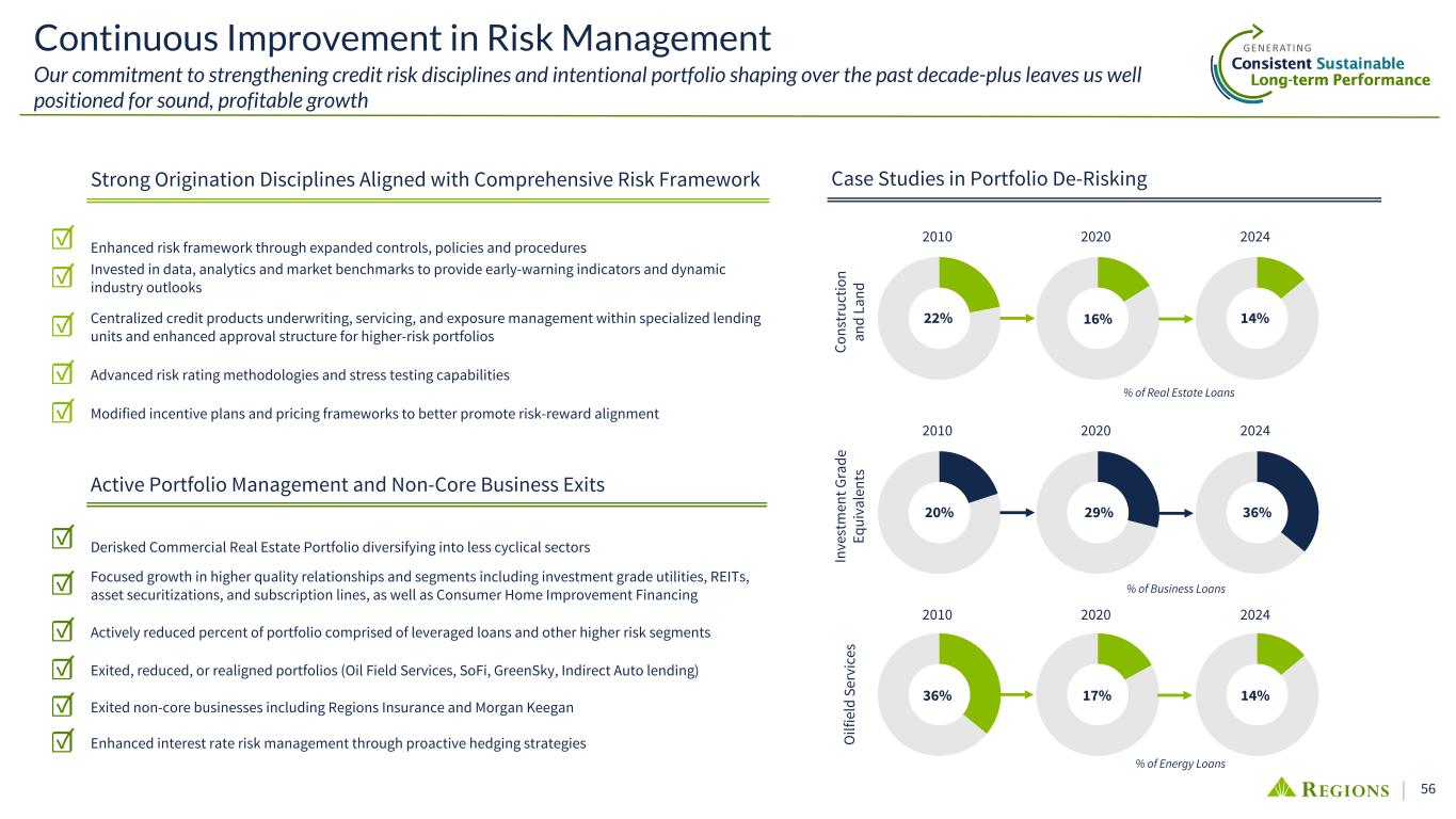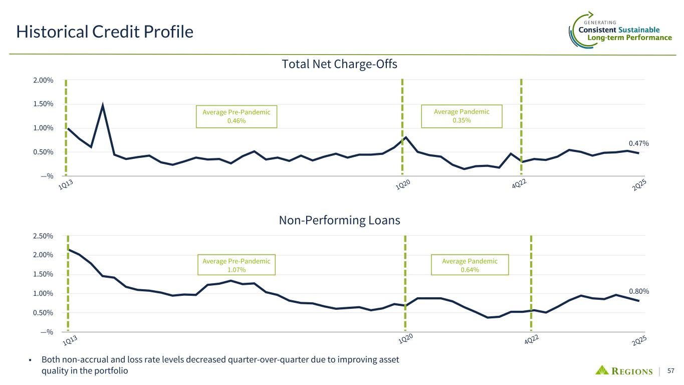 56 Continuous Improvement in Risk Management Our commitment to strengthening credit risk disciplines and intentional portfolio shaping over the past decade-plus leaves us well positioned for sound, profitable growth Strong Origination Disciplines Aligned with Comprehensive Risk Framework ☑ Enhanced risk framework through expanded controls, policies and procedures ☑ Invested in data, analytics and market benchmarks to provide early-warning indicators and dynamic industry outlooks ☑ Centralized credit products underwriting, servicing, and exposure management within specialized lending units and enhanced approval structure for higher-risk portfolios ☑ Advanced risk rating methodologies and stress testing capabilities ☑ Modified incentive plans and pricing frameworks to better promote risk-reward alignment Active Portfolio Management and Non-Core Business Exits ☑ Derisked Commercial Real Estate Portfolio diversifying into less cyclical sectors ☑ Focused growth in higher quality relationships and segments including investment grade utilities, REITs, asset securitizations, and subscription lines, as well as Consumer Home Improvement Financing ☑ Actively reduced percent of portfolio comprised of leveraged loans and other higher risk segments ☑ Exited, reduced, or realigned portfolios (Oil Field Services, SoFi, GreenSky, Indirect Auto lending) ☑ Exited non-core businesses including Regions Insurance and Morgan Keegan ☑ Enhanced interest rate risk management through proactive hedging strategies Case Studies in Portfolio De-Risking 22% 16% 14% Co ns tr uc tio n an d La nd 2010 2020 2024 2010 2020 2024 In ve st m en t G ra de Eq ui va le nt s O ilf ie ld S er vi ce s 20% 29% 36% 36% 17% 14% % of Real Estate Loans % of Business Loans % of Energy Loans 2010 2020 2024
