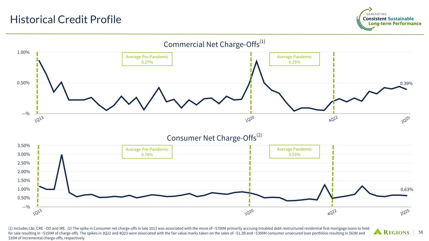 57 0.80% —% 0.50% 1.00% 1.50% 2.00% 2.50% 0.47% —% 0.50% 1.00% 1.50% 2.00% Historical Credit Profile Non-Performing Loans Total Net Charge-Offs 1Q20 2Q254Q221Q20 4Q22 2Q25 • Both non-accrual and loss rate levels decreased quarter-over-quarter due to improving asset quality in the portfolio Average Pre-Pandemic 0.46% Average Pandemic 0.35% Average Pre-Pandemic 1.07% Average Pandemic 0.64% 1Q13 1Q13