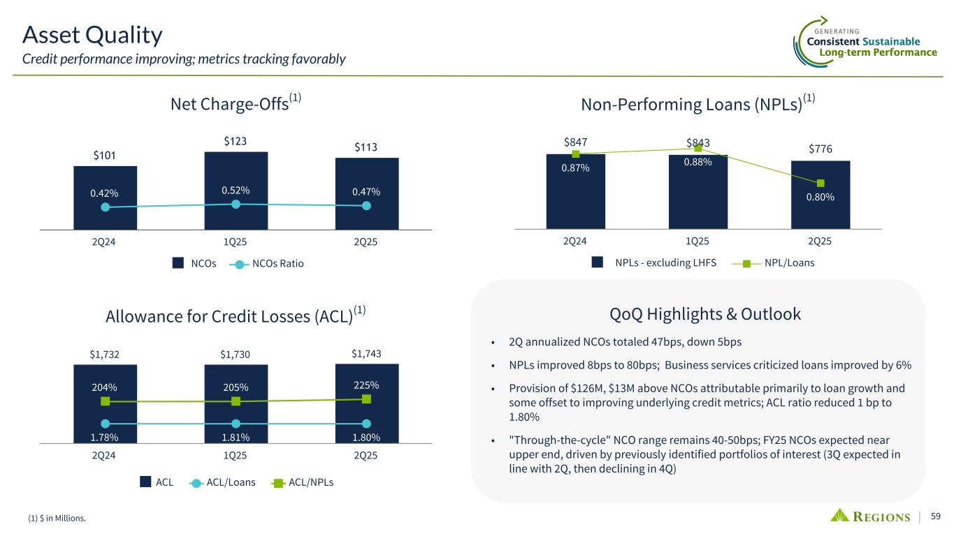 58 0.63% —% 0.50% 1.00% 1.50% 2.00% 2.50% 3.00% 3.50% 0.39% —% 0.50% 1.00% Consumer Net Charge-Offs(2) Commercial Net Charge-Offs(1) 1Q20 2Q25 4Q22 1Q20 4Q22 2Q25 (1) Includes C&I, CRE - OO and IRE. (2) The spike in Consumer net charge-offs in late 2013 was associated with the move of ~$700M primarily accruing troubled debt restructured residential first mortgage loans to held for sale resulting in ~$150M of charge-offs. The spikes in 3Q22 and 4Q23 were associated with the fair value marks taken on the sales of ~$1.2B and ~$300M consumer unsecured loan portfolios resulting in $63M and $35M of incremental charge-offs, respectively. Average Pre-Pandemic 0.27% Average Pandemic 0.25% Average Pre-Pandemic 0.78% Average Pandemic 0.53% 1Q13 1Q13 Historical Credit Profile