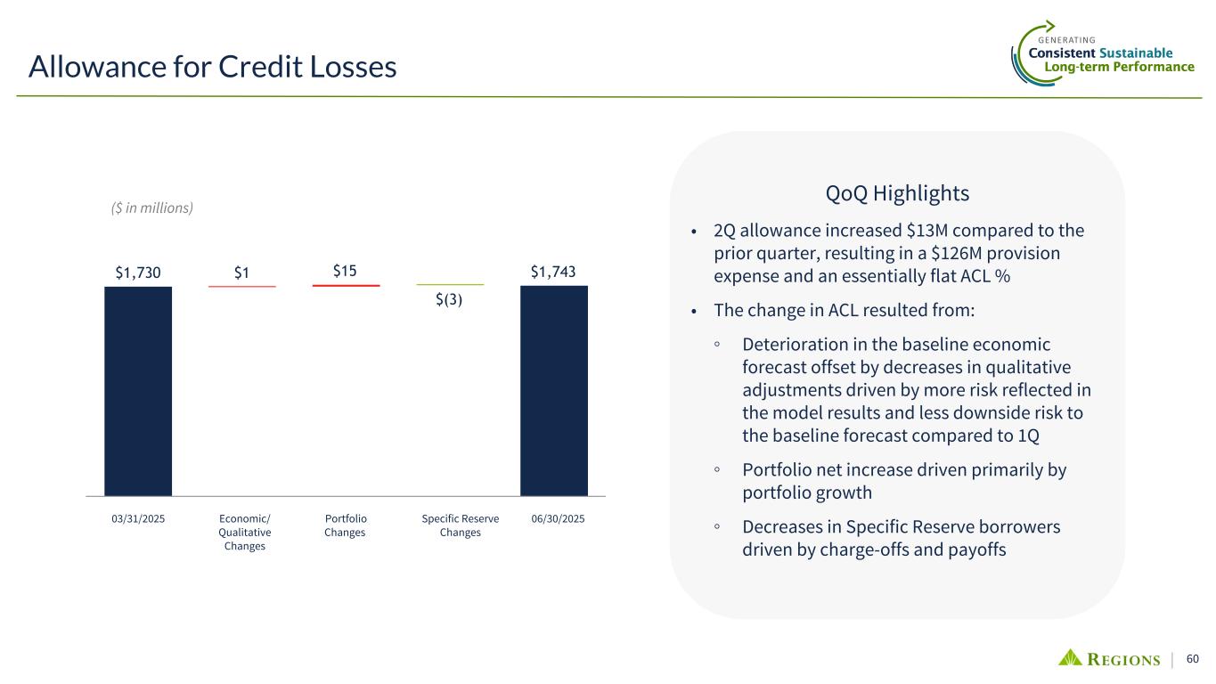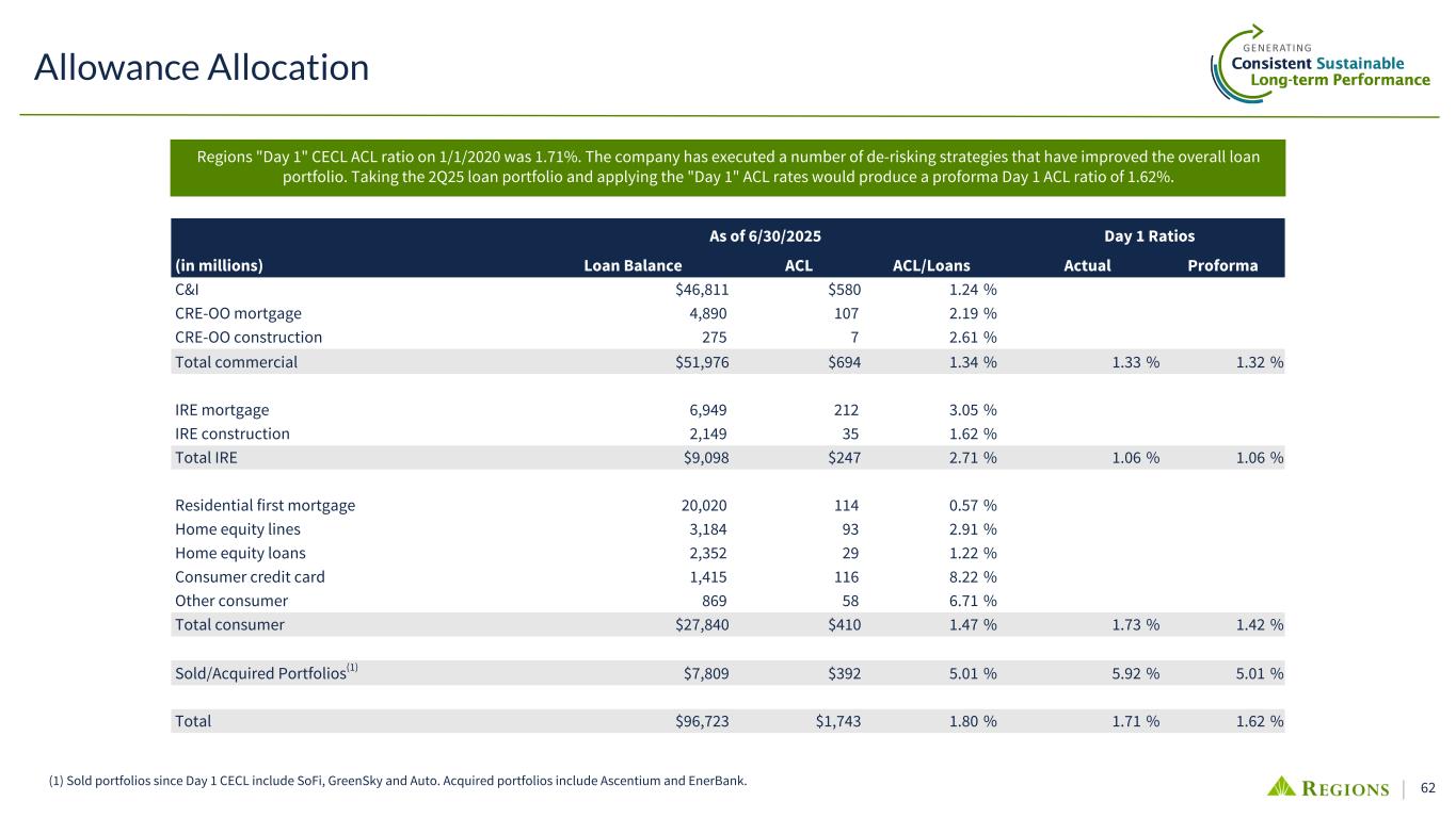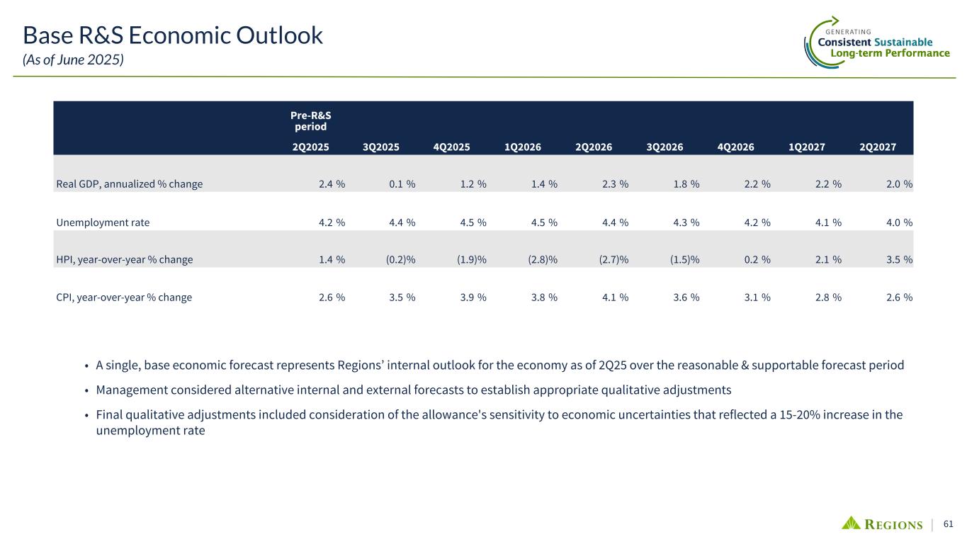 61 Pre-R&S period 2Q2025 3Q2025 4Q2025 1Q2026 2Q2026 3Q2026 4Q2026 1Q2027 2Q2027 Real GDP, annualized % change 2.4 % 0.1 % 1.2 % 1.4 % 2.3 % 1.8 % 2.2 % 2.2 % 2.0 % Unemployment rate 4.2 % 4.4 % 4.5 % 4.5 % 4.4 % 4.3 % 4.2 % 4.1 % 4.0 % HPI, year-over-year % change 1.4 % (0.2) % (1.9) % (2.8) % (2.7) % (1.5) % 0.2 % 2.1 % 3.5 % CPI, year-over-year % change 2.6 % 3.5 % 3.9 % 3.8 % 4.1 % 3.6 % 3.1 % 2.8 % 2.6 % Base R&S Economic Outlook (As of June 2025) • A single, base economic forecast represents Regions’ internal outlook for the economy as of 2Q25 over the reasonable & supportable forecast period • Management considered alternative internal and external forecasts to establish appropriate qualitative adjustments • Final qualitative adjustments included consideration of the allowance's sensitivity to economic uncertainties that reflected a 15-20% increase in the unemployment rate
