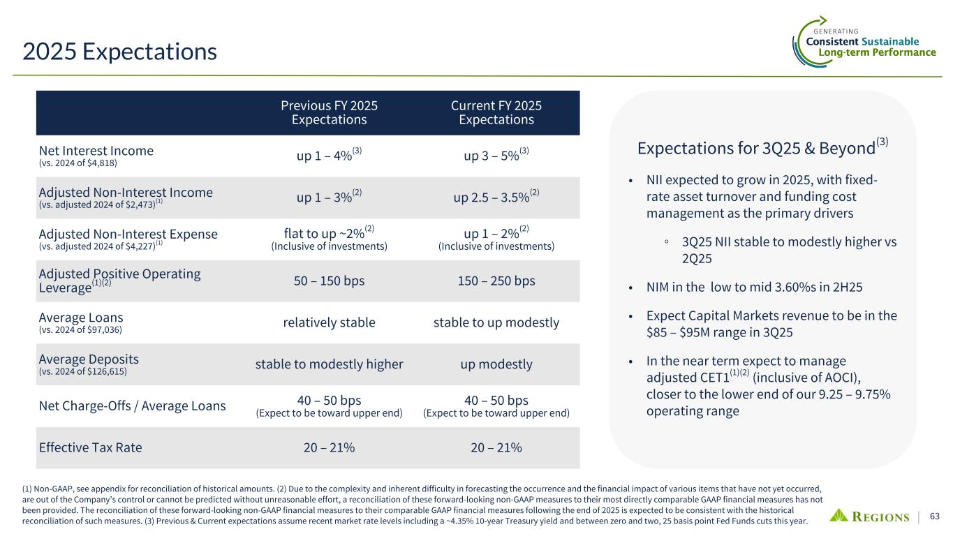 63 Expectations for 3Q25 & Beyond(3) • NII expected to grow in 2025, with fixed- rate asset turnover and funding cost management as the primary drivers ◦ 3Q25 NII stable to modestly higher vs 2Q25 • NIM in the low to mid 3.60%s in 2H25 • Expect Capital Markets revenue to be in the $85 – $95M range in 3Q25 • In the near term expect to manage adjusted CET1(1)(2) (inclusive of AOCI), closer to the lower end of our 9.25 – 9.75% operating range 2025 Expectations (1) Non-GAAP, see appendix for reconciliation of historical amounts. (2) Due to the complexity and inherent difficulty in forecasting the occurrence and the financial impact of various items that have not yet occurred, are out of the Company’s control or cannot be predicted without unreasonable effort, a reconciliation of these forward-looking non-GAAP measures to their most directly comparable GAAP financial measures has not been provided. The reconciliation of these forward-looking non-GAAP financial measures to their comparable GAAP financial measures following the end of 2025 is expected to be consistent with the historical reconciliation of such measures. (3) Previous & Current expectations assume recent market rate levels including a ~4.35% 10-year Treasury yield and between zero and two, 25 basis point Fed Funds cuts this year. Previous FY 2025 Expectations Current FY 2025 Expectations Net Interest Income (vs. 2024 of $4,818) up 1 – 4%(3) up 3 – 5%(3) Adjusted Non-Interest Income (vs. adjusted 2024 of $2,473)(1) up 1 – 3%(2) up 2.5 – 3.5%(2) Adjusted Non-Interest Expense (vs. adjusted 2024 of $4,227)(1) flat to up ~2%(2) (Inclusive of investments) up 1 – 2%(2) (Inclusive of investments) Adjusted Positive Operating Leverage(1)(2) 50 – 150 bps 150 – 250 bps Average Loans (vs. 2024 of $97,036) relatively stable stable to up modestly Average Deposits (vs. 2024 of $126,615) stable to modestly higher up modestly Net Charge-Offs / Average Loans 40 – 50 bps (Expect to be toward upper end) 40 – 50 bps (Expect to be toward upper end) Effective Tax Rate 20 – 21% 20 – 21%