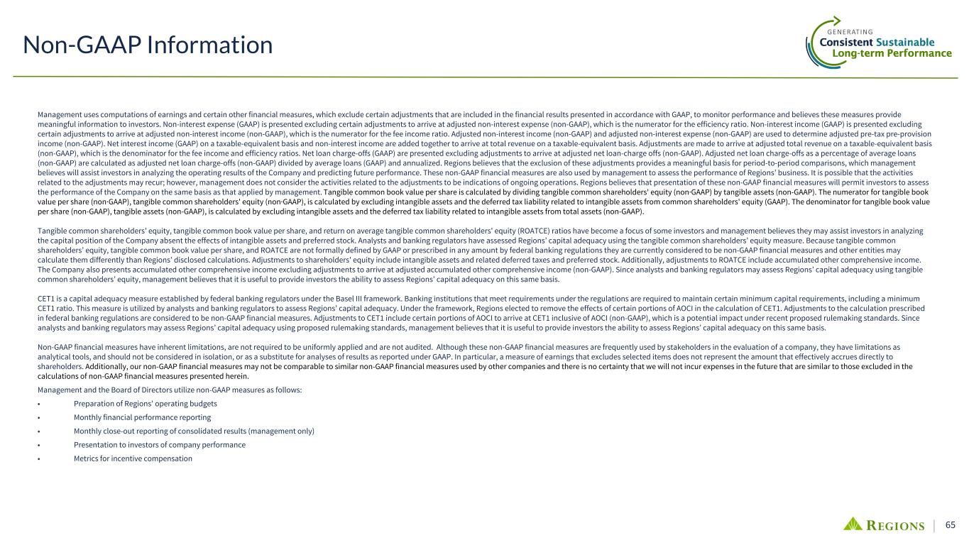 65 Management uses computations of earnings and certain other financial measures, which exclude certain adjustments that are included in the financial results presented in accordance with GAAP, to monitor performance and believes these measures provide meaningful information to investors. Non-interest expense (GAAP) is presented excluding certain adjustments to arrive at adjusted non-interest expense (non-GAAP), which is the numerator for the efficiency ratio. Non-interest income (GAAP) is presented excluding certain adjustments to arrive at adjusted non-interest income (non-GAAP), which is the numerator for the fee income ratio. Adjusted non-interest income (non-GAAP) and adjusted non-interest expense (non-GAAP) are used to determine adjusted pre-tax pre-provision income (non-GAAP). Net interest income (GAAP) on a taxable-equivalent basis and non-interest income are added together to arrive at total revenue on a taxable-equivalent basis. Adjustments are made to arrive at adjusted total revenue on a taxable-equivalent basis (non-GAAP), which is the denominator for the fee income and efficiency ratios. Net loan charge-offs (GAAP) are presented excluding adjustments to arrive at adjusted net loan-charge offs (non-GAAP). Adjusted net loan charge-offs as a percentage of average loans (non-GAAP) are calculated as adjusted net loan charge-offs (non-GAAP) divided by average loans (GAAP) and annualized. Regions believes that the exclusion of these adjustments provides a meaningful basis for period-to-period comparisons, which management believes will assist investors in analyzing the operating results of the Company and predicting future performance. These non-GAAP financial measures are also used by management to assess the performance of Regions’ business. It is possible that the activities related to the adjustments may recur; however, management does not consider the activities related to the adjustments to be indications of ongoing operations. Regions believes that presentation of these non-GAAP financial measures will permit investors to assess the performance of the Company on the same basis as that applied by management. Tangible common book value per share is calculated by dividing tangible common shareholders' equity (non·GAAP) by tangible assets (non-GAAP). The numerator for tangible book value per share (non·GAAP), tangible common shareholders' equity (non·GAAP), is calculated by excluding intangible assets and the deferred tax liability related to intangible assets from common shareholders' equity (GAAP). The denominator for tangible book value per share (non-GAAP), tangible assets (non-GAAP), is calculated by excluding intangible assets and the deferred tax liability related to intangible assets from total assets (non-GAAP). Tangible common shareholders’ equity, tangible common book value per share, and return on average tangible common shareholders' equity (ROATCE) ratios have become a focus of some investors and management believes they may assist investors in analyzing the capital position of the Company absent the effects of intangible assets and preferred stock. Analysts and banking regulators have assessed Regions’ capital adequacy using the tangible common shareholders’ equity measure. Because tangible common shareholders’ equity, tangible common book value per share, and ROATCE are not formally defined by GAAP or prescribed in any amount by federal banking regulations they are currently considered to be non-GAAP financial measures and other entities may calculate them differently than Regions’ disclosed calculations. Adjustments to shareholders' equity include intangible assets and related deferred taxes and preferred stock. Additionally, adjustments to ROATCE include accumulated other comprehensive income. The Company also presents accumulated other comprehensive income excluding adjustments to arrive at adjusted accumulated other comprehensive income (non-GAAP). Since analysts and banking regulators may assess Regions’ capital adequacy using tangible common shareholders’ equity, management believes that it is useful to provide investors the ability to assess Regions’ capital adequacy on this same basis. CET1 is a capital adequacy measure established by federal banking regulators under the Basel III framework. Banking institutions that meet requirements under the regulations are required to maintain certain minimum capital requirements, including a minimum CET1 ratio. This measure is utilized by analysts and banking regulators to assess Regions’ capital adequacy. Under the framework, Regions elected to remove the effects of certain portions of AOCI in the calculation of CET1. Adjustments to the calculation prescribed in federal banking regulations are considered to be non-GAAP financial measures. Adjustments to CET1 include certain portions of AOCI to arrive at CET1 inclusive of AOCI (non-GAAP), which is a potential impact under recent proposed rulemaking standards. Since analysts and banking regulators may assess Regions’ capital adequacy using proposed rulemaking standards, management believes that it is useful to provide investors the ability to assess Regions’ capital adequacy on this same basis. Non-GAAP financial measures have inherent limitations, are not required to be uniformly applied and are not audited. Although these non-GAAP financial measures are frequently used by stakeholders in the evaluation of a company, they have limitations as analytical tools, and should not be considered in isolation, or as a substitute for analyses of results as reported under GAAP. In particular, a measure of earnings that excludes selected items does not represent the amount that effectively accrues directly to shareholders. Additionally, our non-GAAP financial measures may not be comparable to similar non-GAAP financial measures used by other companies and there is no certainty that we will not incur expenses in the future that are similar to those exc