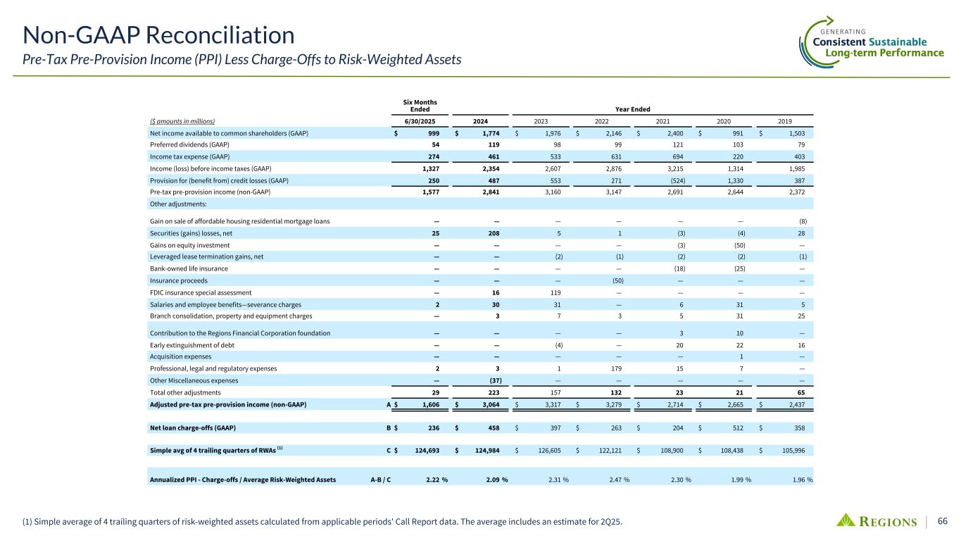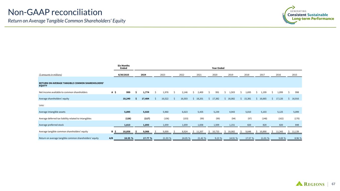 66(1) Simple average of 4 trailing quarters of risk-weighted assets calculated from applicable periods' Call Report data. The average includes an estimate for 2Q25. Six Months Ended Year Ended ($ amounts in millions) 6/30/2025 2024 2023 2022 2021 2020 2019 Net income available to common shareholders (GAAP) $ 999 $ 1,774 $ 1,976 $ 2,146 $ 2,400 $ 991 $ 1,503 Preferred dividends (GAAP) 54 119 98 99 121 103 79 Income tax expense (GAAP) 274 461 533 631 694 220 403 Income (loss) before income taxes (GAAP) 1,327 2,354 2,607 2,876 3,215 1,314 1,985 Provision for (benefit from) credit losses (GAAP) 250 487 553 271 (524) 1,330 387 Pre-tax pre-provision income (non-GAAP) 1,577 2,841 3,160 3,147 2,691 2,644 2,372 Other adjustments: Gain on sale of affordable housing residential mortgage loans — — — — — — (8) Securities (gains) losses, net 25 208 5 1 (3) (4) 28 Gains on equity investment — — — — (3) (50) — Leveraged lease termination gains, net — — (2) (1) (2) (2) (1) Bank-owned life insurance — — — — (18) (25) — Insurance proceeds — — — (50) — — — FDIC insurance special assessment — 16 119 — — — — Salaries and employee benefits—severance charges 2 30 31 — 6 31 5 Branch consolidation, property and equipment charges — 3 7 3 5 31 25 Contribution to the Regions Financial Corporation foundation — — — — 3 10 — Early extinguishment of debt — — (4) — 20 22 16 Acquisition expenses — — — — — 1 — Professional, legal and regulatory expenses 2 3 1 179 15 7 — Other Miscellaneous expenses — (37) — — — — — Total other adjustments 29 223 157 132 23 21 65 Adjusted pre-tax pre-provision income (non-GAAP) A $ 1,606 $ 3,064 $ 3,317 $ 3,279 $ 2,714 $ 2,665 $ 2,437 Net loan charge-offs (GAAP) B $ 236 $ 458 $ 397 $ 263 $ 204 $ 512 $ 358 Simple avg of 4 trailing quarters of RWAs (1) C $ 124,693 $ 124,984 $ 126,605 $ 122,121 $ 108,900 $ 108,438 $ 105,996 Annualized PPI - Charge-offs / Average Risk-Weighted Assets A-B / C 2.22 % 2.09 % 2.31 % 2.47 % 2.30 % 1.99 % 1.96 % Non-GAAP Reconciliation Pre-Tax Pre-Provision Income (PPI) Less Charge-Offs to Risk-Weighted Assets