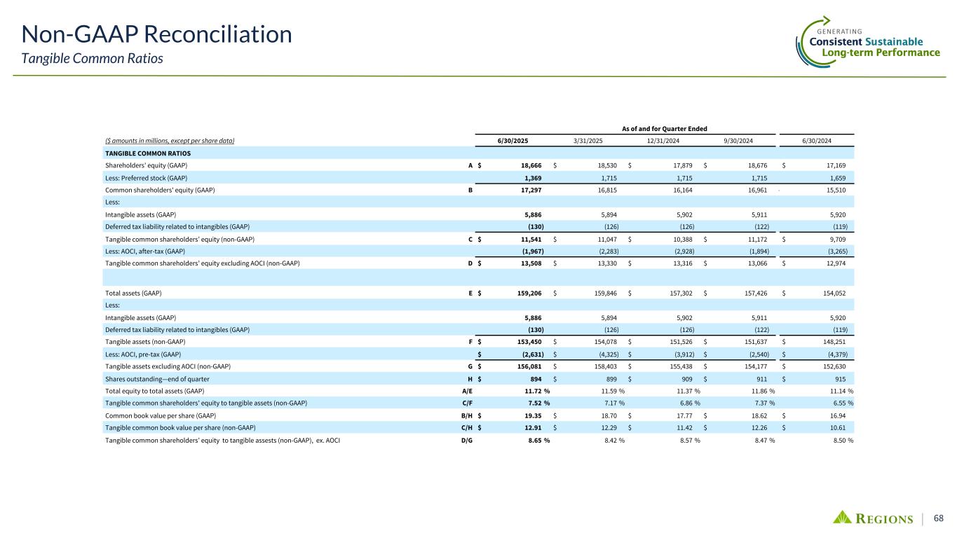 67 Non-GAAP reconciliation Return on Average Tangible Common Shareholders' Equity Six Months Ended Year Ended ($ amounts in millions) 6/30/2025 2024 2023 2022 2021 2020 2019 2018 2017 2016 2015 RETURN ON AVERAGE TANGIBLE COMMON SHAREHOLDERS' EQUITY Net income available to common shareholders A $ 999 $ 1,774 $ 1,976 $ 2,146 $ 2,400 $ 991 $ 1,503 $ 1,695 $ 1,199 $ 1,099 $ 998 Average shareholders' equity 18,240 $ 17,484 $ 16,522 $ 16,503 $ 18,201 $ 17,382 $ 16,082 $ 15,381 $ 16,665 $ 17,126 $ 16,916 Less: Average intangible assets 5,895 5,920 5,960 6,023 5,435 5,239 4,943 5,010 5,103 5,125 5,099 Average deferred tax liability related to intangibles (126) (117) (106) (103) (99) (99) (94) (97) (148) (162) (170) Average preferred stock 1,613 1,693 1,659 1,659 1,658 1,509 1,151 820 820 820 848 Average tangible common shareholders' equity B $ 10,858 $ 9,988 $ 9,009 $ 8,924 $ 11,207 $ 10,733 $ 10,082 $ 9,648 $ 10,890 $ 11,343 $ 11,139 Return on average tangible common shareholders' equity A/B 18.55 % 17.77 % 21.93 % 24.05 % 21.42 % 9.23 % 14.91 % 17.57 % 11.01 % 9.69 % 8.96 %