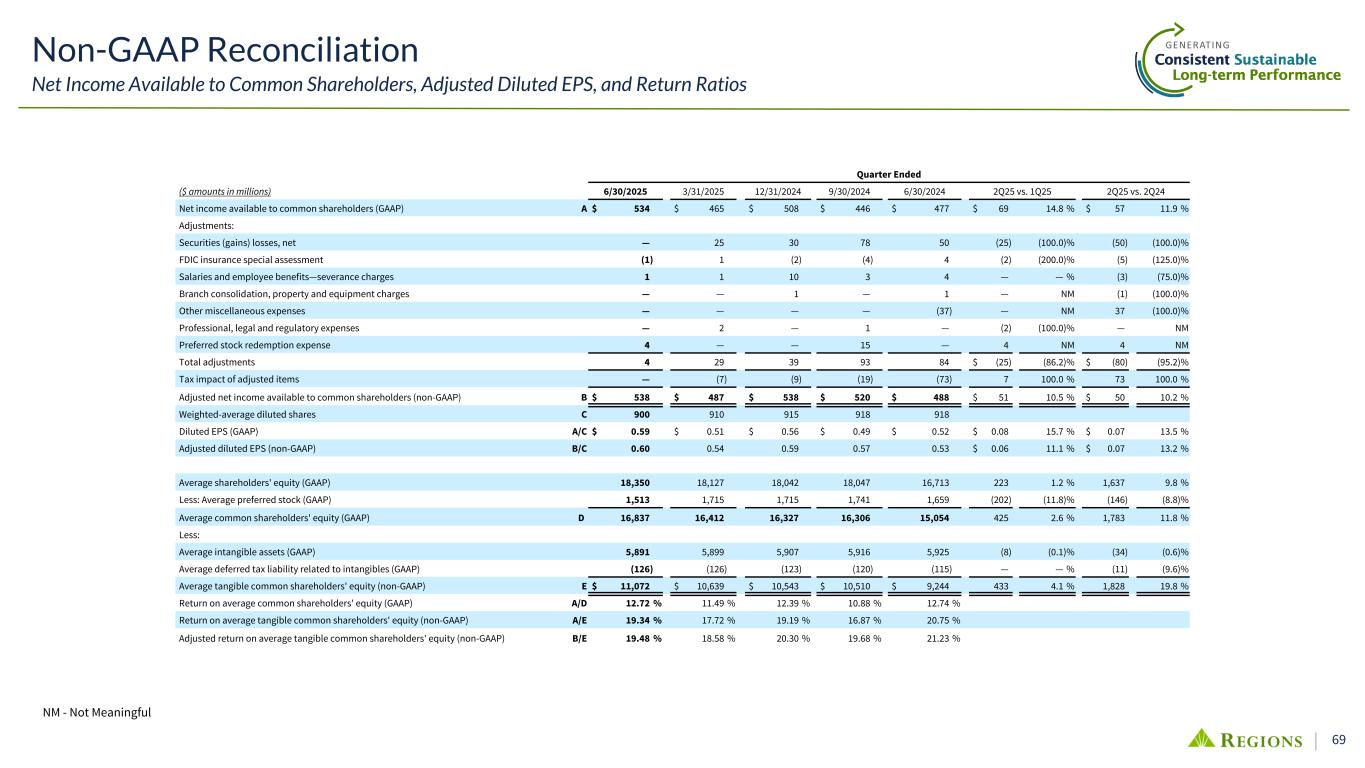 68 Non-GAAP Reconciliation Tangible Common Ratios As of and for Quarter Ended ($ amounts in millions, except per share data) 6/30/2025 3/31/2025 12/31/2024 9/30/2024 6/30/2024 TANGIBLE COMMON RATIOS Shareholders’ equity (GAAP) A $ 18,666 $ 18,530 $ 17,879 $ 18,676 $ 17,169 Less: Preferred stock (GAAP) 1,369 1,715 1,715 1,715 1,659 Common shareholders' equity (GAAP) B 17,297 16,815 16,164 16,961 — 15,510 Less: Intangible assets (GAAP) 5,886 5,894 5,902 5,911 5,920 Deferred tax liability related to intangibles (GAAP) (130) (126) (126) (122) (119) Tangible common shareholders’ equity (non-GAAP) C $ 11,541 $ 11,047 $ 10,388 $ 11,172 $ 9,709 Less: AOCI, after-tax (GAAP) (1,967) (2,283) (2,928) (1,894) (3,265) Tangible common shareholders’ equity excluding AOCI (non-GAAP) D $ 13,508 $ 13,330 $ 13,316 $ 13,066 $ 12,974 Total assets (GAAP) E $ 159,206 $ 159,846 $ 157,302 $ 157,426 $ 154,052 Less: Intangible assets (GAAP) 5,886 5,894 5,902 5,911 5,920 Deferred tax liability related to intangibles (GAAP) (130) (126) (126) (122) (119) Tangible assets (non-GAAP) F $ 153,450 $ 154,078 $ 151,526 $ 151,637 $ 148,251 Less: AOCI, pre-tax (GAAP) $ (2,631) $ (4,325) $ (3,912) $ (2,540) $ (4,379) Tangible assets excluding AOCI (non-GAAP) G $ 156,081 $ 158,403 $ 155,438 $ 154,177 $ 152,630 Shares outstanding—end of quarter H $ 894 $ 899 $ 909 $ 911 $ 915 Total equity to total assets (GAAP) A/E 11.72 % 11.59 % 11.37 % 11.86 % 11.14 % Tangible common shareholders’ equity to tangible assets (non-GAAP) C/F 7.52 % 7.17 % 6.86 % 7.37 % 6.55 % Common book value per share (GAAP) B/H $ 19.35 $ 18.70 $ 17.77 $ 18.62 $ 16.94 Tangible common book value per share (non-GAAP) C/H $ 12.91 $ 12.29 $ 11.42 $ 12.26 $ 10.61 Tangible common shareholders’ equity to tangible assests (non-GAAP), ex. AOCI D/G 8.65 % 8.42 % 8.57 % 8.47 % 8.50 %