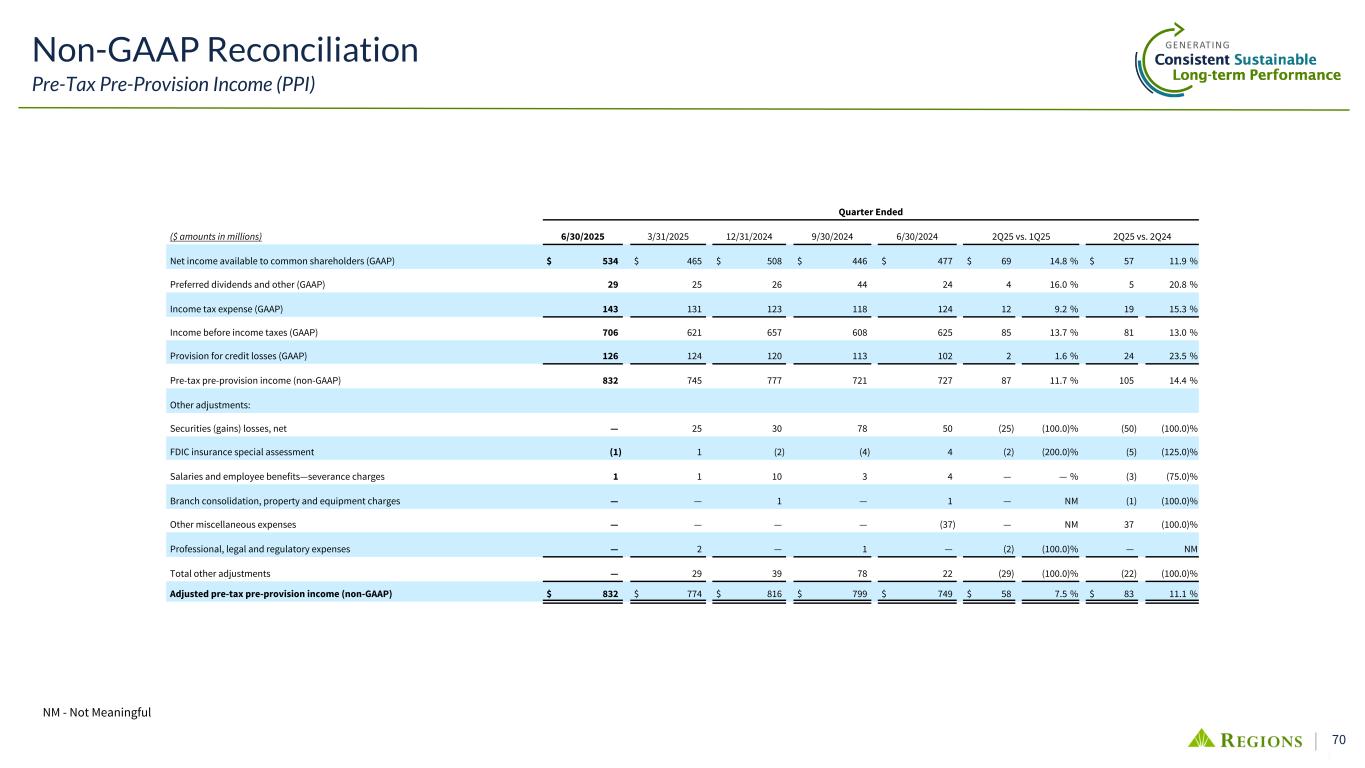 69 Non-GAAP Reconciliation Net Income Available to Common Shareholders, Adjusted Diluted EPS, and Return Ratios NM - Not Meaningful Quarter Ended ($ amounts in millions) 6/30/2025 3/31/2025 12/31/2024 9/30/2024 6/30/2024 2Q25 vs. 1Q25 2Q25 vs. 2Q24 Net income available to common shareholders (GAAP) A $ 534 $ 465 $ 508 $ 446 $ 477 $ 69 14.8 % $ 57 11.9 % Adjustments: Securities (gains) losses, net — 25 30 78 50 (25) (100.0) % (50) (100.0) % FDIC insurance special assessment (1) 1 (2) (4) 4 (2) (200.0) % (5) (125.0) % Salaries and employee benefits—severance charges 1 1 10 3 4 — — % (3) (75.0) % Branch consolidation, property and equipment charges — — 1 — 1 — NM (1) (100.0) % Other miscellaneous expenses — — — — (37) — NM 37 (100.0) % Professional, legal and regulatory expenses — 2 — 1 — (2) (100.0) % — NM Preferred stock redemption expense 4 — — 15 — 4 NM 4 NM Total adjustments 4 29 39 93 84 $ (25) (86.2) % $ (80) (95.2) % Tax impact of adjusted items — (7) (9) (19) (73) 7 100.0 % 73 100.0 % Adjusted net income available to common shareholders (non-GAAP) B $ 538 $ 487 $ 538 $ 520 $ 488 $ 51 10.5 % $ 50 10.2 % Weighted-average diluted shares C 900 910 915 918 918 Diluted EPS (GAAP) A/C $ 0.59 $ 0.51 $ 0.56 $ 0.49 $ 0.52 $ 0.08 15.7 % $ 0.07 13.5 % Adjusted diluted EPS (non-GAAP) B/C 0.60 0.54 0.59 0.57 0.53 $ 0.06 11.1 % $ 0.07 13.2 % Average shareholders' equity (GAAP) 18,350 18,127 18,042 18,047 16,713 223 1.2 % 1,637 9.8 % Less: Average preferred stock (GAAP) 1,513 1,715 1,715 1,741 1,659 (202) (11.8) % (146) (8.8) % Average common shareholders' equity (GAAP) D 16,837 16,412 16,327 16,306 15,054 425 2.6 % 1,783 11.8 % Less: Average intangible assets (GAAP) 5,891 5,899 5,907 5,916 5,925 (8) (0.1) % (34) (0.6) % Average deferred tax liability related to intangibles (GAAP) (126) (126) (123) (120) (115) — — % (11) (9.6) % Average tangible common shareholders' equity (non-GAAP) E $ 11,072 $ 10,639 $ 10,543 $ 10,510 $ 9,244 433 4.1 % 1,828 19.8 % Return on average common shareholders' equity (GAAP) A/D 12.72 % 11.49 % 12.39 % 10.88 % 12.74 % Return on average tangible common shareholders' equity (non-GAAP) A/E 19.34 % 17.72 % 19.19 % 16.87 % 20.75 % Adjusted return on average tangible common shareholders' equity (non-GAAP) B/E 19.48 % 18.58 % 20.30 % 19.68 % 21.23 %