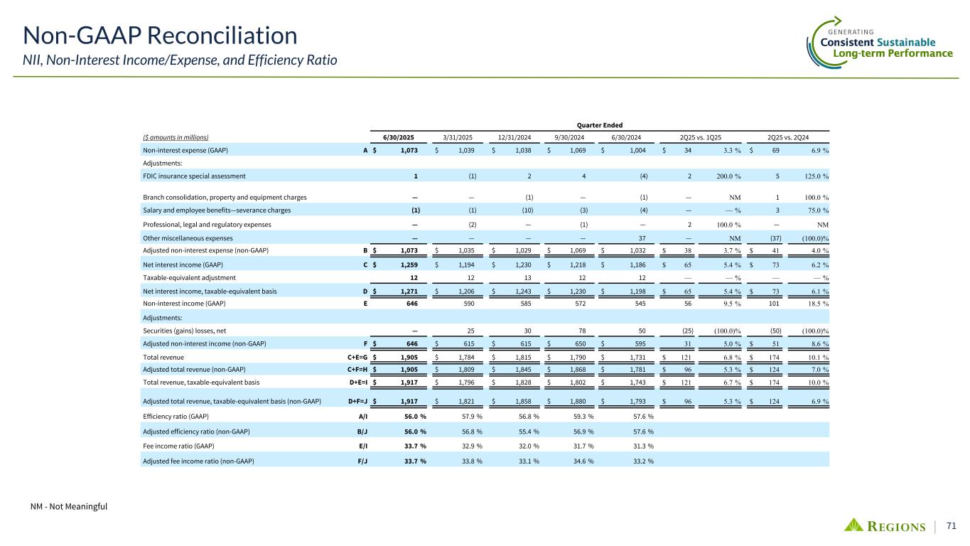 70 Non-GAAP Reconciliation Pre-Tax Pre-Provision Income (PPI) Quarter Ended ($ amounts in millions) 6/30/2025 3/31/2025 12/31/2024 9/30/2024 6/30/2024 2Q25 vs. 1Q25 2Q25 vs. 2Q24 Net income available to common shareholders (GAAP) $ 534 $ 465 $ 508 $ 446 $ 477 $ 69 14.8 % $ 57 11.9 % Preferred dividends and other (GAAP) 29 25 26 44 24 4 16.0 % 5 20.8 % Income tax expense (GAAP) 143 131 123 118 124 12 9.2 % 19 15.3 % Income before income taxes (GAAP) 706 621 657 608 625 85 13.7 % 81 13.0 % Provision for credit losses (GAAP) 126 124 120 113 102 2 1.6 % 24 23.5 % Pre-tax pre-provision income (non-GAAP) 832 745 777 721 727 87 11.7 % 105 14.4 % Other adjustments: Securities (gains) losses, net — 25 30 78 50 (25) (100.0) % (50) (100.0) % FDIC insurance special assessment (1) 1 (2) (4) 4 (2) (200.0) % (5) (125.0) % Salaries and employee benefits—severance charges 1 1 10 3 4 — — % (3) (75.0) % Branch consolidation, property and equipment charges — — 1 — 1 — NM (1) (100.0) % Other miscellaneous expenses — — — — (37) — NM 37 (100.0) % Professional, legal and regulatory expenses — 2 — 1 — (2) (100.0) % — NM Total other adjustments — 29 39 78 22 (29) (100.0) % (22) (100.0) % Adjusted pre-tax pre-provision income (non-GAAP) $ 832 $ 774 $ 816 $ 799 $ 749 $ 58 7.5 % $ 83 11.1 % NM - Not Meaningful