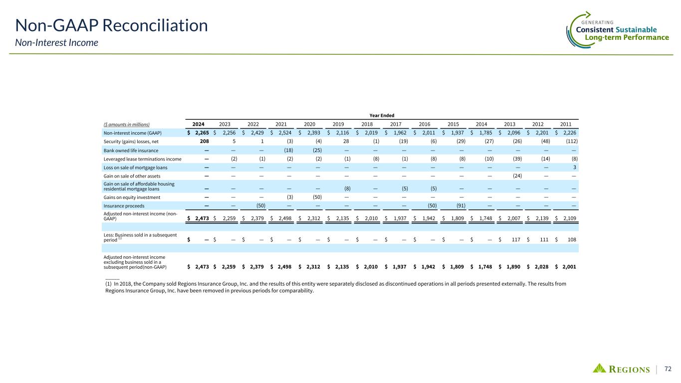 72 Non-GAAP Reconciliation Non-Interest Income Year Ended ($ amounts in millions) 2024 2023 2022 2021 2020 2019 2018 2017 2016 2015 2014 2013 2012 2011 Non-interest income (GAAP) $ 2,265 $ 2,256 $ 2,429 $ 2,524 $ 2,393 $ 2,116 $ 2,019 $ 1,962 $ 2,011 $ 1,937 $ 1,785 $ 2,096 $ 2,201 $ 2,226 Security (gains) losses, net 208 5 1 (3) (4) 28 (1) (19) (6) (29) (27) (26) (48) (112) Bank owned life insurance — — — (18) (25) — — — — — — — — — Leveraged lease terminations income — (2) (1) (2) (2) (1) (8) (1) (8) (8) (10) (39) (14) (8) Loss on sale of mortgage loans — — — — — — — — — — — — — 3 Gain on sale of other assets — — — — — — — — — — — (24) — — Gain on sale of affordable housing residential mortgage loans — — — — — (8) — (5) (5) — — — — — Gains on equity investment — — — (3) (50) — — — — — — — — — Insurance proceeds — — (50) — — — — — (50) (91) — — — — Adjusted non-interest income (non- GAAP) $ 2,473 $ 2,259 $ 2,379 $ 2,498 $ 2,312 $ 2,135 $ 2,010 $ 1,937 $ 1,942 $ 1,809 $ 1,748 $ 2,007 $ 2,139 $ 2,109 Less: Business sold in a subsequent period (1) $ — $ — $ — $ — $ — $ — $ — $ — $ — $ — $ — $ 117 $ 111 $ 108 Adjusted non-interest income excluding business sold in a subsequent period(non-GAAP) $ 2,473 $ 2,259 $ 2,379 $ 2,498 $ 2,312 $ 2,135 $ 2,010 $ 1,937 $ 1,942 $ 1,809 $ 1,748 $ 1,890 $ 2,028 $ 2,001 _____ (1) In 2018, the Company sold Regions Insurance Group, Inc. and the results of this entity were separately disclosed as discontinued operations in all periods presented externally. The results from Regions Insurance Group, Inc. have been removed in previous periods for comparability.