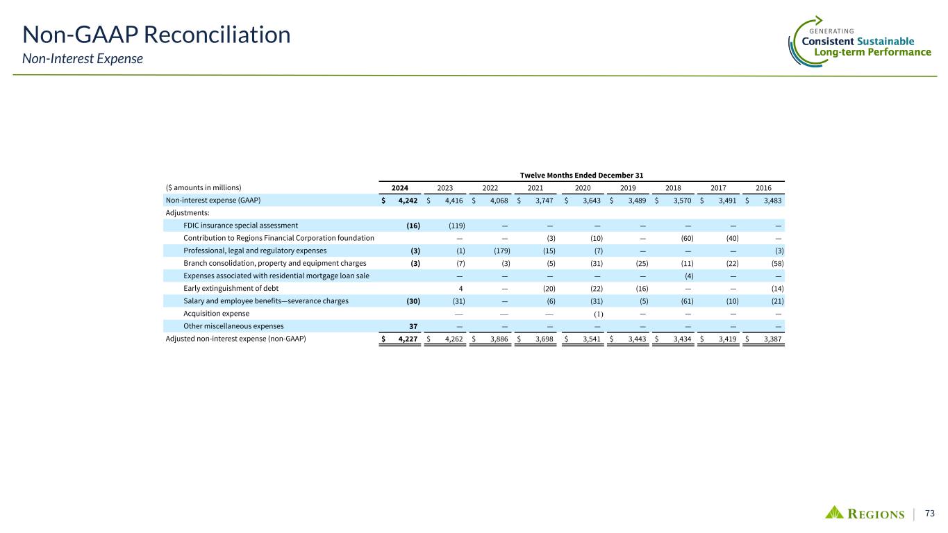 73 Non-GAAP Reconciliation Non-Interest Expense Twelve Months Ended December 31 ($ amounts in millions) 2024 2023 2022 2021 2020 2019 2018 2017 2016 Non-interest expense (GAAP) $ 4,242 $ 4,416 $ 4,068 $ 3,747 $ 3,643 $ 3,489 $ 3,570 $ 3,491 $ 3,483 Adjustments: FDIC insurance special assessment (16) (119) — — — — — — — Contribution to Regions Financial Corporation foundation — — (3) (10) — (60) (40) — Professional, legal and regulatory expenses (3) (1) (179) (15) (7) — — — (3) Branch consolidation, property and equipment charges (3) (7) (3) (5) (31) (25) (11) (22) (58) Expenses associated with residential mortgage loan sale — — — — — (4) — — Early extinguishment of debt 4 — (20) (22) (16) — — (14) Salary and employee benefits—severance charges (30) (31) — (6) (31) (5) (61) (10) (21) Acquisition expense — — — (1) — — — — Other miscellaneous expenses 37 — — — — — — — — Adjusted non-interest expense (non-GAAP) $ 4,227 $ 4,262 $ 3,886 $ 3,698 $ 3,541 $ 3,443 $ 3,434 $ 3,419 $ 3,387