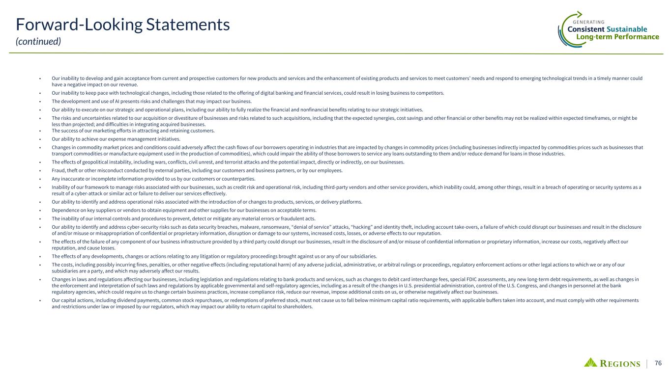 75 Forward-Looking Statements This presentation may include forward-looking statements as defined in the Private Securities Litigation Reform Act of 1995. In addition, the company, through its senior management, may from time to time make forward-looking public statements concerning the matters described herein. The words “future,” “anticipates,” “assumes,” “intends,” “plans,” “seeks,” “believes,” “predicts,” “potential,” “objectives,” “estimates,” “expects,” “targets,” “projects,” “outlook,” “forecast,” “would,” “will,” “may,” “might,” “could,” “should,” “can,” and similar terms and expressions often signify forward-looking statements. Forward-looking statements are subject to the risk that the actual effects may differ, possibly materially, from what is reflected in those forward-looking statements due to factors and future developments that are uncertain, unpredictable and in many cases beyond our control. Forward-looking statements are not based on historical information, but rather are related to future operations, strategies, financial results or other developments. Forward-looking statements are based on management’s current expectations as well as certain assumptions and estimates made by, and information available to, management at the time the statements are made. Those statements are based on general assumptions and are subject to various risks, and because they also relate to the future they are likewise subject to inherent uncertainties and other factors that may cause actual results to differ materially from the views, beliefs and projections expressed in such statements. Therefore, we caution you against relying on any of these forward-looking statements. These risks, uncertainties and other factors include, but are not limited to, those described below: • Current and future economic and market conditions in the United States generally or in the communities we serve (in particular the Southeastern United States), including the effects of possible declines in property values, increases in interest rates and unemployment rates, inflation, financial market disruptions and potential reductions of economic growth, which may adversely affect our lending and other businesses and our financial results and conditions. • Possible changes in trade, monetary and fiscal policies of, and other activities undertaken by, governments, agencies, central banks and similar organizations, including tariffs, which could have a material adverse effect on our businesses and our financial results and conditions. • Changes in market interest rates or capital markets could adversely affect our revenue and expense, the value of assets (such as our portfolio of investment securities) and obligations, as well as the availability and cost of capital and liquidity. • Volatility and uncertainty about the direction of interest rates and the timing of any changes, which may lead to increased costs for businesses and consumers and potentially contribute to poor business and economic conditions generally. • Possible changes in the creditworthiness of customers and the possible impairment of the collectability of loans and leases. • Changes in the speed of loan prepayments, loan origination and sale volumes, charge-offs, credit loss provisions or actual credit losses where our allowance for credit losses may not be adequate to cover our eventual losses. • Possible acceleration of prepayments on mortgage-backed securities due to declining interest rates, and the related acceleration of premium amortization on those securities. • Possible changes in consumer and business spending and saving habits and the related effect on our ability to increase assets and to attract deposits, which could adversely affect our net income. • Loss of customer checking and savings account deposits as customers pursue other, higher-yield investments, or the need to price interest-bearing deposits higher due to competitive forces. Either of these activities could increase our funding costs. • Possible downgrades in our credit ratings or outlook could, among other negative impacts, increase the costs of funding from capital markets. • The loss of value of our investment portfolio could negatively impact market perceptions of us. • Our ability to manage fluctuations in the value of assets and liabilities and off-balance sheet exposure so as to maintain sufficient capital and liquidity to support our businesses. • The effects of social media on market perceptions of us and banks generally. • The effects of problems encountered by other financial institutions that adversely affect us or the banking industry generally could require us to change certain business practices, reduce our revenue, impose additional costs on us, or otherwise negatively affect our businesses. • Volatility in the financial services industry (including failures or rumors of failures of other depository institutions), along with actions taken by governmental agencies to address such turmoil, could affect the ability of depository institutions, including us, to attract and retain depositors and to borrow or raise capital. • Our ability to effectively compete with other traditional and non-traditional financial services companies, including fintechs, some of which possess greater financial resources than we do or are subject to different regulatory standards than we are. Forward-Looking Statements