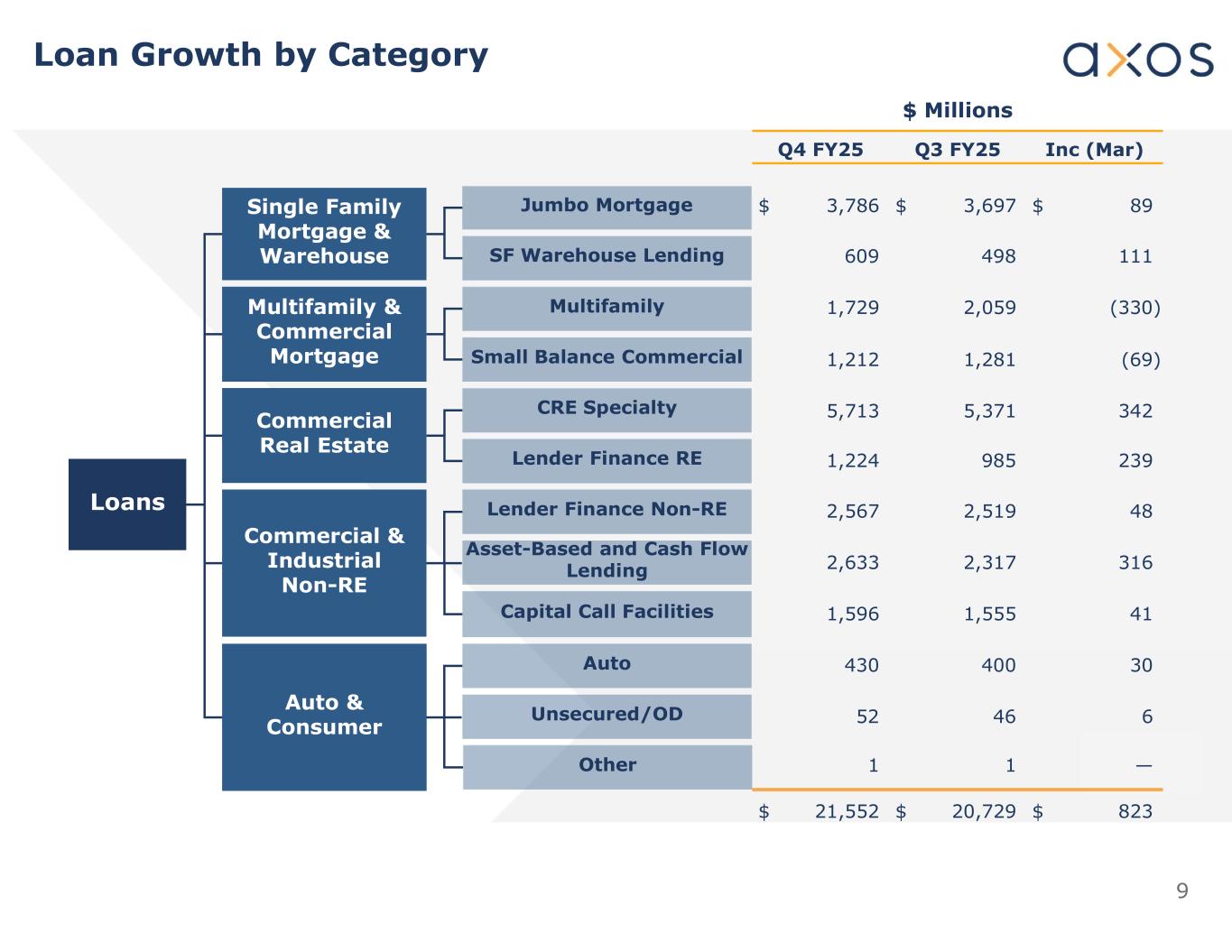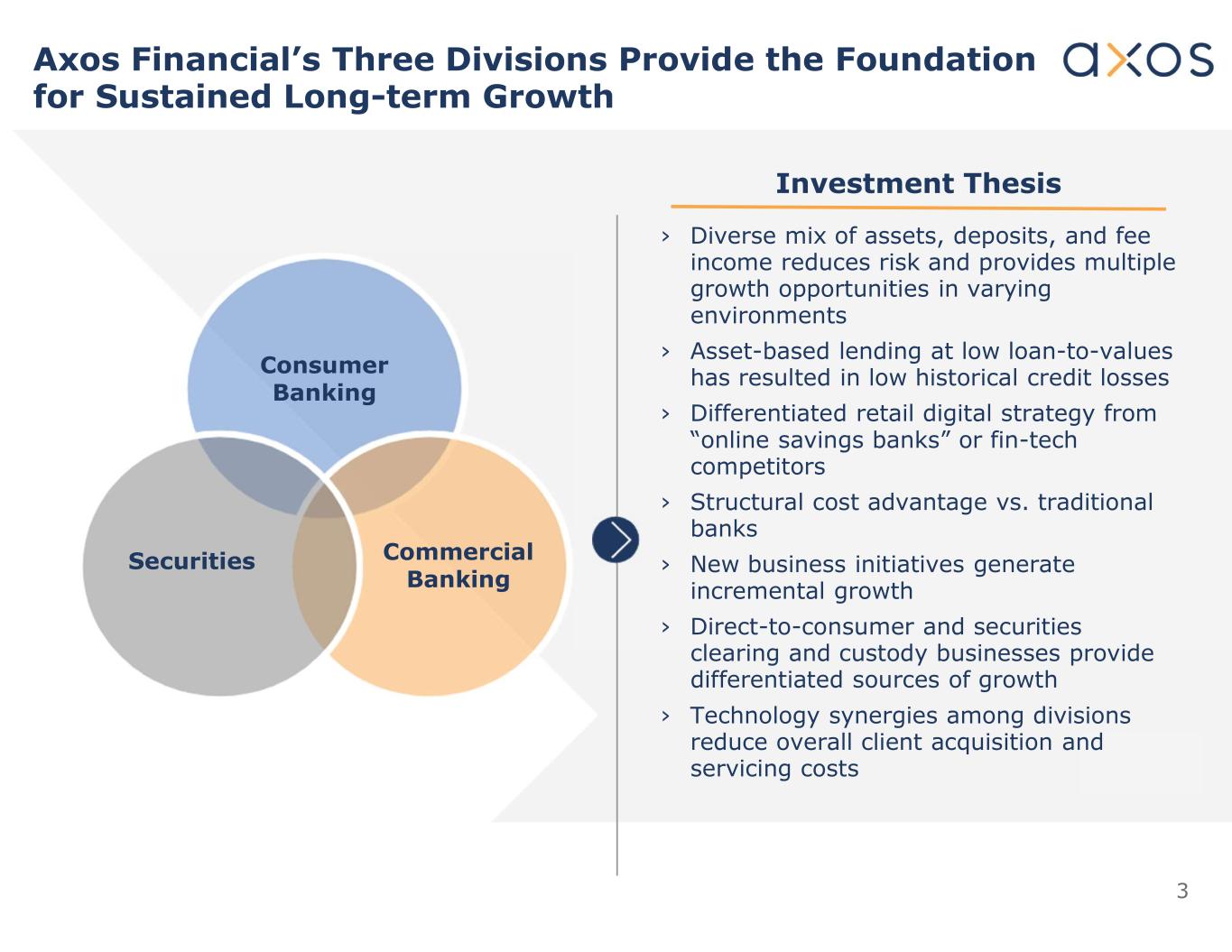 2 Safe Harbor This presentation contains forward-looking statements that involve risks and uncertainties, including without limitation statements relating to Axos Financial, Inc.’s (“Axos”) financial prospects and other projections of its performance and asset quality, Axos’ deposit balances and capital ratios, Axos’ ability to continue to grow profitably and increase its business, Axos’ ability to continue to diversify its lending and deposit franchises, the anticipated timing and financial performance of other offerings, initiatives, and acquisitions, expectations of the environment in which Axos operates and projections of future performance. These forward- looking statements are made on the basis of the views and assumptions of management regarding future events and performance as of the date of this presentation. Actual results and the timing of events could differ materially from those expressed or implied in such forward-looking statements as a result of risks and uncertainties, including without limitation Axos’ ability to successfully integrate acquisitions and realize the anticipated benefits of the transactions, changes in the interest rate environment, monetary policy, inflation, tariffs, government regulation, general economic conditions, changes in the competitive marketplace, conditions in the real estate markets in which we operate, risks associated with credit quality, our ability to attract and retain deposits and access other sources of liquidity, and the outcome and effects of litigation and other factors beyond our control. These and other risks and uncertainties detailed in Axos’ periodic reports filed with the Securities and Exchange Commission, including its Annual Report on Form 10-K for the fiscal year ended June 30, 2024, Form 10-Q for the quarter ended March 31, 2025 and its last earnings press release, could cause actual results to differ materially from those expressed or implied in any forward-looking statements. Readers are cautioned not to place undue reliance on these forward-looking statements, which speak only as of the date of this press release. Axos undertakes no obligation to publicly update or revise any forward-looking statements, whether as a result of new information, future events or otherwise. All written and oral forward-looking statements made in connection with this presentation, which are attributable to us or persons acting on Axos’ behalf are expressly qualified in their entirety by the foregoing information.