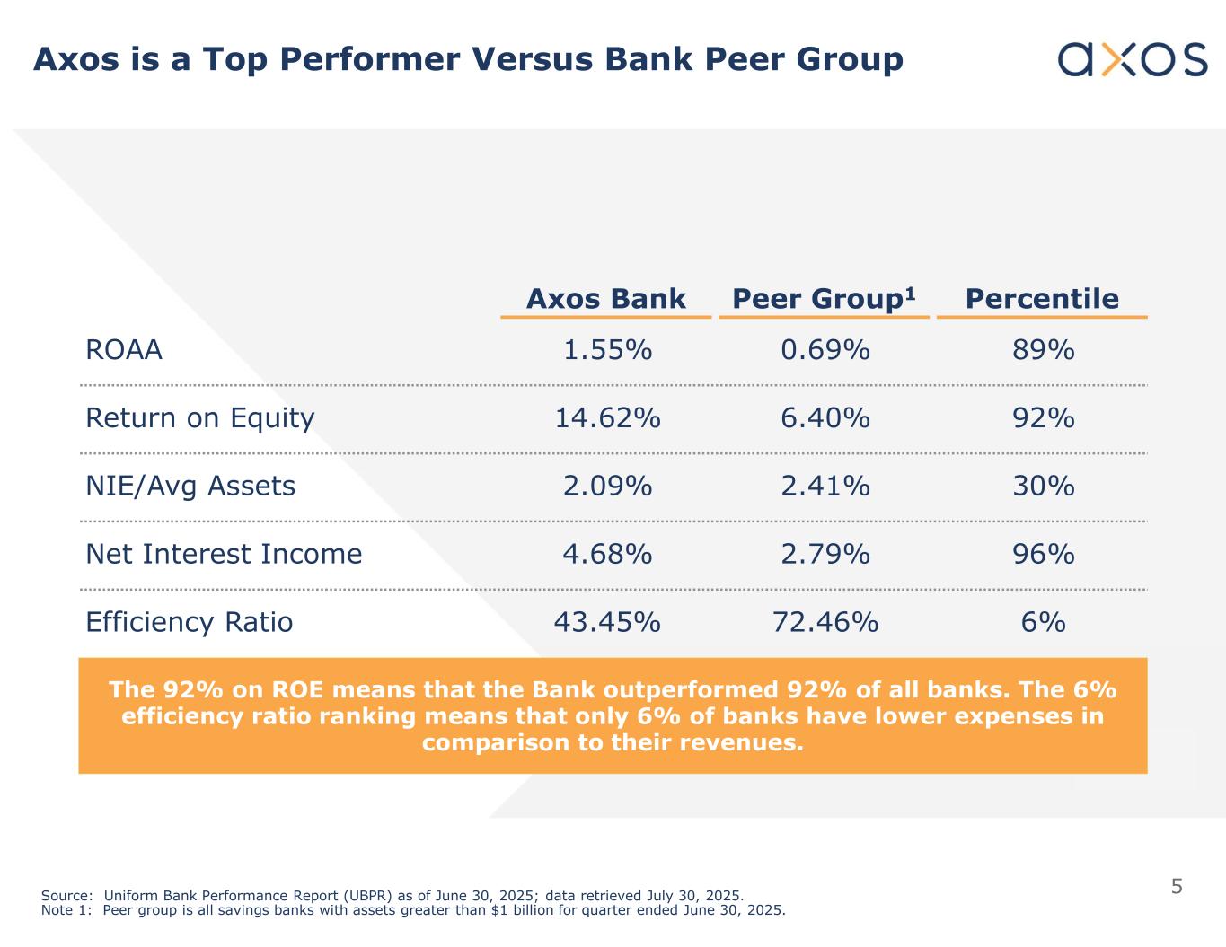 5 PercentilePeer Group1Axos Bank 89%0.69%1.55%ROAA 92%6.40%14.62%Return on Equity 30%2.41%2.09%NIE/Avg Assets 96%2.79%4.68%Net Interest Income 6%72.46%43.45%Efficiency Ratio Source: Uniform Bank Performance Report (UBPR) as of June 30, 2025; data retrieved July 30, 2025. Note 1: Peer group is all savings banks with assets greater than $1 billion for quarter ended June 30, 2025. Axos is a Top Performer Versus Bank Peer Group The 92% on ROE means that the Bank outperformed 92% of all banks. The 6% efficiency ratio ranking means that only 6% of banks have lower expenses in comparison to their revenues.