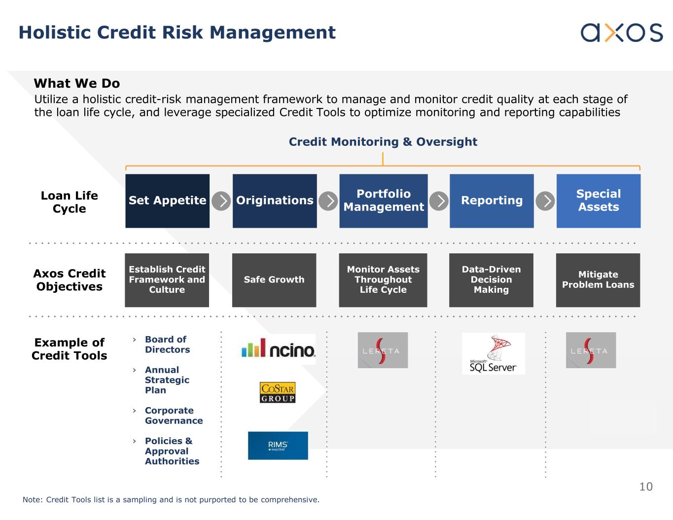 10 Holistic Credit Risk Management What We Do Loan Life Cycle Utilize a holistic credit-risk management framework to manage and monitor credit quality at each stage of the loan life cycle, and leverage specialized Credit Tools to optimize monitoring and reporting capabilities Set Appetite Originations Portfolio Management Reporting Special Assets Credit Monitoring & Oversight Axos Credit Objectives Example of Credit Tools › Board of Directors › Annual Strategic Plan › Corporate Governance › Policies & Approval Authorities Note: Credit Tools list is a sampling and is not purported to be comprehensive. Establish Credit Framework and Culture Safe Growth Monitor Assets Throughout Life Cycle Data-Driven Decision Making Mitigate Problem Loans