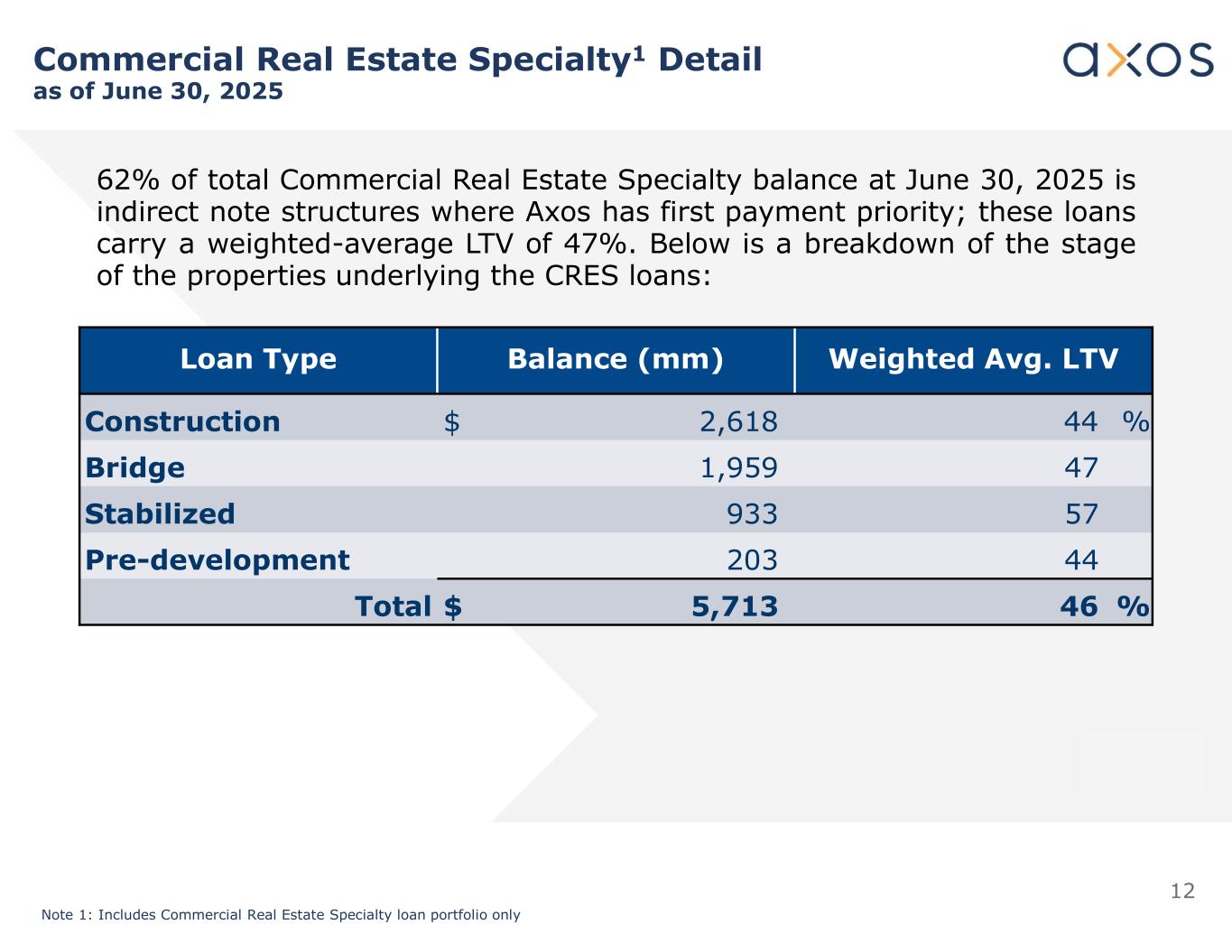 12 Commercial Real Estate Specialty1 Detail as of June 30, 2025 62% of total Commercial Real Estate Specialty balance at June 30, 2025 is indirect note structures where Axos has first payment priority; these loans carry a weighted-average LTV of 47%. Below is a breakdown of the stage of the properties underlying the CRES loans: Note 1: Includes Commercial Real Estate Specialty loan portfolio only Weighted Avg. LTVBalance (mm)Loan Type 44 %$ 2,618Construction 471,959Bridge 57933Stabilized 44203Pre-development 46 %$ 5,713Total