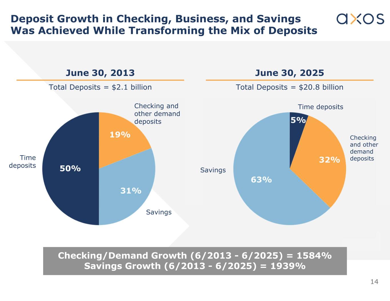 13 Diversified Deposit Gathering Approximately 90% of deposits are FDIC-insured or collateralized Deposit balances as of June 30, 2025 Note 1: Excludes approximately $450 million of off-balance sheet deposits › Serves approximately 40% of U.S. Chapter 7 bankruptcy trustees in exclusive relationship › Software allows servicing of SEC receivers and non-chapter 7 cases › Full service digital banking, wealth management, and securities trading › White-label banking › Business banking with simple suite of cash management services › HOA and property management › Business management and entertainment › Title and escrow companies › 1031 exchange firms › Broker-dealer client cash › Broker-dealer reserve accounts › Full service treasury/cash management › Team enhancements and geographic expansion › Bank and securities cross-sell Fiduciary Services $1.1B Consumer Direct $11.6B Specialty Deposits $2.2B Distribution Partners $0.4B Axos Securities $1.0B1 Small Business Banking $0.6B Commercial & Treasury Management $3.9B Diversified Deposit Gathering Business Lines