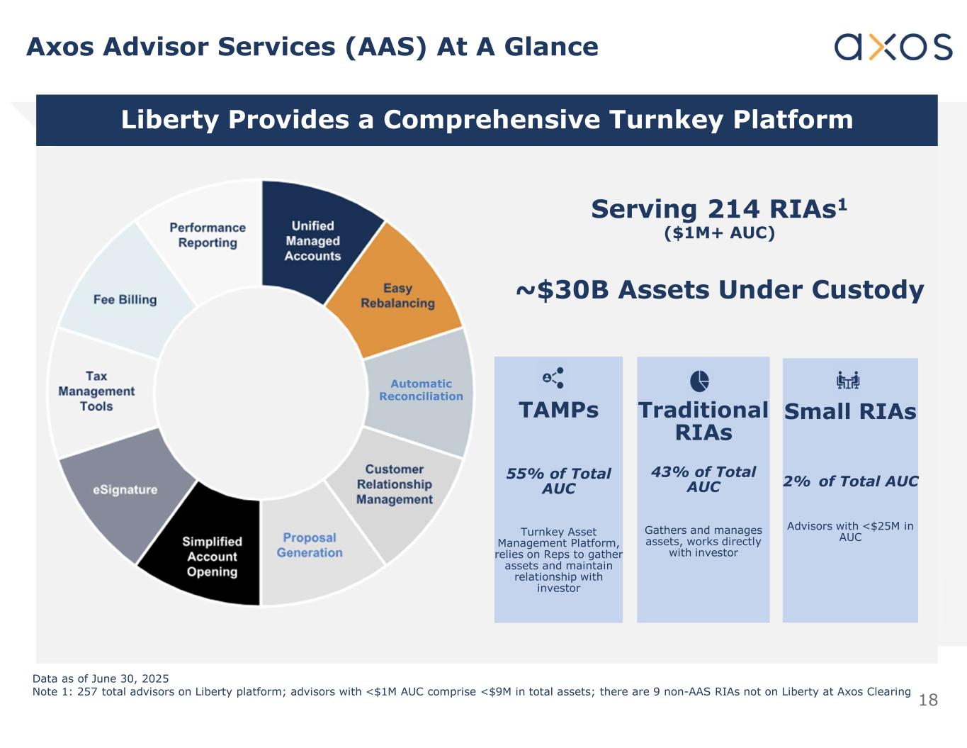 17 › Leadership team with more than 100 years combined industry experience. › Proprietary front- and back-end technologies for advisors and broker- dealers. › Axos Advisor Services is the 6th largest RIA custodian in the U.S. › More than $35 billion in Clearing Services client assets under custody and/or administration. Three Months Ended June 30, 2025 Three Months Ended June 30, 2019 Axos Clearing and Custody Highlights $ —Custody 5,442,487 Clearing Fees & Execution 2,198,140Cash Sorting 3,040,793Margin Lending 880,751Securities Lending (30,406)Net Interest Income $ 11,531,765Net Revenues $ 7,749,487Custody 6,666,263Clearing Fees & Execution 14,954,010Cash Sorting 3,999,096Margin Lending 2,101,870Securities Lending 1,183,427Net Interest Income $ 36,654,153Net Revenues