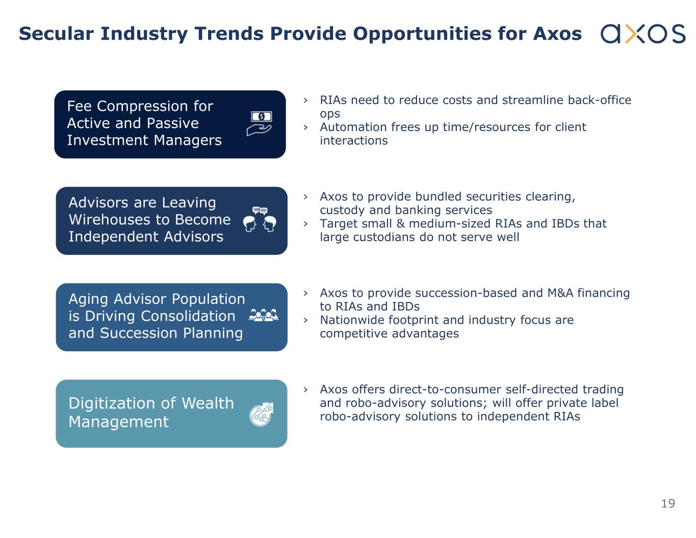 18 Axos Advisor Services (AAS) At A Glance Liberty Provides a Comprehensive Turnkey Platform Automatic Reconciliation Serving 214 RIAs1 ($1M+ AUC) ~$30B Assets Under Custody Small RIAs 2% of Total AUC Advisors with <$25M in AUC Traditional RIAs 43% of Total AUC Gathers and manages assets, works directly with investor TAMPs 55% of Total AUC Turnkey Asset Management Platform, relies on Reps to gather assets and maintain relationship with investor Data as of June 30, 2025 Note 1: 257 total advisors on Liberty platform; advisors with <$1M AUC comprise <$9M in total assets; there are 9 non-AAS RIAs not on Liberty at Axos Clearing