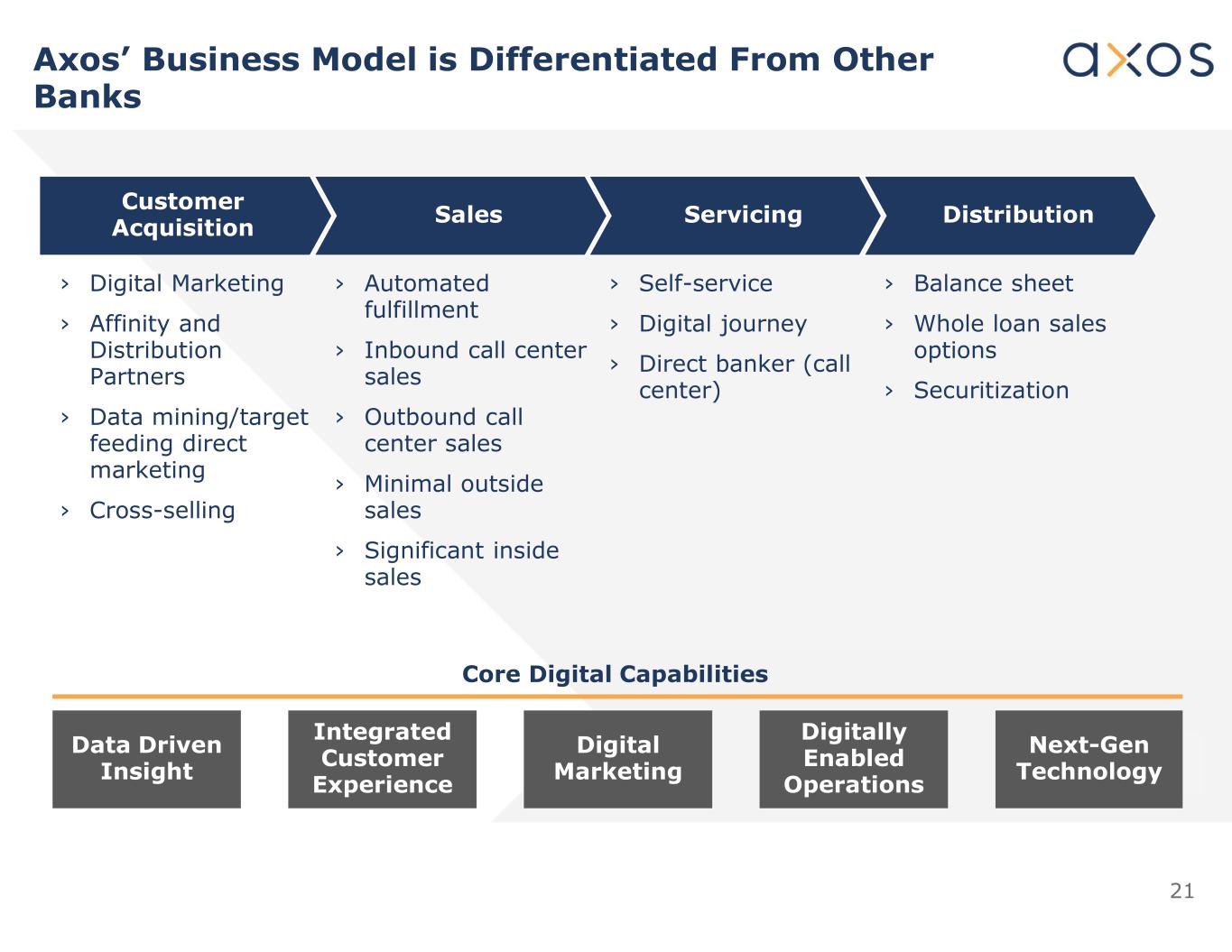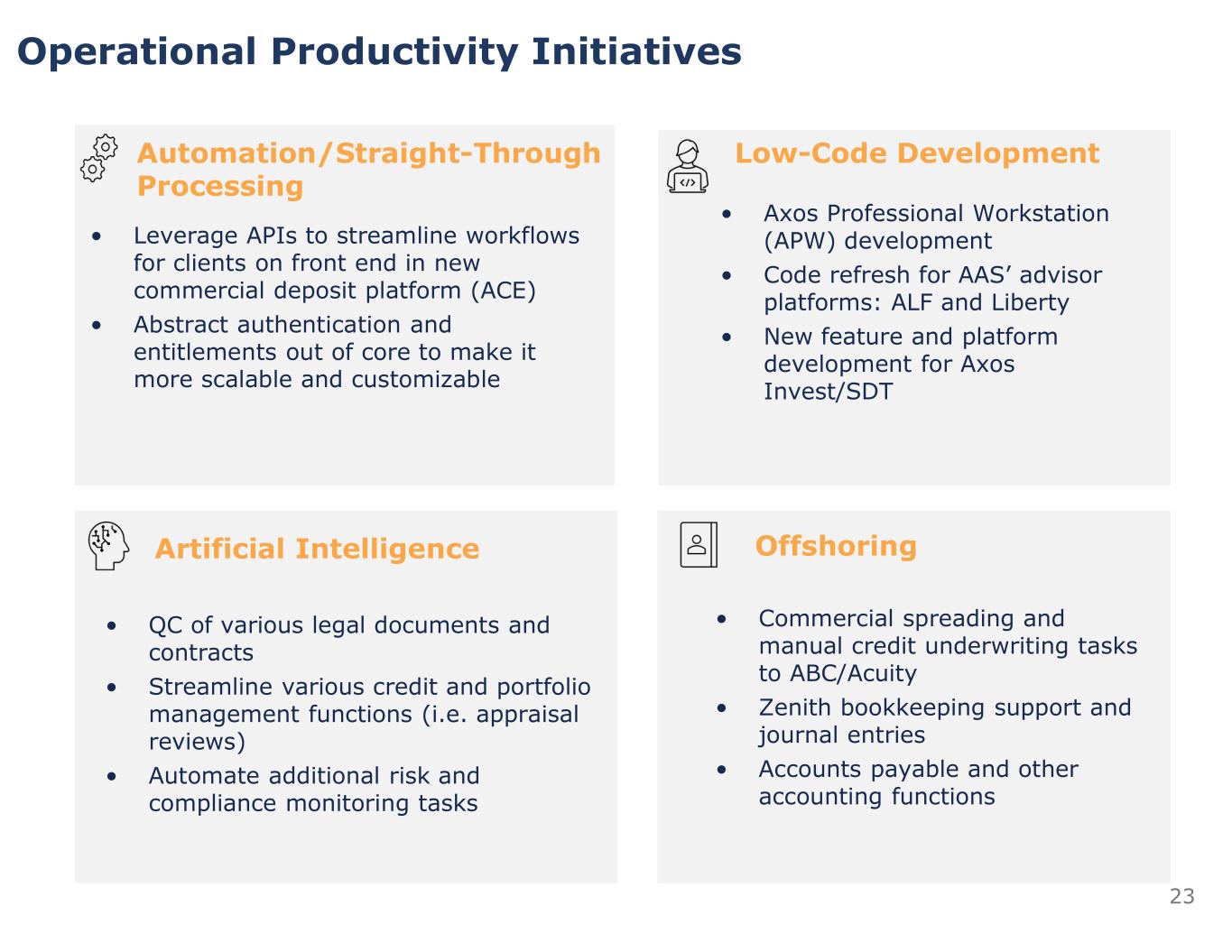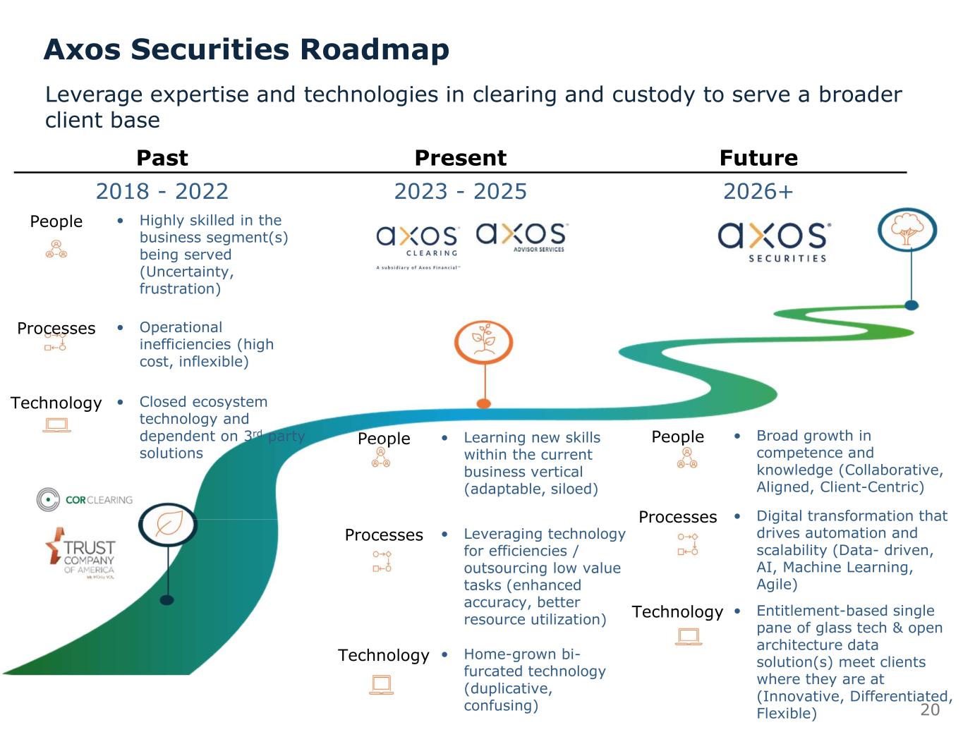 Axos Securities Roadmap FuturePresentPast 2026+2023 - 20252018 - 2022 • Learning new skills within the current business vertical (adaptable, siloed) People • Leveraging technology for efficiencies / outsourcing low value tasks (enhanced accuracy, better resource utilization) Processes • Home-grown bi- furcated technology (duplicative, confusing) Technology • Broad growth in competence and knowledge (Collaborative, Aligned, Client-Centric) People • Digital transformation that drives automation and scalability (Data- driven, AI, Machine Learning, Agile) Processes • Entitlement-based single pane of glass tech & open architecture data solution(s) meet clients where they are at (Innovative, Differentiated, Flexible) Technology • Highly skilled in the business segment(s) being served (Uncertainty, frustration) People • Operational inefficiencies (high cost, inflexible) Processes • Closed ecosystem technology and dependent on 3rd party solutions Technology Leverage expertise and technologies in clearing and custody to serve a broader client base 20