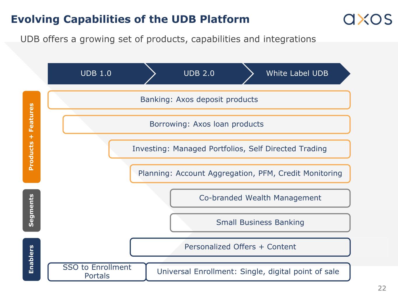 22 Evolving Capabilities of the UDB Platform UDB 1.0 UDB 2.0 White Label UDB Banking: Axos deposit products Borrowing: Axos loan products Investing: Managed Portfolios, Self Directed Trading Planning: Account Aggregation, PFM, Credit Monitoring Personalized Offers + Content Co-branded Wealth Management SSO to Enrollment Portals Universal Enrollment: Single, digital point of sale UDB offers a growing set of products, capabilities and integrations Small Business Banking P ro d u ct s + F e a tu re s S e g m e n ts E n a b le rs