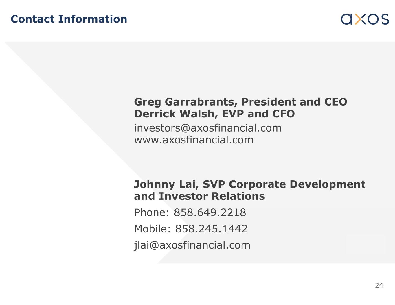 24 Greg Garrabrants, President and CEO Derrick Walsh, EVP and CFO investors@axosfinancial.com www.axosfinancial.com Johnny Lai, SVP Corporate Development and Investor Relations Phone: 858.649.2218 Mobile: 858.245.1442 jlai@axosfinancial.com Contact Information