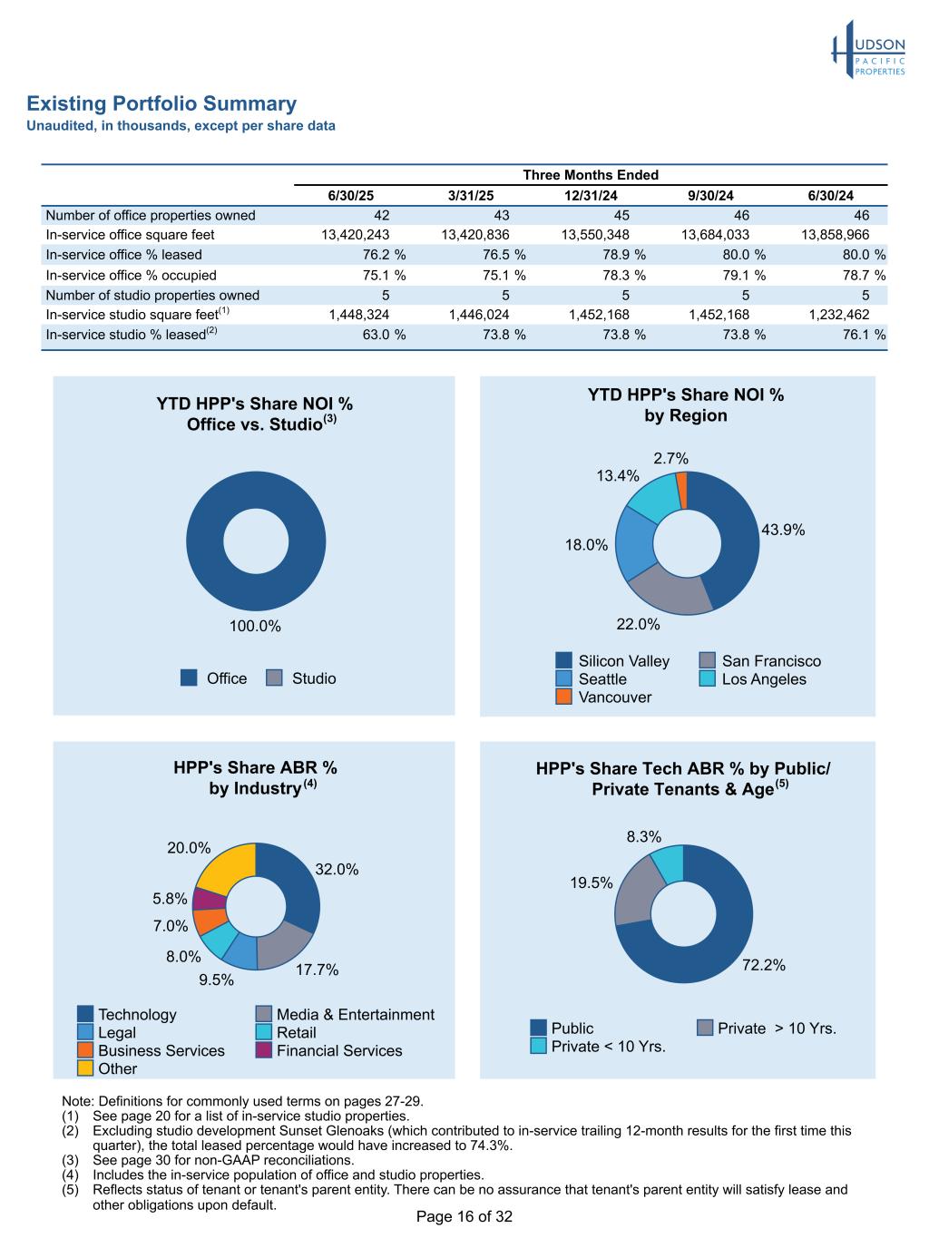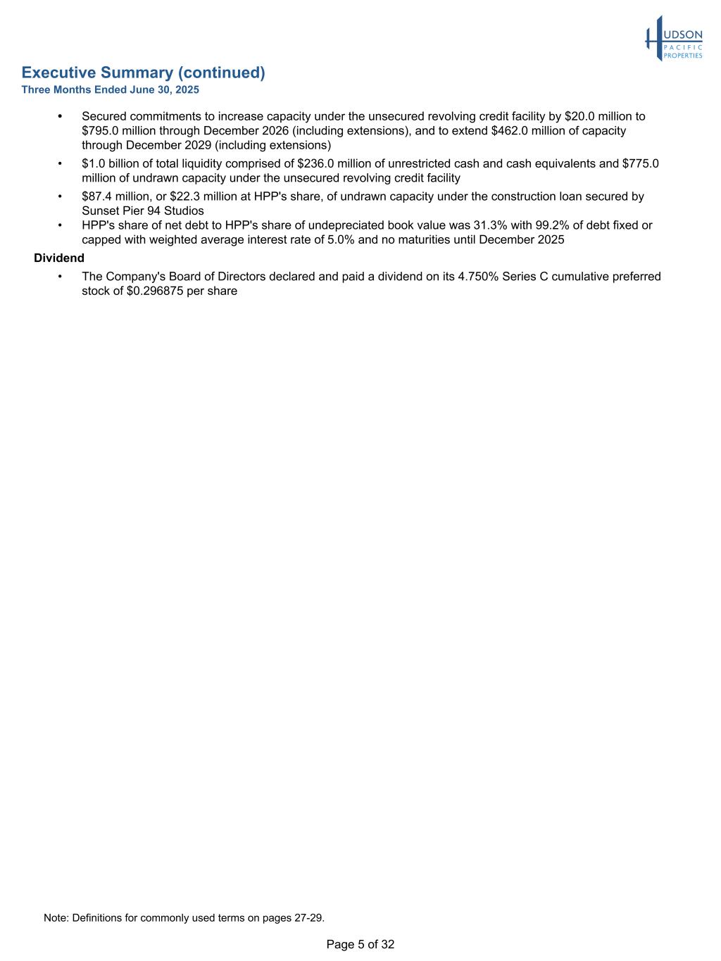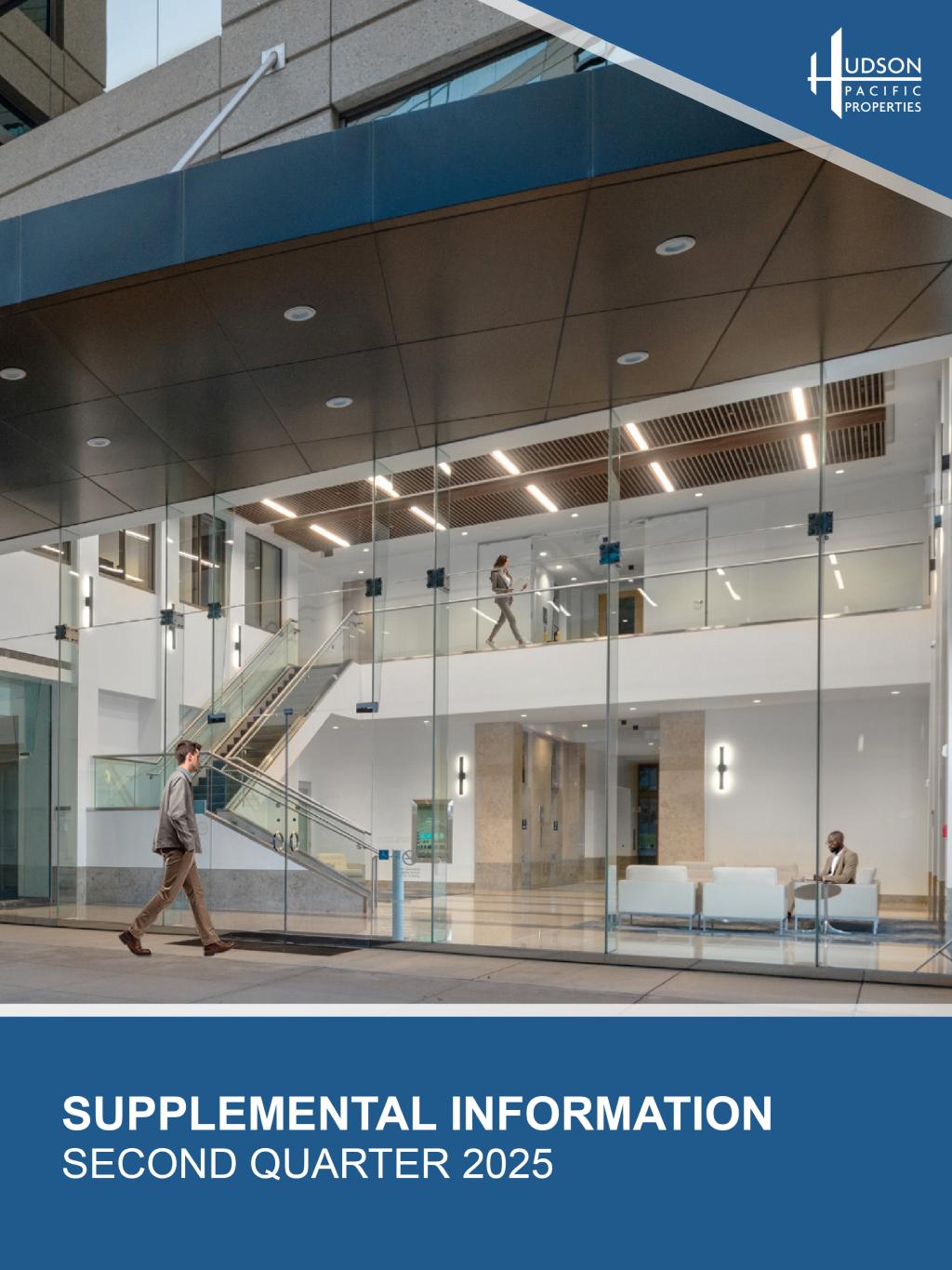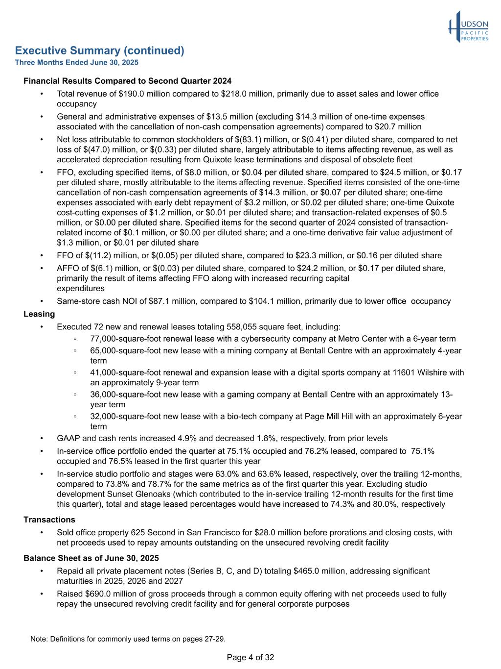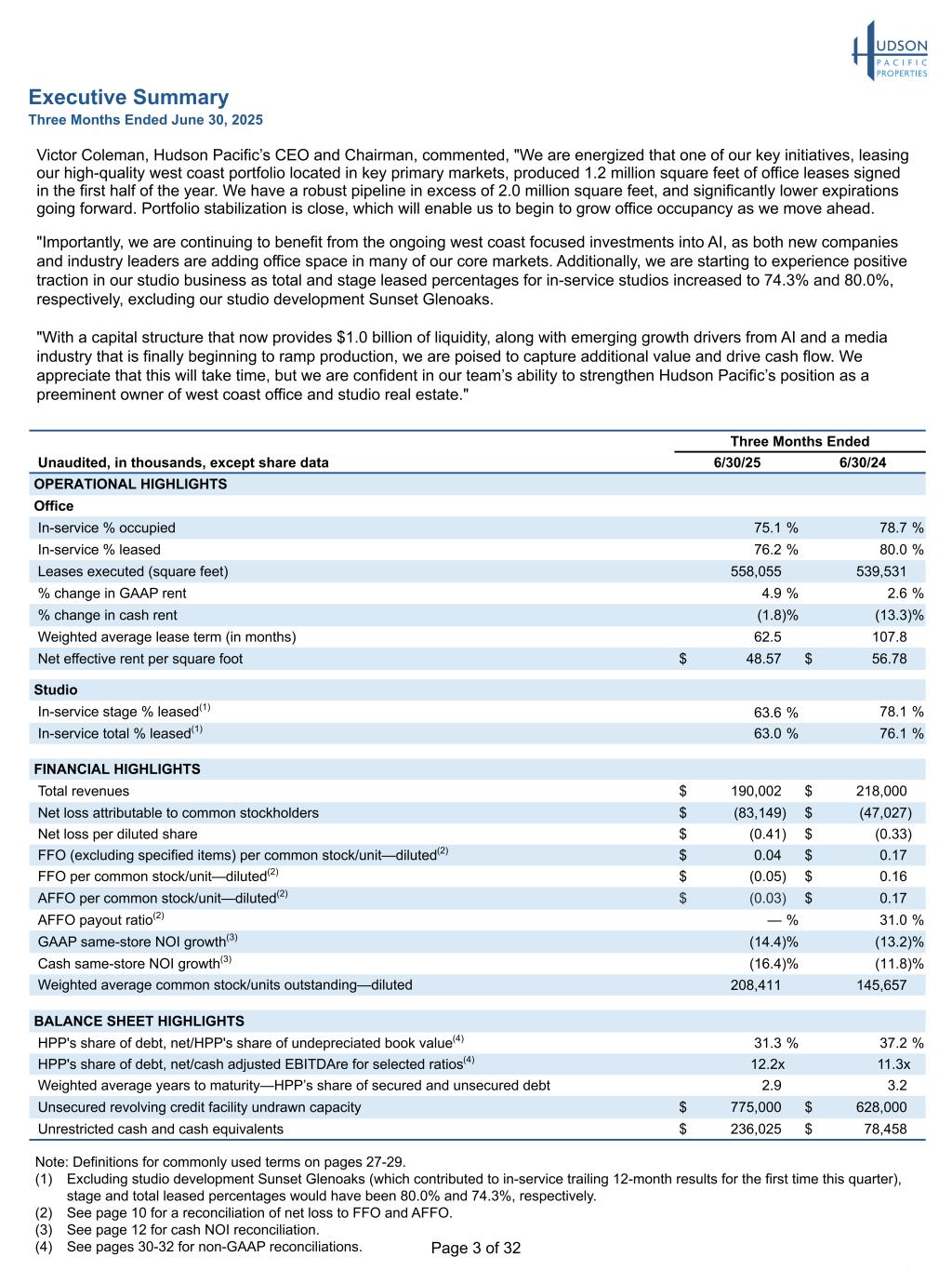 Page 3 of 32 Executive Summary Three Months Ended June 30, 2025 Victor Coleman, Hudson Pacific’s CEO and Chairman, commented, "We are energized that one of our key initiatives, leasing our high-quality west coast portfolio located in key primary markets, produced 1.2 million square feet of office leases signed in the first half of the year. We have a robust pipeline in excess of 2.0 million square feet, and significantly lower expirations going forward. Portfolio stabilization is close, which will enable us to begin to grow office occupancy as we move ahead. "Importantly, we are continuing to benefit from the ongoing west coast focused investments into AI, as both new companies and industry leaders are adding office space in many of our core markets. Additionally, we are starting to experience positive traction in our studio business as total and stage leased percentages for in-service studios increased to 74.3% and 80.0%, respectively, excluding our studio development Sunset Glenoaks. "With a capital structure that now provides $1.0 billion of liquidity, along with emerging growth drivers from AI and a media industry that is finally beginning to ramp production, we are poised to capture additional value and drive cash flow. We appreciate that this will take time, but we are confident in our team’s ability to strengthen Hudson Pacific’s position as a preeminent owner of west coast office and studio real estate." Three Months Ended Unaudited, in thousands, except share data 6/30/25 6/30/24 OPERATIONAL HIGHLIGHTS Office In-service % occupied 75.1 % 78.7 % In-service % leased 76.2 % 80.0 % Leases executed (square feet) 558,055 539,531 % change in GAAP rent 4.9 % 2.6 % % change in cash rent (1.8) % (13.3) % Weighted average lease term (in months) 62.5 107.8 Net effective rent per square foot $ 48.57 $ 56.78 Studio In-service stage % leased(1) 63.6 % 78.1 % In-service total % leased(1) 63.0 % 76.1 % FINANCIAL HIGHLIGHTS Total revenues $ 190,002 $ 218,000 Net loss attributable to common stockholders $ (83,149) $ (47,027) Net loss per diluted share $ (0.41) $ (0.33) FFO (excluding specified items) per common stock/unit—diluted(2) $ 0.04 $ 0.17 FFO per common stock/unit—diluted(2) $ (0.05) $ 0.16 AFFO per common stock/unit—diluted(2) $ (0.03) $ 0.17 AFFO payout ratio(2) — % 31.0 % GAAP same-store NOI growth(3) (14.4) % (13.2) % Cash same-store NOI growth(3) (16.4) % (11.8) % Weighted average common stock/units outstanding—diluted 208,411 145,657 BALANCE SHEET HIGHLIGHTS HPP's share of debt, net/HPP's share of undepreciated book value(4) 31.3 % 37.2 % HPP's share of debt, net/cash adjusted EBITDAre for selected ratios(4) 12.2x 11.3x Weighted average years to maturity—HPP’s share of secured and unsecured debt 2.9 3.2 Unsecured revolving credit facility undrawn capacity $ 775,000 $ 628,000 Unrestricted cash and cash equivalents $ 236,025 $ 78,458 Note: Definitions for commonly used terms on pages 27-29. (1) Excluding studio development Sunset Glenoaks (which contributed to in-service trailing 12-month results for the first time this quarter), stage and total leased percentages would have been 80.0% and 74.3%, respectively. (2) See page 10 for a reconciliation of net loss to FFO and AFFO. (3) See page 12 for cash NOI reconciliation. (4) See pages 30-32 for non-GAAP reconciliations.