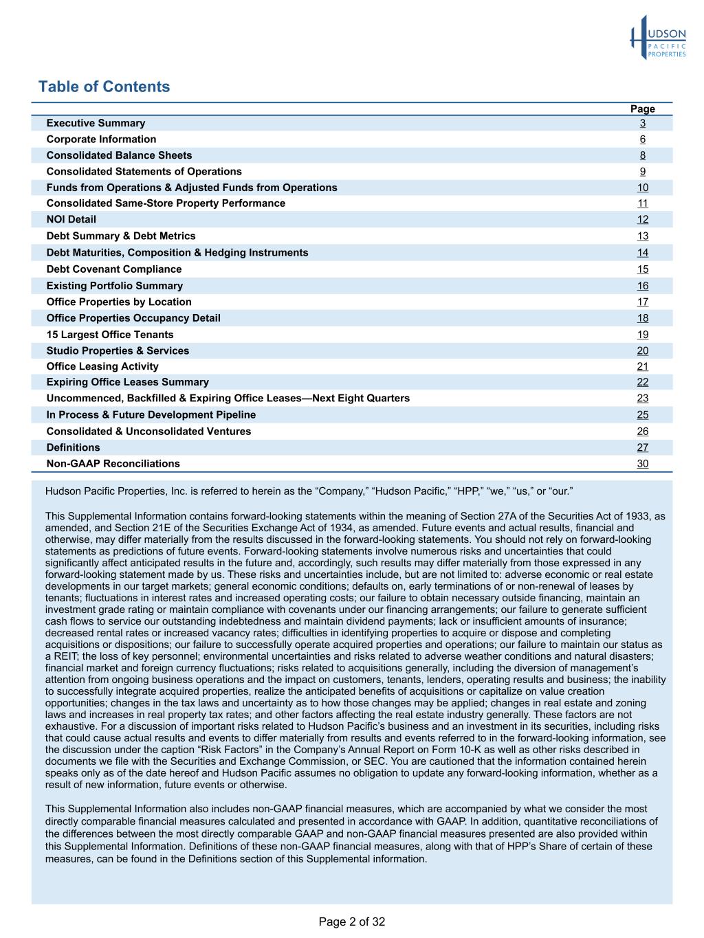 Page 2 of 32 Table of Contents Page Executive Summary 3 Corporate Information 6 Consolidated Balance Sheets 8 Consolidated Statements of Operations 9 Funds from Operations & Adjusted Funds from Operations 10 Consolidated Same-Store Property Performance 11 NOI Detail 12 Debt Summary & Debt Metrics 13 Debt Maturities, Composition & Hedging Instruments 14 Debt Covenant Compliance 15 Existing Portfolio Summary 16 Office Properties by Location 17 Office Properties Occupancy Detail 18 15 Largest Office Tenants 19 Studio Properties & Services 20 Office Leasing Activity 21 Expiring Office Leases Summary 22 Uncommenced, Backfilled & Expiring Office Leases—Next Eight Quarters 23 In Process & Future Development Pipeline 25 Consolidated & Unconsolidated Ventures 26 Definitions 27 Non-GAAP Reconciliations 30 Hudson Pacific Properties, Inc. is referred to herein as the “Company,” “Hudson Pacific,” “HPP,” “we,” “us,” or “our.” This Supplemental Information contains forward-looking statements within the meaning of Section 27A of the Securities Act of 1933, as amended, and Section 21E of the Securities Exchange Act of 1934, as amended. Future events and actual results, financial and otherwise, may differ materially from the results discussed in the forward-looking statements. You should not rely on forward-looking statements as predictions of future events. Forward-looking statements involve numerous risks and uncertainties that could significantly affect anticipated results in the future and, accordingly, such results may differ materially from those expressed in any forward-looking statement made by us. These risks and uncertainties include, but are not limited to: adverse economic or real estate developments in our target markets; general economic conditions; defaults on, early terminations of or non-renewal of leases by tenants; fluctuations in interest rates and increased operating costs; our failure to obtain necessary outside financing, maintain an investment grade rating or maintain compliance with covenants under our financing arrangements; our failure to generate sufficient cash flows to service our outstanding indebtedness and maintain dividend payments; lack or insufficient amounts of insurance; decreased rental rates or increased vacancy rates; difficulties in identifying properties to acquire or dispose and completing acquisitions or dispositions; our failure to successfully operate acquired properties and operations; our failure to maintain our status as a REIT; the loss of key personnel; environmental uncertainties and risks related to adverse weather conditions and natural disasters; financial market and foreign currency fluctuations; risks related to acquisitions generally, including the diversion of management’s attention from ongoing business operations and the impact on customers, tenants, lenders, operating results and business; the inability to successfully integrate acquired properties, realize the anticipated benefits of acquisitions or capitalize on value creation opportunities; changes in the tax laws and uncertainty as to how those changes may be applied; changes in real estate and zoning laws and increases in real property tax rates; and other factors affecting the real estate industry generally. These factors are not exhaustive. For a discussion of important risks related to Hudson Pacific’s business and an investment in its securities, including risks that could cause actual results and events to differ materially from results and events referred to in the forward-looking information, see the discussion under the caption “Risk Factors” in the Company’s Annual Report on Form 10-K as well as other risks described in documents we file with the Securities and Exchange Commission, or SEC. You are cautioned that the information contained herein speaks only as of the date hereof and Hudson Pacific assumes no obligation to update any forward-looking information, whether as a result of new information, future events or otherwise. This Supplemental Information also includes non-GAAP financial measures, which are accompanied by what we consider the most directly comparable financial measures calculated and presented in accordance with GAAP. In addition, quantitative reconciliations of the differences between the most directly comparable GAAP and non-GAAP financial measures presented are also provided within this Supplemental Information. Definitions of these non-GAAP financial measures, along with that of HPP’s Share of certain of these measures, can be found in the Definitions section of this Supplemental information.