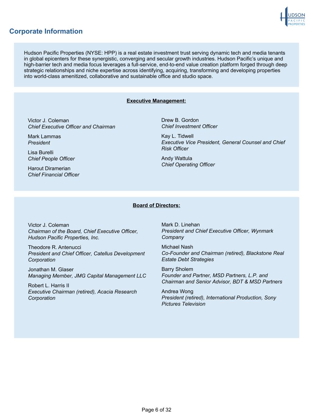 Page 6 of 32 Corporate Information Hudson Pacific Properties (NYSE: HPP) is a real estate investment trust serving dynamic tech and media tenants in global epicenters for these synergistic, converging and secular growth industries. Hudson Pacific’s unique and high-barrier tech and media focus leverages a full-service, end-to-end value creation platform forged through deep strategic relationships and niche expertise across identifying, acquiring, transforming and developing properties into world-class amenitized, collaborative and sustainable office and studio space. Mark D. Linehan President and Chief Executive Officer, Wynmark Company Michael Nash Co-Founder and Chairman (retired), Blackstone Real Estate Debt Strategies Barry Sholem Founder and Partner, MSD Partners, L.P. and Chairman and Senior Advisor, BDT & MSD Partners Andrea Wong President (retired), International Production, Sony Pictures Television Victor J. Coleman Chairman of the Board, Chief Executive Officer, Hudson Pacific Properties, Inc. Theodore R. Antenucci President and Chief Officer, Catellus Development Corporation Jonathan M. Glaser Managing Member, JMG Capital Management LLC Robert L. Harris II Executive Chairman (retired), Acacia Research Corporation Board of Directors: Drew B. Gordon Chief Investment Officer Kay L. Tidwell Executive Vice President, General Counsel and Chief Risk Officer Andy Wattula Chief Operating Officer Victor J. Coleman Chief Executive Officer and Chairman Mark Lammas President Lisa Burelli Chief People Officer Harout Diramerian Chief Financial Officer Executive Management: