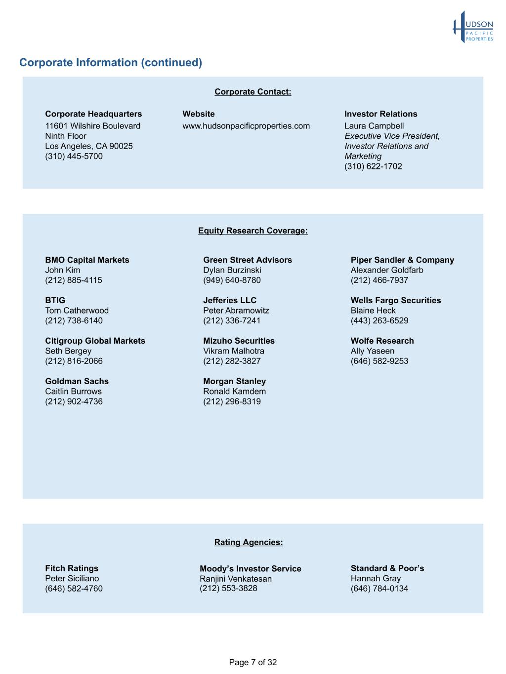 Page 7 of 32 Corporate Information (continued) BMO Capital Markets John Kim (212) 885-4115 BTIG Tom Catherwood (212) 738-6140 Citigroup Global Markets Seth Bergey (212) 816-2066 Goldman Sachs Caitlin Burrows (212) 902-4736 Piper Sandler & Company Alexander Goldfarb (212) 466-7937 Wells Fargo Securities Blaine Heck (443) 263-6529 Wolfe Research Ally Yaseen (646) 582-9253 Fitch Ratings Peter Siciliano (646) 582-4760 Moody’s Investor Service Ranjini Venkatesan (212) 553-3828 Standard & Poor’s Hannah Gray (646) 784-0134 Equity Research Coverage: Green Street Advisors Dylan Burzinski (949) 640-8780 Jefferies LLC Peter Abramowitz (212) 336-7241 Mizuho Securities Vikram Malhotra (212) 282-3827 Morgan Stanley Ronald Kamdem (212) 296-8319 Rating Agencies: Corporate Contact: Corporate Headquarters 11601 Wilshire Boulevard Ninth Floor Los Angeles, CA 90025 (310) 445-5700 Website www.hudsonpacificproperties.com Investor Relations Laura Campbell Executive Vice President, Investor Relations and Marketing (310) 622-1702