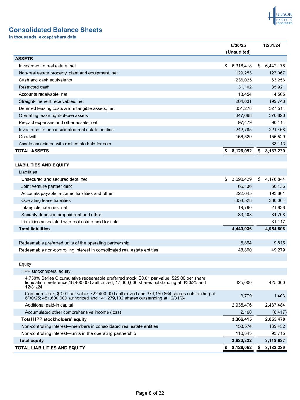 Page 8 of 32 Consolidated Balance Sheets In thousands, except share data 6/30/25 12/31/24 (Unaudited) ASSETS Investment in real estate, net $ 6,316,418 $ 6,442,178 Non-real estate property, plant and equipment, net 129,253 127,067 Cash and cash equivalents 236,025 63,256 Restricted cash 31,102 35,921 Accounts receivable, net 13,454 14,505 Straight-line rent receivables, net 204,031 199,748 Deferred leasing costs and intangible assets, net 351,278 327,514 Operating lease right-of-use assets 347,698 370,826 Prepaid expenses and other assets, net 97,479 90,114 Investment in unconsolidated real estate entities 242,785 221,468 Goodwill 156,529 156,529 Assets associated with real estate held for sale — 83,113 TOTAL ASSETS $ 8,126,052 $ 8,132,239 LIABILITIES AND EQUITY Liabilities Unsecured and secured debt, net $ 3,690,429 $ 4,176,844 Joint venture partner debt 66,136 66,136 Accounts payable, accrued liabilities and other 222,645 193,861 Operating lease liabilities 358,528 380,004 Intangible liabilities, net 19,790 21,838 Security deposits, prepaid rent and other 83,408 84,708 Liabilities associated with real estate held for sale — 31,117 Total liabilities 4,440,936 4,954,508 Redeemable preferred units of the operating partnership 5,894 9,815 Redeemable non-controlling interest in consolidated real estate entities 48,890 49,279 Equity HPP stockholders' equity: 4.750% Series C cumulative redeemable preferred stock, $0.01 par value, $25.00 per share liquidation preference,18,400,000 authorized, 17,000,000 shares outstanding at 6/30/25 and 12/31/24 425,000 425,000 Common stock, $0.01 par value, 722,400,000 authorized and 379,150,864 shares outstanding at 6/30/25; 481,600,000 authorized and 141,279,102 shares outstanding at 12/31/24 3,779 1,403 Additional paid-in capital 2,935,476 2,437,484 Accumulated other comprehensive income (loss) 2,160 (8,417) Total HPP stockholders’ equity 3,366,415 2,855,470 Non-controlling interest—members in consolidated real estate entities 153,574 169,452 Non-controlling interest—units in the operating partnership 110,343 93,715 Total equity 3,630,332 3,118,637 TOTAL LIABILITIES AND EQUITY $ 8,126,052 $ 8,132,239