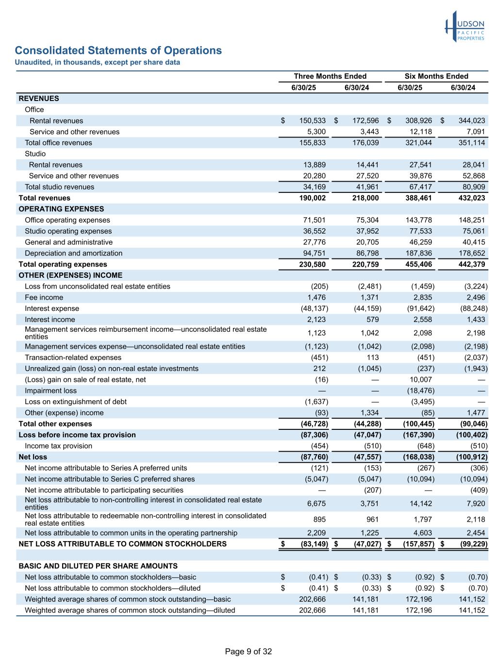 Page 9 of 32 Consolidated Statements of Operations Unaudited, in thousands, except per share data Three Months Ended Six Months Ended 6/30/25 6/30/24 6/30/25 6/30/24 REVENUES Office Rental revenues $ 150,533 $ 172,596 $ 308,926 $ 344,023 Service and other revenues 5,300 3,443 12,118 7,091 Total office revenues 155,833 176,039 321,044 351,114 Studio Rental revenues 13,889 14,441 27,541 28,041 Service and other revenues 20,280 27,520 39,876 52,868 Total studio revenues 34,169 41,961 67,417 80,909 Total revenues 190,002 218,000 388,461 432,023 OPERATING EXPENSES Office operating expenses 71,501 75,304 143,778 148,251 Studio operating expenses 36,552 37,952 77,533 75,061 General and administrative 27,776 20,705 46,259 40,415 Depreciation and amortization 94,751 86,798 187,836 178,652 Total operating expenses 230,580 220,759 455,406 442,379 OTHER (EXPENSES) INCOME Loss from unconsolidated real estate entities (205) (2,481) (1,459) (3,224) Fee income 1,476 1,371 2,835 2,496 Interest expense (48,137) (44,159) (91,642) (88,248) Interest income 2,123 579 2,558 1,433 Management services reimbursement income—unconsolidated real estate entities 1,123 1,042 2,098 2,198 Management services expense—unconsolidated real estate entities (1,123) (1,042) (2,098) (2,198) Transaction-related expenses (451) 113 (451) (2,037) Unrealized gain (loss) on non-real estate investments 212 (1,045) (237) (1,943) (Loss) gain on sale of real estate, net (16) — 10,007 — Impairment loss — — (18,476) — Loss on extinguishment of debt (1,637) — (3,495) — Other (expense) income (93) 1,334 (85) 1,477 Total other expenses (46,728) (44,288) (100,445) (90,046) Loss before income tax provision (87,306) (47,047) (167,390) (100,402) Income tax provision (454) (510) (648) (510) Net loss (87,760) (47,557) (168,038) (100,912) Net income attributable to Series A preferred units (121) (153) (267) (306) Net income attributable to Series C preferred shares (5,047) (5,047) (10,094) (10,094) Net income attributable to participating securities — (207) — (409) Net loss attributable to non-controlling interest in consolidated real estate entities 6,675 3,751 14,142 7,920 Net loss attributable to redeemable non-controlling interest in consolidated real estate entities 895 961 1,797 2,118 Net loss attributable to common units in the operating partnership 2,209 1,225 4,603 2,454 NET LOSS ATTRIBUTABLE TO COMMON STOCKHOLDERS $ (83,149) $ (47,027) $ (157,857) $ (99,229) BASIC AND DILUTED PER SHARE AMOUNTS Net loss attributable to common stockholders—basic $ (0.41) $ (0.33) $ (0.92) $ (0.70) Net loss attributable to common stockholders—diluted $ (0.41) $ (0.33) $ (0.92) $ (0.70) Weighted average shares of common stock outstanding—basic 202,666 141,181 172,196 141,152 Weighted average shares of common stock outstanding—diluted 202,666 141,181 172,196 141,152