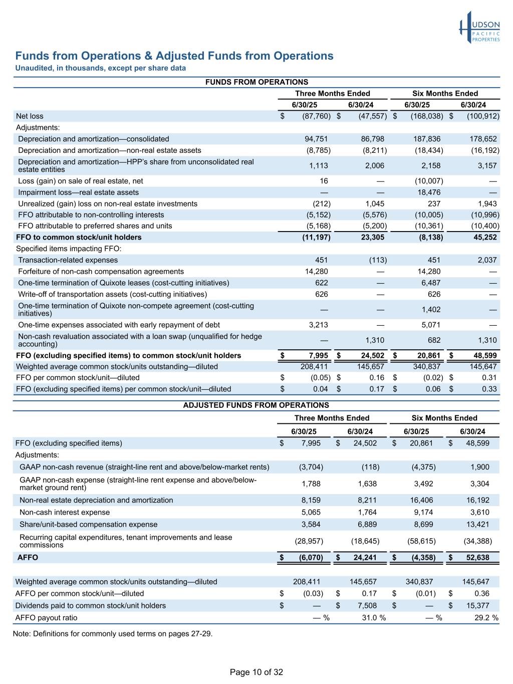 Page 10 of 32 Funds from Operations & Adjusted Funds from Operations Unaudited, in thousands, except per share data Note: Definitions for commonly used terms on pages 27-29. ADJUSTED FUNDS FROM OPERATIONS Three Months Ended Six Months Ended 6/30/25 6/30/24 6/30/25 6/30/24 FFO (excluding specified items) $ 7,995 $ 24,502 $ 20,861 $ 48,599 Adjustments: GAAP non-cash revenue (straight-line rent and above/below-market rents) (3,704) (118) (4,375) 1,900 GAAP non-cash expense (straight-line rent expense and above/below- market ground rent) 1,788 1,638 3,492 3,304 Non-real estate depreciation and amortization 8,159 8,211 16,406 16,192 Non-cash interest expense 5,065 1,764 9,174 3,610 Share/unit-based compensation expense 3,584 6,889 8,699 13,421 Recurring capital expenditures, tenant improvements and lease commissions (28,957) (18,645) (58,615) (34,388) AFFO $ (6,070) $ 24,241 $ (4,358) $ 52,638 Weighted average common stock/units outstanding—diluted 208,411 145,657 340,837 145,647 AFFO per common stock/unit—diluted $ (0.03) $ 0.17 $ (0.01) $ 0.36 Dividends paid to common stock/unit holders $ — $ 7,508 $ — $ 15,377 AFFO payout ratio — % 31.0 % — % 29.2 % FUNDS FROM OPERATIONS Three Months Ended Six Months Ended 6/30/25 6/30/24 6/30/25 6/30/24 Net loss $ (87,760) $ (47,557) $ (168,038) $ (100,912) Adjustments: Depreciation and amortization—consolidated 94,751 86,798 187,836 178,652 Depreciation and amortization—non-real estate assets (8,785) (8,211) (18,434) (16,192) Depreciation and amortization—HPP’s share from unconsolidated real estate entities 1,113 2,006 2,158 3,157 Loss (gain) on sale of real estate, net 16 — (10,007) — Impairment loss—real estate assets — — 18,476 — Unrealized (gain) loss on non-real estate investments (212) 1,045 237 1,943 FFO attributable to non-controlling interests (5,152) (5,576) (10,005) (10,996) FFO attributable to preferred shares and units (5,168) (5,200) (10,361) (10,400) FFO to common stock/unit holders (11,197) 23,305 (8,138) 45,252 Specified items impacting FFO: Transaction-related expenses 451 (113) 451 2,037 Forfeiture of non-cash compensation agreements 14,280 — 14,280 — One-time termination of Quixote leases (cost-cutting initiatives) 622 — 6,487 — Write-off of transportation assets (cost-cutting initiatives) 626 — 626 — One-time termination of Quixote non-compete agreement (cost-cutting initiatives) — — 1,402 — One-time expenses associated with early repayment of debt 3,213 — 5,071 — Non-cash revaluation associated with a loan swap (unqualified for hedge accounting) — 1,310 682 1,310 FFO (excluding specified items) to common stock/unit holders $ 7,995 $ 24,502 $ 20,861 $ 48,599 Weighted average common stock/units outstanding—diluted 208,411 145,657 340,837 145,647 FFO per common stock/unit—diluted $ (0.05) $ 0.16 $ (0.02) $ 0.31 FFO (excluding specified items) per common stock/unit—diluted $ 0.04 $ 0.17 $ 0.06 $ 0.33