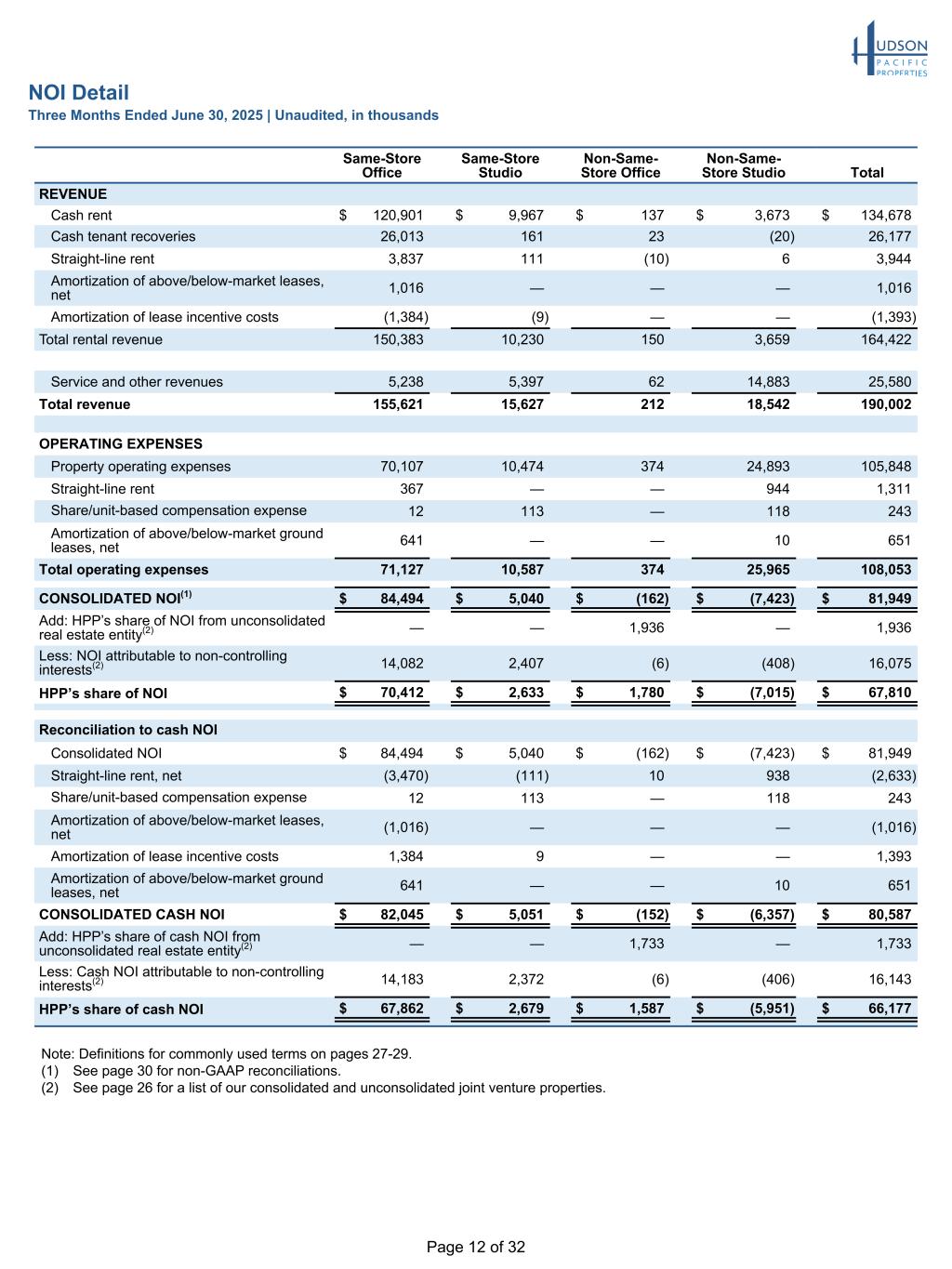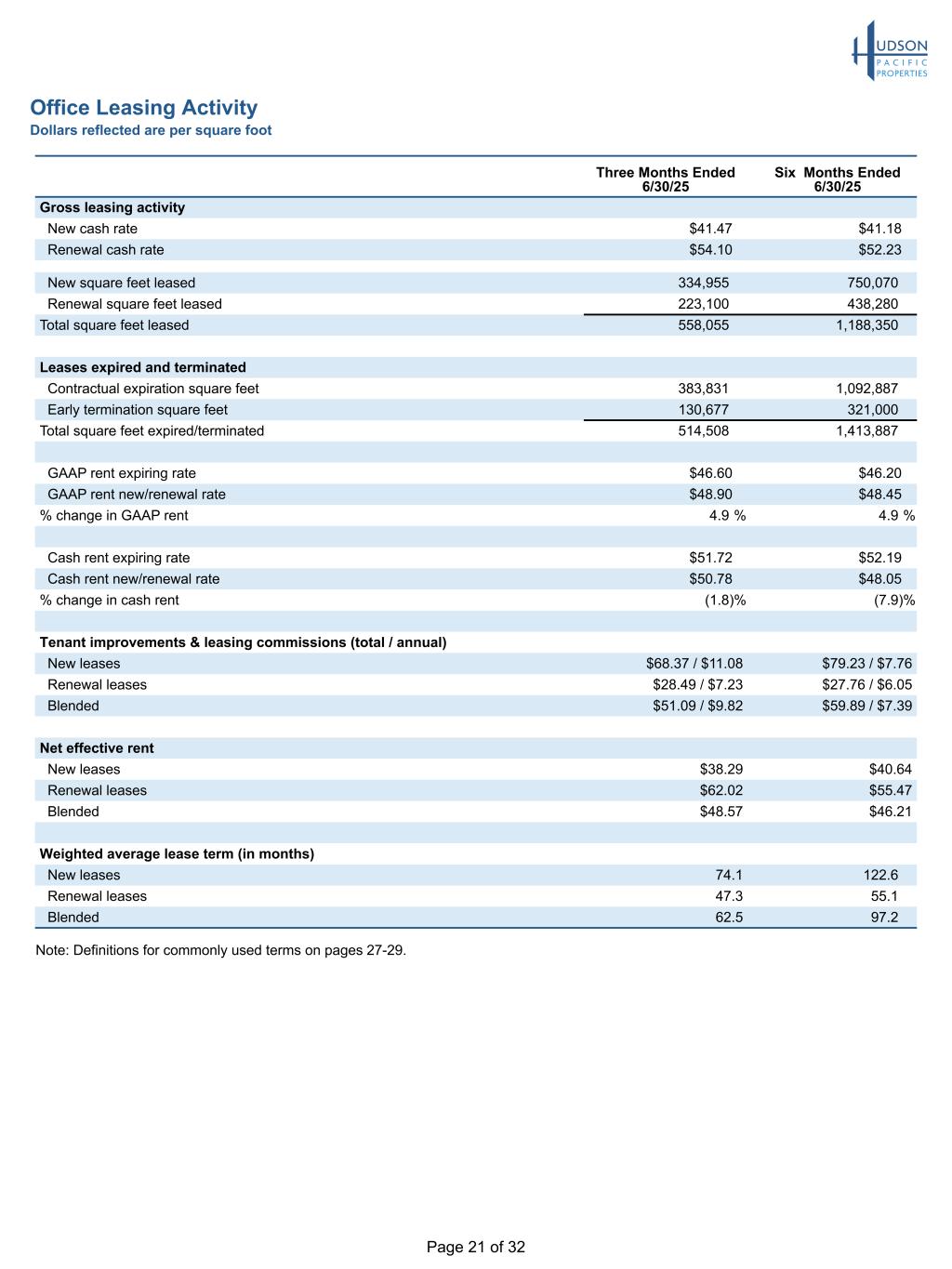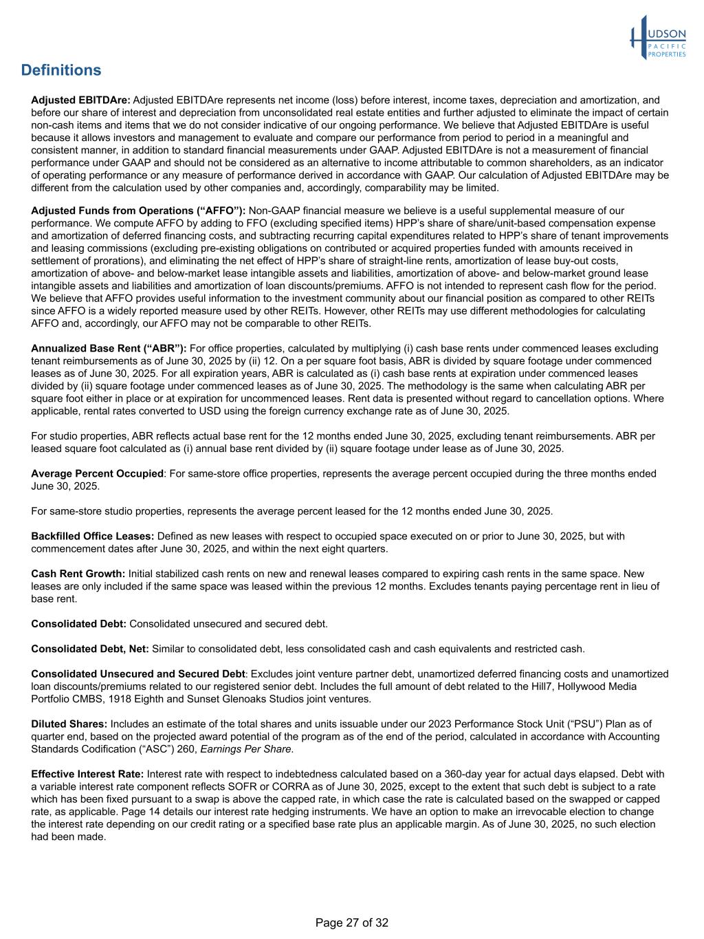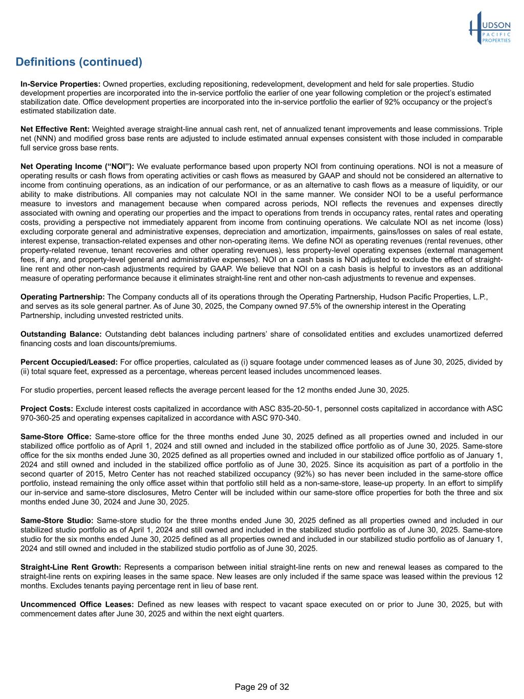 Page 29 of 32 In-Service Properties: Owned properties, excluding repositioning, redevelopment, development and held for sale properties. Studio development properties are incorporated into the in-service portfolio the earlier of one year following completion or the project’s estimated stabilization date. Office development properties are incorporated into the in-service portfolio the earlier of 92% occupancy or the project’s estimated stabilization date. Net Effective Rent: Weighted average straight-line annual cash rent, net of annualized tenant improvements and lease commissions. Triple net (NNN) and modified gross base rents are adjusted to include estimated annual expenses consistent with those included in comparable full service gross base rents. Net Operating Income (“NOI”): We evaluate performance based upon property NOI from continuing operations. NOI is not a measure of operating results or cash flows from operating activities or cash flows as measured by GAAP and should not be considered an alternative to income from continuing operations, as an indication of our performance, or as an alternative to cash flows as a measure of liquidity, or our ability to make distributions. All companies may not calculate NOI in the same manner. We consider NOI to be a useful performance measure to investors and management because when compared across periods, NOI reflects the revenues and expenses directly associated with owning and operating our properties and the impact to operations from trends in occupancy rates, rental rates and operating costs, providing a perspective not immediately apparent from income from continuing operations. We calculate NOI as net income (loss) excluding corporate general and administrative expenses, depreciation and amortization, impairments, gains/losses on sales of real estate, interest expense, transaction-related expenses and other non-operating items. We define NOI as operating revenues (rental revenues, other property-related revenue, tenant recoveries and other operating revenues), less property-level operating expenses (external management fees, if any, and property-level general and administrative expenses). NOI on a cash basis is NOI adjusted to exclude the effect of straight- line rent and other non-cash adjustments required by GAAP. We believe that NOI on a cash basis is helpful to investors as an additional measure of operating performance because it eliminates straight-line rent and other non-cash adjustments to revenue and expenses. Operating Partnership: The Company conducts all of its operations through the Operating Partnership, Hudson Pacific Properties, L.P., and serves as its sole general partner. As of June 30, 2025, the Company owned 97.5% of the ownership interest in the Operating Partnership, including unvested restricted units. Outstanding Balance: Outstanding debt balances including partners’ share of consolidated entities and excludes unamortized deferred financing costs and loan discounts/premiums. Percent Occupied/Leased: For office properties, calculated as (i) square footage under commenced leases as of June 30, 2025, divided by (ii) total square feet, expressed as a percentage, whereas percent leased includes uncommenced leases. For studio properties, percent leased reflects the average percent leased for the 12 months ended June 30, 2025. Project Costs: Exclude interest costs capitalized in accordance with ASC 835-20-50-1, personnel costs capitalized in accordance with ASC 970-360-25 and operating expenses capitalized in accordance with ASC 970-340. Same-Store Office: Same-store office for the three months ended June 30, 2025 defined as all properties owned and included in our stabilized office portfolio as of April 1, 2024 and still owned and included in the stabilized office portfolio as of June 30, 2025. Same-store office for the six months ended June 30, 2025 defined as all properties owned and included in our stabilized office portfolio as of January 1, 2024 and still owned and included in the stabilized office portfolio as of June 30, 2025. Since its acquisition as part of a portfolio in the second quarter of 2015, Metro Center has not reached stabilized occupancy (92%) so has never been included in the same-store office portfolio, instead remaining the only office asset within that portfolio still held as a non-same-store, lease-up property. In an effort to simplify our in-service and same-store disclosures, Metro Center will be included within our same-store office properties for both the three and six months ended June 30, 2024 and June 30, 2025. Same-Store Studio: Same-store studio for the three months ended June 30, 2025 defined as all properties owned and included in our stabilized studio portfolio as of April 1, 2024 and still owned and included in the stabilized studio portfolio as of June 30, 2025. Same-store studio for the six months ended June 30, 2025 defined as all properties owned and included in our stabilized studio portfolio as of January 1, 2024 and still owned and included in the stabilized studio portfolio as of June 30, 2025. Straight-Line Rent Growth: Represents a comparison between initial straight-line rents on new and renewal leases as compared to the straight-line rents on expiring leases in the same space. New leases are only included if the same space was leased within the previous 12 months. Excludes tenants paying percentage rent in lieu of base rent. Uncommenced Office Leases: Defined as new leases with respect to vacant space executed on or prior to June 30, 2025, but with commencement dates after June 30, 2025 and within the next eight quarters. Definitions (continued)