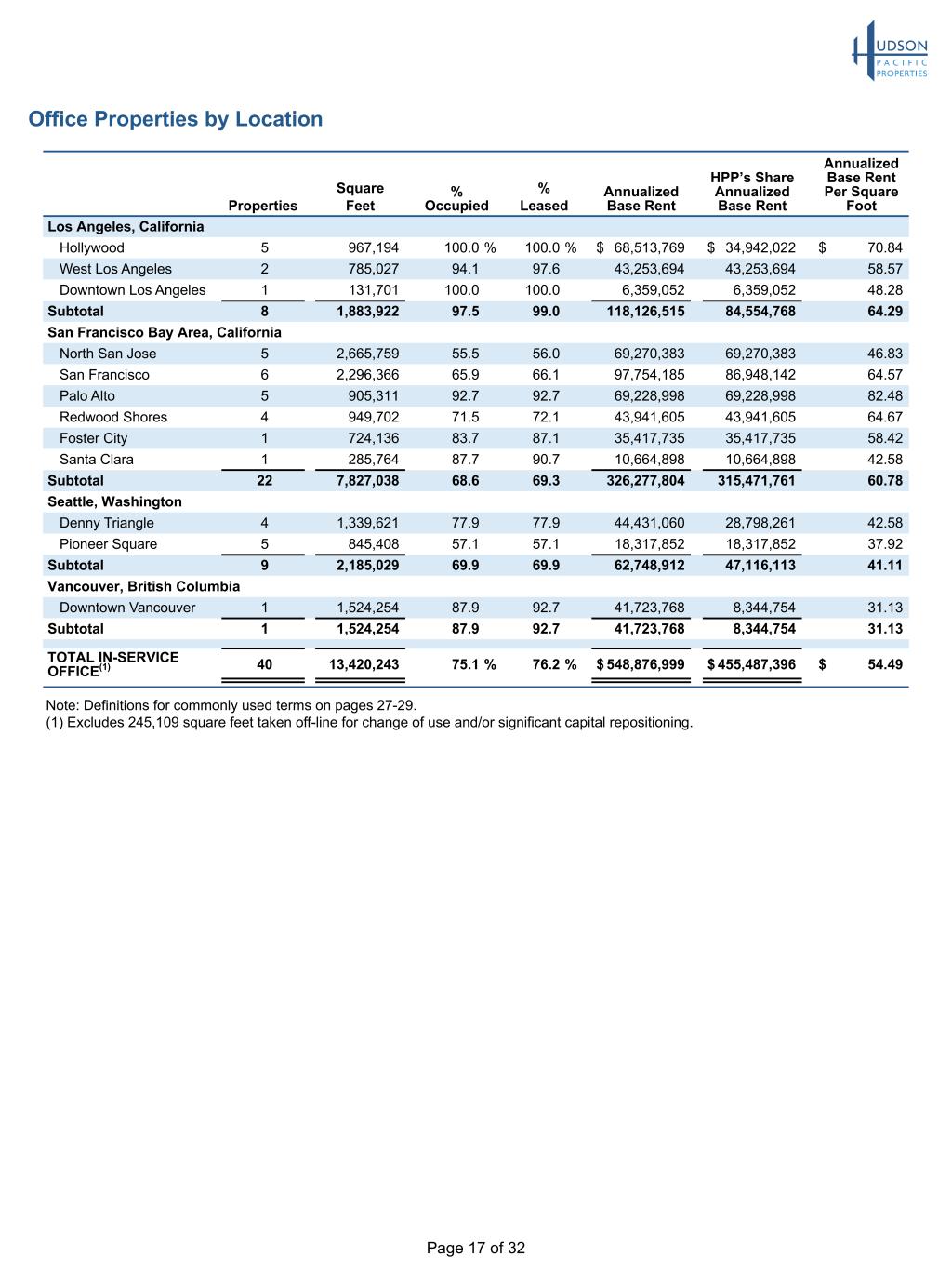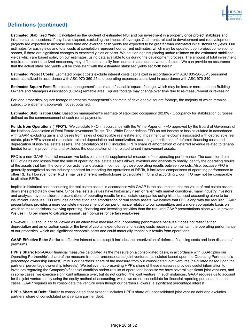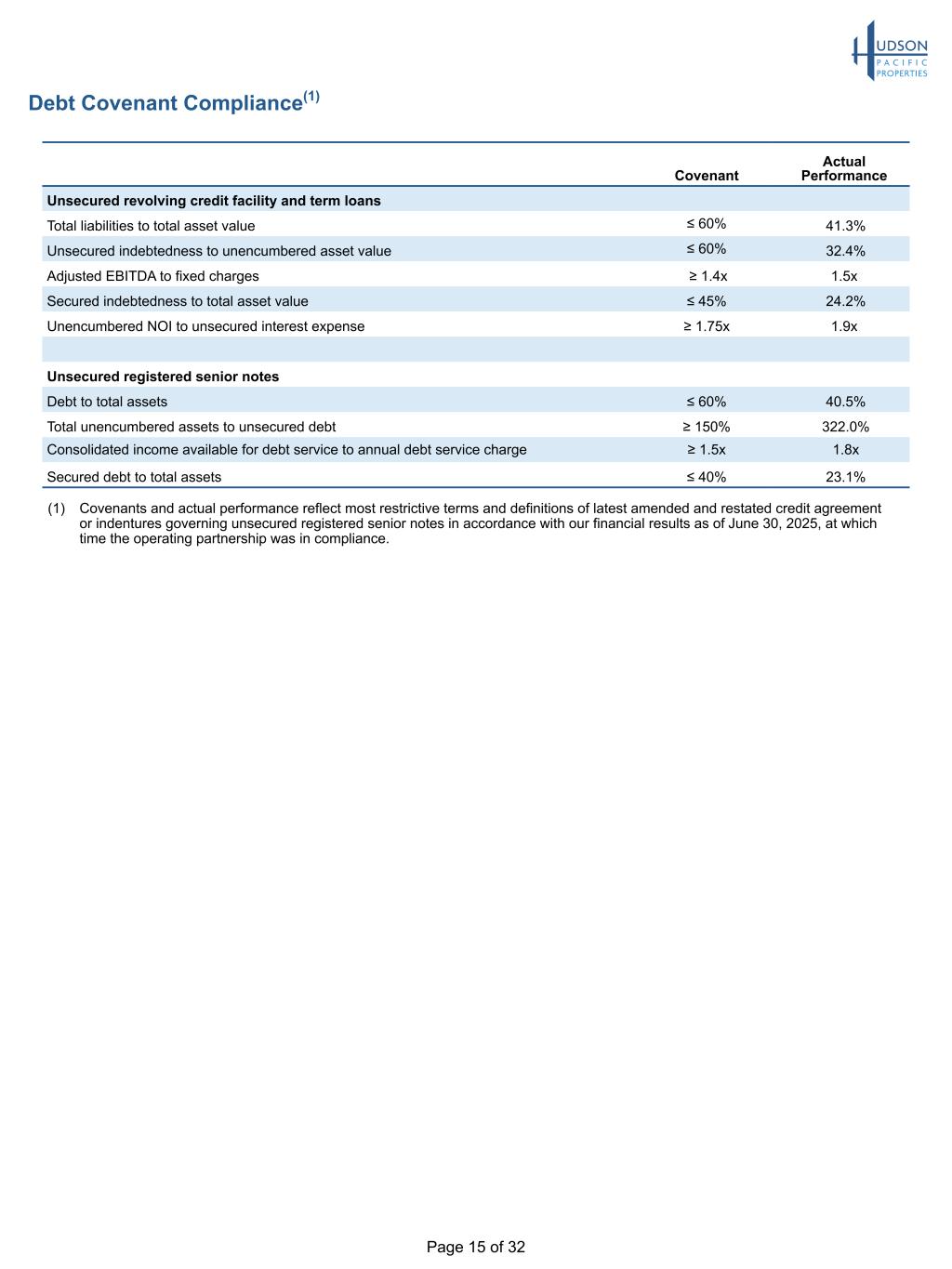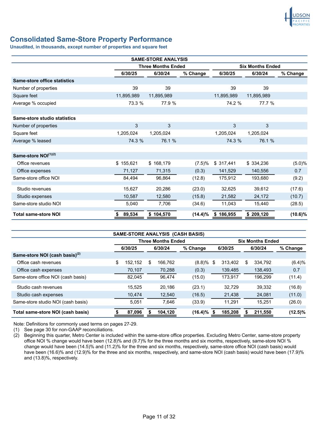 Page 29 of 32 In-Service Properties: Owned properties, excluding repositioning, redevelopment, development and held for sale properties. Studio development properties are incorporated into the in-service portfolio the earlier of one year following completion or the project’s estimated stabilization date. Office development properties are incorporated into the in-service portfolio the earlier of 92% occupancy or the project’s estimated stabilization date. Net Effective Rent: Weighted average straight-line annual cash rent, net of annualized tenant improvements and lease commissions. Triple net (NNN) and modified gross base rents are adjusted to include estimated annual expenses consistent with those included in comparable full service gross base rents. Net Operating Income (“NOI”): We evaluate performance based upon property NOI from continuing operations. NOI is not a measure of operating results or cash flows from operating activities or cash flows as measured by GAAP and should not be considered an alternative to income from continuing operations, as an indication of our performance, or as an alternative to cash flows as a measure of liquidity, or our ability to make distributions. All companies may not calculate NOI in the same manner. We consider NOI to be a useful performance measure to investors and management because when compared across periods, NOI reflects the revenues and expenses directly associated with owning and operating our properties and the impact to operations from trends in occupancy rates, rental rates and operating costs, providing a perspective not immediately apparent from income from continuing operations. We calculate NOI as net income (loss) excluding corporate general and administrative expenses, depreciation and amortization, impairments, gains/losses on sales of real estate, interest expense, transaction-related expenses and other non-operating items. We define NOI as operating revenues (rental revenues, other property-related revenue, tenant recoveries and other operating revenues), less property-level operating expenses (external management fees, if any, and property-level general and administrative expenses). NOI on a cash basis is NOI adjusted to exclude the effect of straight- line rent and other non-cash adjustments required by GAAP. We believe that NOI on a cash basis is helpful to investors as an additional measure of operating performance because it eliminates straight-line rent and other non-cash adjustments to revenue and expenses. Operating Partnership: The Company conducts all of its operations through the Operating Partnership, Hudson Pacific Properties, L.P., and serves as its sole general partner. As of June 30, 2025, the Company owned 97.5% of the ownership interest in the Operating Partnership, including unvested restricted units. Outstanding Balance: Outstanding debt balances including partners’ share of consolidated entities and excludes unamortized deferred financing costs and loan discounts/premiums. Percent Occupied/Leased: For office properties, calculated as (i) square footage under commenced leases as of June 30, 2025, divided by (ii) total square feet, expressed as a percentage, whereas percent leased includes uncommenced leases. For studio properties, percent leased reflects the average percent leased for the 12 months ended June 30, 2025. Project Costs: Exclude interest costs capitalized in accordance with ASC 835-20-50-1, personnel costs capitalized in accordance with ASC 970-360-25 and operating expenses capitalized in accordance with ASC 970-340. Same-Store Office: Same-store office for the three months ended June 30, 2025 defined as all properties owned and included in our stabilized office portfolio as of April 1, 2024 and still owned and included in the stabilized office portfolio as of June 30, 2025. Same-store office for the six months ended June 30, 2025 defined as all properties owned and included in our stabilized office portfolio as of January 1, 2024 and still owned and included in the stabilized office portfolio as of June 30, 2025. Since its acquisition as part of a portfolio in the second quarter of 2015, Metro Center has not reached stabilized occupancy (92%) so has never been included in the same-store office portfolio, instead remaining the only office asset within that portfolio still held as a non-same-store, lease-up property. In an effort to simplify our in-service and same-store disclosures, Metro Center will be included within our same-store office properties for both the three and six months ended June 30, 2024 and June 30, 2025. Same-Store Studio: Same-store studio for the three months ended June 30, 2025 defined as all properties owned and included in our stabilized studio portfolio as of April 1, 2024 and still owned and included in the stabilized studio portfolio as of June 30, 2025. Same-store studio for the six months ended June 30, 2025 defined as all properties owned and included in our stabilized studio portfolio as of January 1, 2024 and still owned and included in the stabilized studio portfolio as of June 30, 2025. Straight-Line Rent Growth: Represents a comparison between initial straight-line rents on new and renewal leases as compared to the straight-line rents on expiring leases in the same space. New leases are only included if the same space was leased within the previous 12 months. Excludes tenants paying percentage rent in lieu of base rent. Uncommenced Office Leases: Defined as new leases with respect to vacant space executed on or prior to June 30, 2025, but with commencement dates after June 30, 2025 and within the next eight quarters. Definitions (continued)