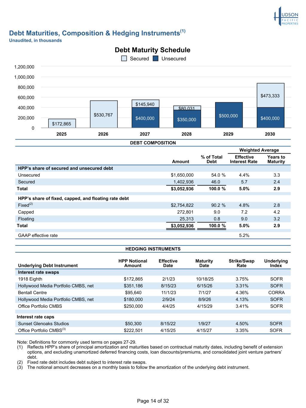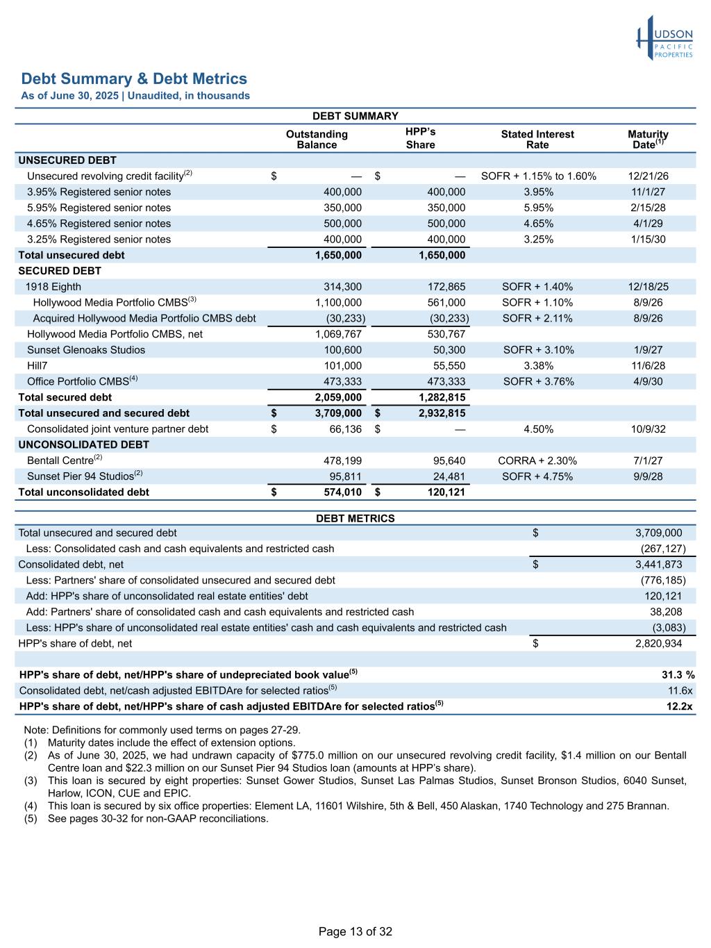 Page 13 of 32 Debt Summary & Debt Metrics As of June 30, 2025 | Unaudited, in thousands DEBT SUMMARY Outstanding Balance HPP’s Share Stated Interest Rate Maturity Date(1) UNSECURED DEBT Unsecured revolving credit facility(2) $ — $ — SOFR + 1.15% to 1.60% 12/21/26 3.95% Registered senior notes 400,000 400,000 3.95% 11/1/27 5.95% Registered senior notes 350,000 350,000 5.95% 2/15/28 4.65% Registered senior notes 500,000 500,000 4.65% 4/1/29 3.25% Registered senior notes 400,000 400,000 3.25% 1/15/30 Total unsecured debt 1,650,000 1,650,000 SECURED DEBT 1918 Eighth 314,300 172,865 SOFR + 1.40% 12/18/25 Hollywood Media Portfolio CMBS(3) 1,100,000 561,000 SOFR + 1.10% 8/9/26 Acquired Hollywood Media Portfolio CMBS debt (30,233) (30,233) SOFR + 2.11% 8/9/26 Hollywood Media Portfolio CMBS, net 1,069,767 530,767 Sunset Glenoaks Studios 100,600 50,300 SOFR + 3.10% 1/9/27 Hill7 101,000 55,550 3.38% 11/6/28 Office Portfolio CMBS(4) 473,333 473,333 SOFR + 3.76% 4/9/30 Total secured debt 2,059,000 1,282,815 Total unsecured and secured debt $ 3,709,000 $ 2,932,815 Consolidated joint venture partner debt $ 66,136 $ — 4.50% 10/9/32 UNCONSOLIDATED DEBT Bentall Centre(2) 478,199 95,640 CORRA + 2.30% 7/1/27 Sunset Pier 94 Studios(2) 95,811 24,481 SOFR + 4.75% 9/9/28 Total unconsolidated debt $ 574,010 $ 120,121 Note: Definitions for commonly used terms on pages 27-29. (1) Maturity dates include the effect of extension options. (2) As of June 30, 2025, we had undrawn capacity of $775.0 million on our unsecured revolving credit facility, $1.4 million on our Bentall Centre loan and $22.3 million on our Sunset Pier 94 Studios loan (amounts at HPP’s share). (3) This loan is secured by eight properties: Sunset Gower Studios, Sunset Las Palmas Studios, Sunset Bronson Studios, 6040 Sunset, Harlow, ICON, CUE and EPIC. (4) This loan is secured by six office properties: Element LA, 11601 Wilshire, 5th & Bell, 450 Alaskan, 1740 Technology and 275 Brannan. (5) See pages 30-32 for non-GAAP reconciliations. DEBT METRICS Total unsecured and secured debt $ 3,709,000 Less: Consolidated cash and cash equivalents and restricted cash (267,127) Consolidated debt, net $ 3,441,873 Less: Partners' share of consolidated unsecured and secured debt (776,185) Add: HPP's share of unconsolidated real estate entities' debt 120,121 Add: Partners' share of consolidated cash and cash equivalents and restricted cash 38,208 Less: HPP's share of unconsolidated real estate entities' cash and cash equivalents and restricted cash (3,083) HPP's share of debt, net $ 2,820,934 HPP's share of debt, net/HPP's share of undepreciated book value(5) 31.3 % Consolidated debt, net/cash adjusted EBITDAre for selected ratios(5) 11.6x HPP's share of debt, net/HPP's share of cash adjusted EBITDAre for selected ratios(5) 12.2x