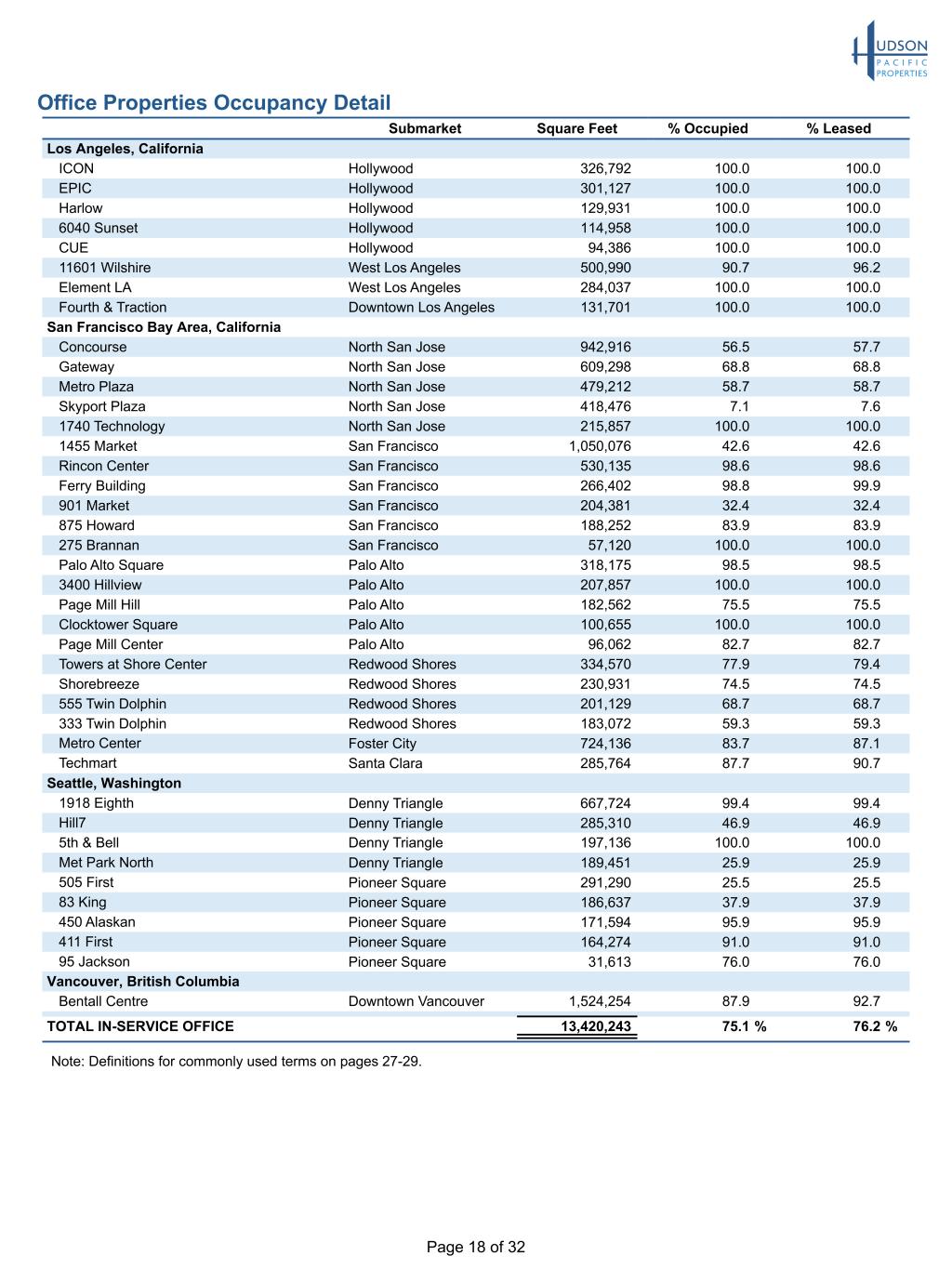 Page 18 of 32 Office Properties Occupancy Detail Submarket Square Feet % Occupied % Leased Los Angeles, California ICON Hollywood 326,792 100.0 100.0 EPIC Hollywood 301,127 100.0 100.0 Harlow Hollywood 129,931 100.0 100.0 6040 Sunset Hollywood 114,958 100.0 100.0 CUE Hollywood 94,386 100.0 100.0 11601 Wilshire West Los Angeles 500,990 90.7 96.2 Element LA West Los Angeles 284,037 100.0 100.0 Fourth & Traction Downtown Los Angeles 131,701 100.0 100.0 San Francisco Bay Area, California Concourse North San Jose 942,916 56.5 57.7 Gateway North San Jose 609,298 68.8 68.8 Metro Plaza North San Jose 479,212 58.7 58.7 Skyport Plaza North San Jose 418,476 7.1 7.6 1740 Technology North San Jose 215,857 100.0 100.0 1455 Market San Francisco 1,050,076 42.6 42.6 Rincon Center San Francisco 530,135 98.6 98.6 Ferry Building San Francisco 266,402 98.8 99.9 901 Market San Francisco 204,381 32.4 32.4 875 Howard San Francisco 188,252 83.9 83.9 275 Brannan San Francisco 57,120 100.0 100.0 Palo Alto Square Palo Alto 318,175 98.5 98.5 3400 Hillview Palo Alto 207,857 100.0 100.0 Page Mill Hill Palo Alto 182,562 75.5 75.5 Clocktower Square Palo Alto 100,655 100.0 100.0 Page Mill Center Palo Alto 96,062 82.7 82.7 Towers at Shore Center Redwood Shores 334,570 77.9 79.4 Shorebreeze Redwood Shores 230,931 74.5 74.5 555 Twin Dolphin Redwood Shores 201,129 68.7 68.7 333 Twin Dolphin Redwood Shores 183,072 59.3 59.3 Metro Center Foster City 724,136 83.7 87.1 Techmart Santa Clara 285,764 87.7 90.7 Seattle, Washington 1918 Eighth Denny Triangle 667,724 99.4 99.4 Hill7 Denny Triangle 285,310 46.9 46.9 5th & Bell Denny Triangle 197,136 100.0 100.0 Met Park North Denny Triangle 189,451 25.9 25.9 505 First Pioneer Square 291,290 25.5 25.5 83 King Pioneer Square 186,637 37.9 37.9 450 Alaskan Pioneer Square 171,594 95.9 95.9 411 First Pioneer Square 164,274 91.0 91.0 95 Jackson Pioneer Square 31,613 76.0 76.0 Vancouver, British Columbia Bentall Centre Downtown Vancouver 1,524,254 87.9 92.7 TOTAL IN-SERVICE OFFICE 13,420,243 75.1 % 76.2 % Note: Definitions for commonly used terms on pages 27-29.