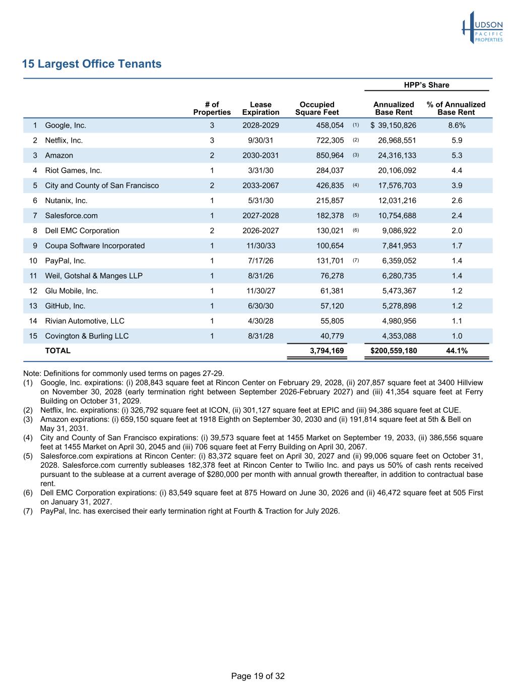 Page 19 of 32 Note: Definitions for commonly used terms on pages 27-29. (1) Google, Inc. expirations: (i) 208,843 square feet at Rincon Center on February 29, 2028, (ii) 207,857 square feet at 3400 Hillview on November 30, 2028 (early termination right between September 2026-February 2027) and (iii) 41,354 square feet at Ferry Building on October 31, 2029. (2) Netflix, Inc. expirations: (i) 326,792 square feet at ICON, (ii) 301,127 square feet at EPIC and (iii) 94,386 square feet at CUE. (3) Amazon expirations: (i) 659,150 square feet at 1918 Eighth on September 30, 2030 and (ii) 191,814 square feet at 5th & Bell on May 31, 2031. (4) City and County of San Francisco expirations: (i) 39,573 square feet at 1455 Market on September 19, 2033, (ii) 386,556 square feet at 1455 Market on April 30, 2045 and (iii) 706 square feet at Ferry Building on April 30, 2067. (5) Salesforce.com expirations at Rincon Center: (i) 83,372 square feet on April 30, 2027 and (ii) 99,006 square feet on October 31, 2028. Salesforce.com currently subleases 182,378 feet at Rincon Center to Twilio Inc. and pays us 50% of cash rents received pursuant to the sublease at a current average of $280,000 per month with annual growth thereafter, in addition to contractual base rent. (6) Dell EMC Corporation expirations: (i) 83,549 square feet at 875 Howard on June 30, 2026 and (ii) 46,472 square feet at 505 First on January 31, 2027. (7) PayPal, Inc. has exercised their early termination right at Fourth & Traction for July 2026. HPP’s Share # of Properties Lease Expiration Occupied Square Feet Annualized Base Rent % of Annualized Base Rent 1 Google, Inc. 3 2028-2029 458,054 (1) $ 39,150,826 8.6% 2 Netflix, Inc. 3 9/30/31 722,305 (2) 26,968,551 5.9 3 Amazon 2 2030-2031 850,964 (3) 24,316,133 5.3 4 Riot Games, Inc. 1 3/31/30 284,037 20,106,092 4.4 5 City and County of San Francisco 2 2033-2067 426,835 (4) 17,576,703 3.9 6 Nutanix, Inc. 1 5/31/30 215,857 12,031,216 2.6 7 Salesforce.com 1 2027-2028 182,378 (5) 10,754,688 2.4 8 Dell EMC Corporation 2 2026-2027 130,021 (6) 9,086,922 2.0 9 Coupa Software Incorporated 1 11/30/33 100,654 7,841,953 1.7 10 PayPal, Inc. 1 7/17/26 131,701 (7) 6,359,052 1.4 11 Weil, Gotshal & Manges LLP 1 8/31/26 76,278 6,280,735 1.4 12 Glu Mobile, Inc. 1 11/30/27 61,381 5,473,367 1.2 13 GitHub, Inc. 1 6/30/30 57,120 5,278,898 1.2 14 Rivian Automotive, LLC 1 4/30/28 55,805 4,980,956 1.1 15 Covington & Burling LLC 1 8/31/28 40,779 4,353,088 1.0 TOTAL 3,794,169 $ 200,559,180 44.1% 15 Largest Office Tenants