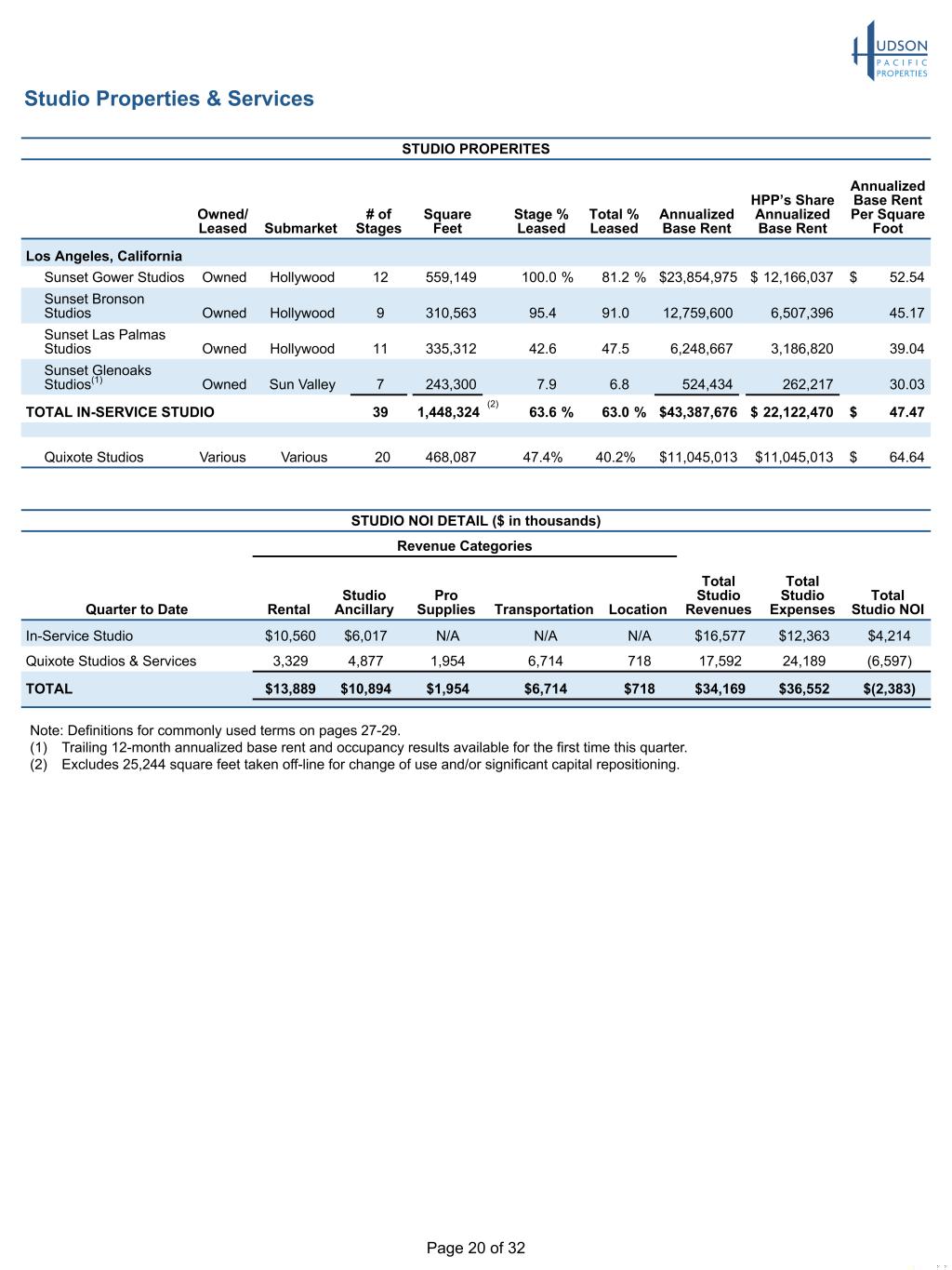 Page 20 of 32 Note: Definitions for commonly used terms on pages 27-29. (1) Trailing 12-month annualized base rent and occupancy results available for the first time this quarter. (2) Excludes 25,244 square feet taken off-line for change of use and/or significant capital repositioning. STUDIO PROPERITES Owned/ Leased Submarket # of Stages Square Feet Stage % Leased Total % Leased Annualized Base Rent HPP’s Share Annualized Base Rent Annualized Base Rent Per Square Foot Los Angeles, California Sunset Gower Studios Owned Hollywood 12 559,149 100.0 % 81.2 % $ 23,854,975 $ 12,166,037 $ 52.54 Sunset Bronson Studios Owned Hollywood 9 310,563 95.4 91.0 12,759,600 6,507,396 45.17 Sunset Las Palmas Studios Owned Hollywood 11 335,312 42.6 47.5 6,248,667 3,186,820 39.04 Sunset Glenoaks Studios(1) Owned Sun Valley 7 243,300 7.9 6.8 524,434 262,217 30.03 TOTAL IN-SERVICE STUDIO 39 1,448,324 (2) 63.6 % 63.0 % $ 43,387,676 $ 22,122,470 $ 47.47 Quixote Studios Various Various 20 468,087 47.4% 40.2% $11,045,013 $11,045,013 $ 64.64 Studio Properties & Services STUDIO NOI DETAIL ($ in thousands) Revenue Categories Quarter to Date Rental Studio Ancillary Pro Supplies Transportation Location Total Studio Revenues Total Studio Expenses Total Studio NOI In-Service Studio $10,560 $6,017 N/A N/A N/A $16,577 $12,363 $4,214 Quixote Studios & Services 3,329 4,877 1,954 6,714 718 17,592 24,189 (6,597) TOTAL $13,889 $10,894 $1,954 $6,714 $718 $34,169 $36,552 $(2,383)