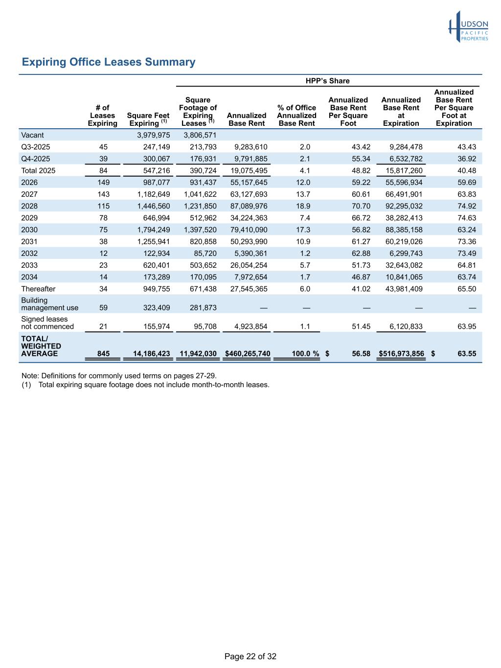 Page 22 of 32 Expiring Office Leases Summary HPP’s Share # of Leases Expiring Square Feet Expiring (1) Square Footage of Expiring Leases (1) Annualized Base Rent % of Office Annualized Base Rent Annualized Base Rent Per Square Foot Annualized Base Rent at Expiration Annualized Base Rent Per Square Foot at Expiration Vacant 3,979,975 3,806,571 Q3-2025 45 247,149 213,793 9,283,610 2.0 43.42 9,284,478 43.43 Q4-2025 39 300,067 176,931 9,791,885 2.1 55.34 6,532,782 36.92 Total 2025 84 547,216 390,724 19,075,495 4.1 48.82 15,817,260 40.48 2026 149 987,077 931,437 55,157,645 12.0 59.22 55,596,934 59.69 2027 143 1,182,649 1,041,622 63,127,693 13.7 60.61 66,491,901 63.83 2028 115 1,446,560 1,231,850 87,089,976 18.9 70.70 92,295,032 74.92 2029 78 646,994 512,962 34,224,363 7.4 66.72 38,282,413 74.63 2030 75 1,794,249 1,397,520 79,410,090 17.3 56.82 88,385,158 63.24 2031 38 1,255,941 820,858 50,293,990 10.9 61.27 60,219,026 73.36 2032 12 122,934 85,720 5,390,361 1.2 62.88 6,299,743 73.49 2033 23 620,401 503,652 26,054,254 5.7 51.73 32,643,082 64.81 2034 14 173,289 170,095 7,972,654 1.7 46.87 10,841,065 63.74 Thereafter 34 949,755 671,438 27,545,365 6.0 41.02 43,981,409 65.50 Building management use 59 323,409 281,873 — — — — — Signed leases not commenced 21 155,974 95,708 4,923,854 1.1 51.45 6,120,833 63.95 TOTAL/ WEIGHTED AVERAGE 845 14,186,423 11,942,030 $ 460,265,740 100.0 % $ 56.58 $ 516,973,856 $ 63.55 Note: Definitions for commonly used terms on pages 27-29. (1) Total expiring square footage does not include month-to-month leases.