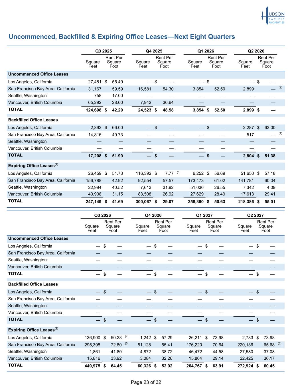 Page 23 of 32 Uncommenced, Backfilled & Expiring Office Leases—Next Eight Quarters Q3 2025 Q4 2025 Q1 2026 Q2 2026 Square Feet Rent Per Square Foot Square Feet Rent Per Square Foot Square Feet Rent Per Square Foot Square Feet Rent Per Square Foot Uncommenced Office Leases Los Angeles, California 27,481 $ 55.49 — $ — — $ — — $ — San Francisco Bay Area, California 31,167 59.59 16,581 54.30 3,854 52.50 2,899 — (1) Seattle, Washington 758 17.00 — — — — — — Vancouver, British Columbia 65,292 28.60 7,942 36.64 — — — — TOTAL 124,698 $ 42.20 24,523 $ 48.58 3,854 $ 52.50 2,899 $ — Backfilled Office Leases Los Angeles, California 2,392 $ 66.00 — $ — — $ — 2,287 $ 63.00 San Francisco Bay Area, California 14,816 49.73 — — — — 517 — (1) Seattle, Washington — — — — — — — — Vancouver, British Columbia — — — — — — — — TOTAL 17,208 $ 51.99 — $ — — $ — 2,804 $ 51.38 Expiring Office Leases(2) Los Angeles, California 26,459 $ 51.73 116,392 $ 7.77 (3) 6,252 $ 56.69 51,650 $ 57.18 San Francisco Bay Area, California 156,788 42.92 92,554 57.57 173,473 61.02 141,781 60.04 Seattle, Washington 22,994 40.52 7,613 31.92 51,036 26.55 7,342 4.09 Vancouver, British Columbia 40,908 31.15 83,508 26.92 27,629 28.49 17,613 29.41 TOTAL 247,149 $ 41.69 300,067 $ 29.07 258,390 $ 50.63 218,386 $ 55.01 Q3 2026 Q4 2026 Q1 2027 Q2 2027 Square Feet Rent Per Square Foot Square Feet Rent Per Square Foot Square Feet Rent Per Square Foot Square Feet Rent Per Square Foot Uncommenced Office Leases Los Angeles, California — $ — — $ — — $ — — $ — San Francisco Bay Area, California — — — — — — — — Seattle, Washington — — — — — — — — Vancouver, British Columbia — — — — — — — — TOTAL — $ — — $ — — $ — — $ — Backfilled Office Leases Los Angeles, California — $ — — $ — — $ — — $ — San Francisco Bay Area, California — — — — — — — — Seattle, Washington — — — — — — — — Vancouver, British Columbia — — — — — — — — TOTAL — $ — — $ — — $ — — $ — Expiring Office Leases(2) Los Angeles, California 136,900 $ 50.28 (4) 1,242 $ 57.29 26,211 $ 73.98 2,783 $ 73.98 San Francisco Bay Area, California 295,398 72.80 (5) 51,128 55.41 176,220 70.64 220,136 65.68 (6) Seattle, Washington 1,861 41.80 4,872 38.72 46,472 44.58 27,580 37.08 Vancouver, British Columbia 15,816 33.92 3,084 32.26 15,864 29.14 22,425 36.17 TOTAL 449,975 $ 64.45 60,326 $ 52.92 264,767 $ 63.91 272,924 $ 60.45