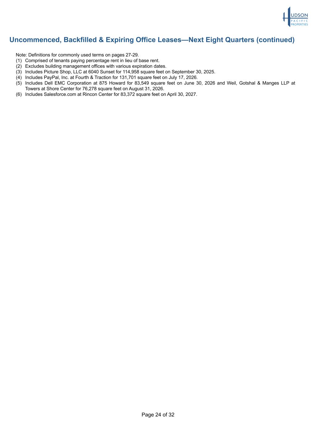Page 24 of 32 Uncommenced, Backfilled & Expiring Office Leases—Next Eight Quarters (continued) Note: Definitions for commonly used terms on pages 27-29. (1) Comprised of tenants paying percentage rent in lieu of base rent. (2) Excludes building management offices with various expiration dates. (3) Includes Picture Shop, LLC at 6040 Sunset for 114,958 square feet on September 30, 2025. (4) Includes PayPal, Inc. at Fourth & Traction for 131,701 square feet on July 17, 2026. (5) Includes Dell EMC Corporation at 875 Howard for 83,549 square feet on June 30, 2026 and Weil, Gotshal & Manges LLP at Towers at Shore Center for 76,278 square feet on August 31, 2026. (6) Includes Salesforce.com at Rincon Center for 83,372 square feet on April 30, 2027.