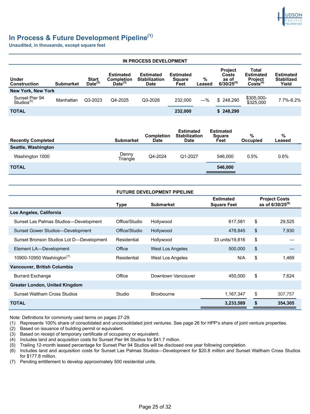 Page 25 of 32 In Process & Future Development Pipeline(1) Unaudited, in thousands, except square feet Note: Definitions for commonly used terms on pages 27-29. (1) Represents 100% share of consolidated and unconsolidated joint ventures. See page 26 for HPP’s share of joint venture properties. (2) Based on issuance of building permit or equivalent. (3) Based on receipt of temporary certificate of occupancy or equivalent. (4) Includes land and acquisition costs for Sunset Pier 94 Studios for $41.7 million. (5) Trailing 12-month leased percentage for Sunset Pier 94 Studios will be disclosed one year following completion. (6) Includes land and acquisition costs for Sunset Las Palmas Studios—Development for $20.8 million and Sunset Waltham Cross Studios for $177.8 million. (7) Pending entitlement to develop approximately 500 residential units. IN PROCESS DEVELOPMENT Under Construction Submarket Start Date(2) Estimated Completion Date(3) Estimated Stabilization Date Estimated Square Feet % Leased Project Costs as of 6/30/25(4) Total Estimated Project Costs(4) Estimated Stabilized Yield New York, New York Sunset Pier 94 Studios(5) Manhattan Q3-2023 Q4-2025 Q3-2026 232,000 —% $ 248,290 $305,000- $325,000 7.7%-8.2% TOTAL 232,000 $ 248,290 FUTURE DEVELOPMENT PIPELINE Type Submarket Estimated Square Feet Project Costs as of 6/30/25(6) Los Angeles, California Sunset Las Palmas Studios—Development Office/Studio Hollywood 617,581 $ 29,525 Sunset Gower Studios—Development Office/Studio Hollywood 478,845 $ 7,930 Sunset Bronson Studios Lot D—Development Residential Hollywood 33 units/19,816 $ — Element LA—Development Office West Los Angeles 500,000 $ — 10900-10950 Washington(7) Residential West Los Angeles N/A $ 1,469 Vancouver, British Columbia Burrard Exchange Office Downtown Vancouver 450,000 $ 7,624 Greater London, United Kingdom Sunset Waltham Cross Studios Studio Broxbourne 1,167,347 $ 307,757 TOTAL 3,233,589 $ 354,305 Recently Completed Submarket Completion Date Estimated Stabilization Date Estimated Square Feet % Occupied % Leased Seattle, Washington Washington 1000 Denny Triangle Q4-2024 Q1-2027 546,000 0.5% 0.6% TOTAL 546,000