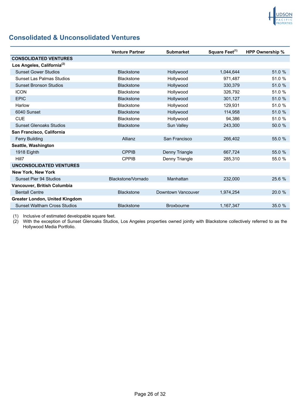 Page 26 of 32 Consolidated & Unconsolidated Ventures Venture Partner Submarket Square Feet(1) HPP Ownership % CONSOLIDATED VENTURES Los Angeles, California(2) Sunset Gower Studios Blackstone Hollywood 1,044,644 51.0 % Sunset Las Palmas Studios Blackstone Hollywood 971,487 51.0 % Sunset Bronson Studios Blackstone Hollywood 330,379 51.0 % ICON Blackstone Hollywood 326,792 51.0 % EPIC Blackstone Hollywood 301,127 51.0 % Harlow Blackstone Hollywood 129,931 51.0 % 6040 Sunset Blackstone Hollywood 114,958 51.0 % CUE Blackstone Hollywood 94,386 51.0 % Sunset Glenoaks Studios Blackstone Sun Valley 243,300 50.0 % San Francisco, California Ferry Building Allianz San Francisco 266,402 55.0 % Seattle, Washington 1918 Eighth CPPIB Denny Triangle 667,724 55.0 % Hill7 CPPIB Denny Triangle 285,310 55.0 % UNCONSOLIDATED VENTURES New York, New York Sunset Pier 94 Studios Blackstone/Vornado Manhattan 232,000 25.6 % Vancouver, British Columbia Bentall Centre Blackstone Downtown Vancouver 1,974,254 20.0 % Greater London, United Kingdom Sunset Waltham Cross Studios Blackstone Broxbourne 1,167,347 35.0 % (1) Inclusive of estimated developable square feet. (2) With the exception of Sunset Glenoaks Studios, Los Angeles properties owned jointly with Blackstone collectively referred to as the Hollywood Media Portfolio.