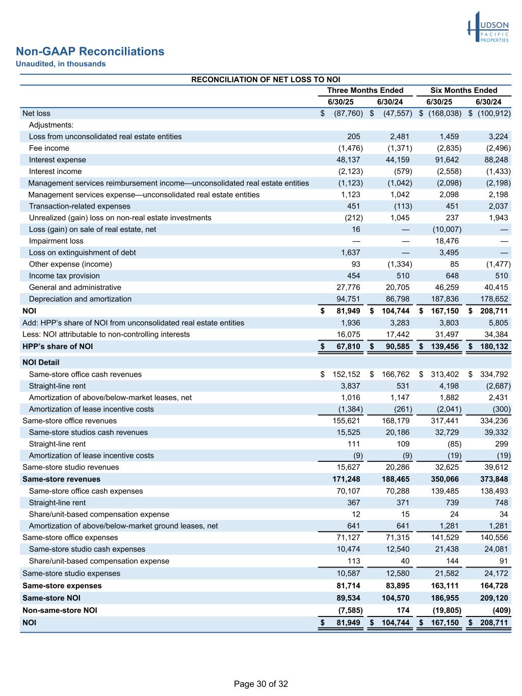 Page 30 of 32 Non-GAAP Reconciliations Unaudited, in thousands RECONCILIATION OF NET LOSS TO NOI Three Months Ended Six Months Ended 6/30/25 6/30/24 6/30/25 6/30/24 Net loss $ (87,760) $ (47,557) $ (168,038) $ (100,912) Adjustments: Loss from unconsolidated real estate entities 205 2,481 1,459 3,224 Fee income (1,476) (1,371) (2,835) (2,496) Interest expense 48,137 44,159 91,642 88,248 Interest income (2,123) (579) (2,558) (1,433) Management services reimbursement income—unconsolidated real estate entities (1,123) (1,042) (2,098) (2,198) Management services expense—unconsolidated real estate entities 1,123 1,042 2,098 2,198 Transaction-related expenses 451 (113) 451 2,037 Unrealized (gain) loss on non-real estate investments (212) 1,045 237 1,943 Loss (gain) on sale of real estate, net 16 — (10,007) — Impairment loss — — 18,476 — Loss on extinguishment of debt 1,637 — 3,495 — Other expense (income) 93 (1,334) 85 (1,477) Income tax provision 454 510 648 510 General and administrative 27,776 20,705 46,259 40,415 Depreciation and amortization 94,751 86,798 187,836 178,652 NOI $ 81,949 $ 104,744 $ 167,150 $ 208,711 Add: HPP’s share of NOI from unconsolidated real estate entities 1,936 3,283 3,803 5,805 Less: NOI attributable to non-controlling interests 16,075 17,442 31,497 34,384 HPP’s share of NOI $ 67,810 $ 90,585 $ 139,456 $ 180,132 NOI Detail Same-store office cash revenues $ 152,152 $ 166,762 $ 313,402 $ 334,792 Straight-line rent 3,837 531 4,198 (2,687) Amortization of above/below-market leases, net 1,016 1,147 1,882 2,431 Amortization of lease incentive costs (1,384) (261) (2,041) (300) Same-store office revenues 155,621 168,179 317,441 334,236 Same-store studios cash revenues 15,525 20,186 32,729 39,332 Straight-line rent 111 109 (85) 299 Amortization of lease incentive costs (9) (9) (19) (19) Same-store studio revenues 15,627 20,286 32,625 39,612 Same-store revenues 171,248 188,465 350,066 373,848 Same-store office cash expenses 70,107 70,288 139,485 138,493 Straight-line rent 367 371 739 748 Share/unit-based compensation expense 12 15 24 34 Amortization of above/below-market ground leases, net 641 641 1,281 1,281 Same-store office expenses 71,127 71,315 141,529 140,556 Same-store studio cash expenses 10,474 12,540 21,438 24,081 Share/unit-based compensation expense 113 40 144 91 Same-store studio expenses 10,587 12,580 21,582 24,172 Same-store expenses 81,714 83,895 163,111 164,728 Same-store NOI 89,534 104,570 186,955 209,120 Non-same-store NOI (7,585) 174 (19,805) (409) NOI $ 81,949 $ 104,744 $ 167,150 $ 208,711