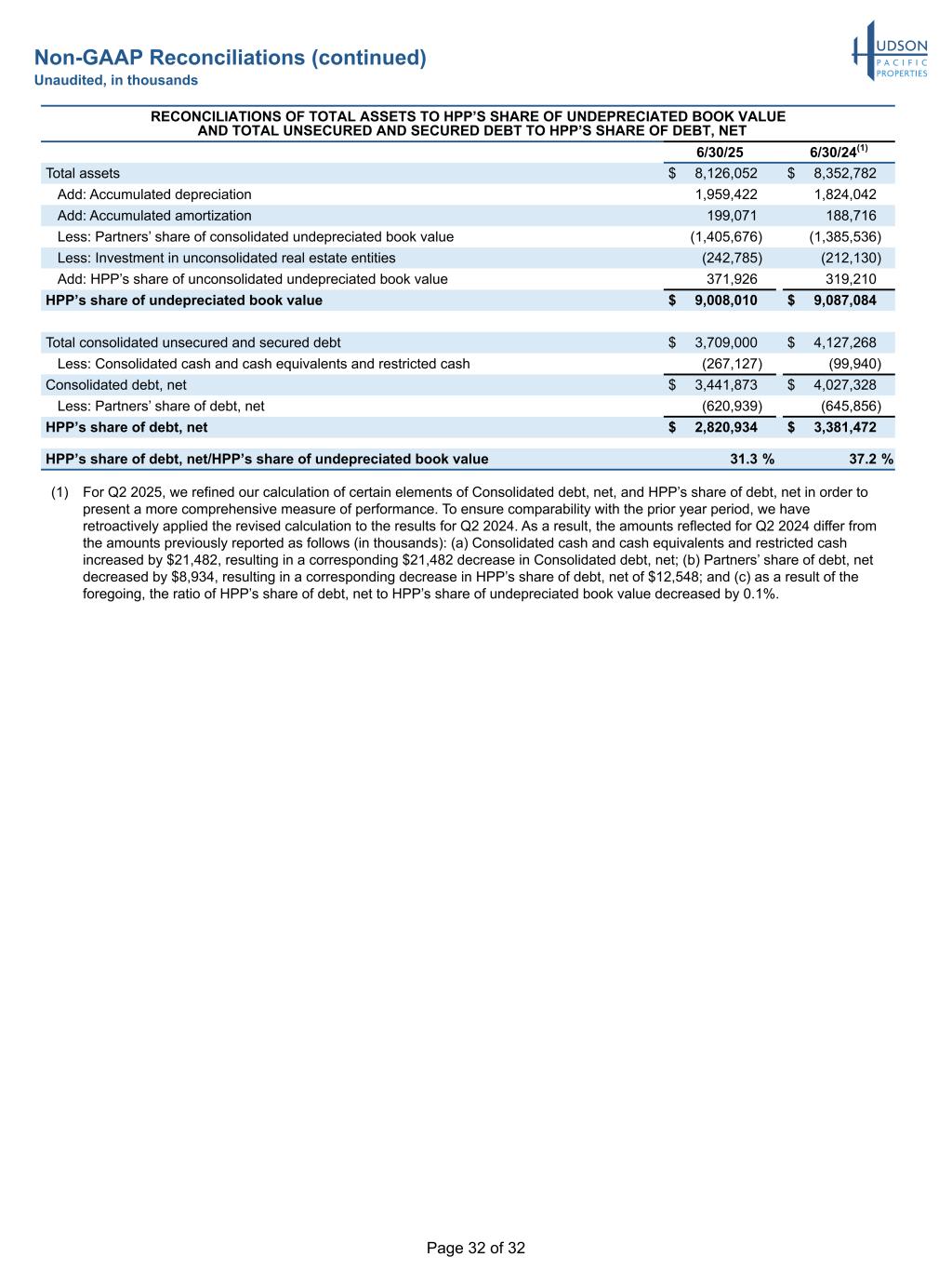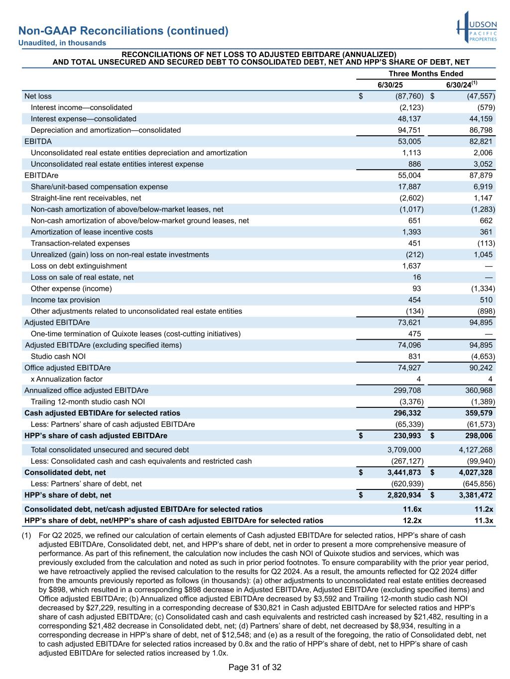 Page 31 of 32 Non-GAAP Reconciliations (continued) Unaudited, in thousands RECONCILIATIONS OF NET LOSS TO ADJUSTED EBITDARE (ANNUALIZED) AND TOTAL UNSECURED AND SECURED DEBT TO CONSOLIDATED DEBT, NET AND HPP’S SHARE OF DEBT, NET Three Months Ended 6/30/25 6/30/24(1) Net loss $ (87,760) $ (47,557) Interest income—consolidated (2,123) (579) Interest expense—consolidated 48,137 44,159 Depreciation and amortization—consolidated 94,751 86,798 EBITDA 53,005 82,821 Unconsolidated real estate entities depreciation and amortization 1,113 2,006 Unconsolidated real estate entities interest expense 886 3,052 EBITDAre 55,004 87,879 Share/unit-based compensation expense 17,887 6,919 Straight-line rent receivables, net (2,602) 1,147 Non-cash amortization of above/below-market leases, net (1,017) (1,283) Non-cash amortization of above/below-market ground leases, net 651 662 Amortization of lease incentive costs 1,393 361 Transaction-related expenses 451 (113) Unrealized (gain) loss on non-real estate investments (212) 1,045 Loss on debt extinguishment 1,637 — Loss on sale of real estate, net 16 — Other expense (income) 93 (1,334) Income tax provision 454 510 Other adjustments related to unconsolidated real estate entities (134) (898) Adjusted EBITDAre 73,621 94,895 One-time termination of Quixote leases (cost-cutting initiatives) 475 — Adjusted EBITDAre (excluding specified items) 74,096 94,895 Studio cash NOI 831 (4,653) Office adjusted EBITDAre 74,927 90,242 x Annualization factor 4 4 Annualized office adjusted EBITDAre 299,708 360,968 Trailing 12-month studio cash NOI (3,376) (1,389) Cash adjusted EBTIDAre for selected ratios 296,332 359,579 Less: Partners’ share of cash adjusted EBITDAre (65,339) (61,573) HPP’s share of cash adjusted EBITDAre $ 230,993 $ 298,006 Total consolidated unsecured and secured debt 3,709,000 4,127,268 Less: Consolidated cash and cash equivalents and restricted cash (267,127) (99,940) Consolidated debt, net $ 3,441,873 $ 4,027,328 Less: Partners’ share of debt, net (620,939) (645,856) HPP’s share of debt, net $ 2,820,934 $ 3,381,472 Consolidated debt, net/cash adjusted EBITDAre for selected ratios 11.6x 11.2x HPP’s share of debt, net/HPP’s share of cash adjusted EBITDAre for selected ratios 12.2x 11.3x (1) For Q2 2025, we refined our calculation of certain elements of Cash adjusted EBITDAre for selected ratios, HPP’s share of cash adjusted EBITDAre, Consolidated debt, net, and HPP’s share of debt, net in order to present a more comprehensive measure of performance. As part of this refinement, the calculation now includes the cash NOI of Quixote studios and services, which was previously excluded from the calculation and noted as such in prior period footnotes. To ensure comparability with the prior year period, we have retroactively applied the revised calculation to the results for Q2 2024. As a result, the amounts reflected for Q2 2024 differ from the amounts previously reported as follows (in thousands): (a) other adjustments to unconsolidated real estate entities decreased by $898, which resulted in a corresponding $898 decrease in Adjusted EBITDAre, Adjusted EBITDAre (excluding specified items) and Office adjusted EBITDAre; (b) Annualized office adjusted EBITDAre decreased by $3,592 and Trailing 12-month studio cash NOI decreased by $27,229, resulting in a corresponding decrease of $30,821 in Cash adjusted EBITDAre for selected ratios and HPP’s share of cash adjusted EBITDAre; (c) Consolidated cash and cash equivalents and restricted cash increased by $21,482, resulting in a corresponding $21,482 decrease in Consolidated debt, net; (d) Partners’ share of debt, net decreased by $8,934, resulting in a corresponding decrease in HPP’s share of debt, net of $12,548; and (e) as a result of the foregoing, the ratio of Consolidated debt, net to cash adjusted EBITDAre for selected ratios increased by 0.8x and the ratio of HPP’s share of debt, net to HPP’s share of cash adjusted EBITDAre for selected ratios increased by 1.0x.